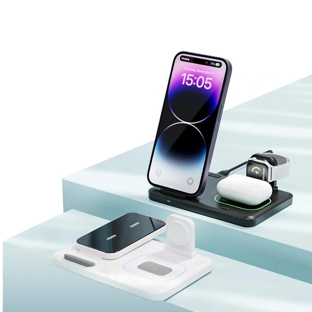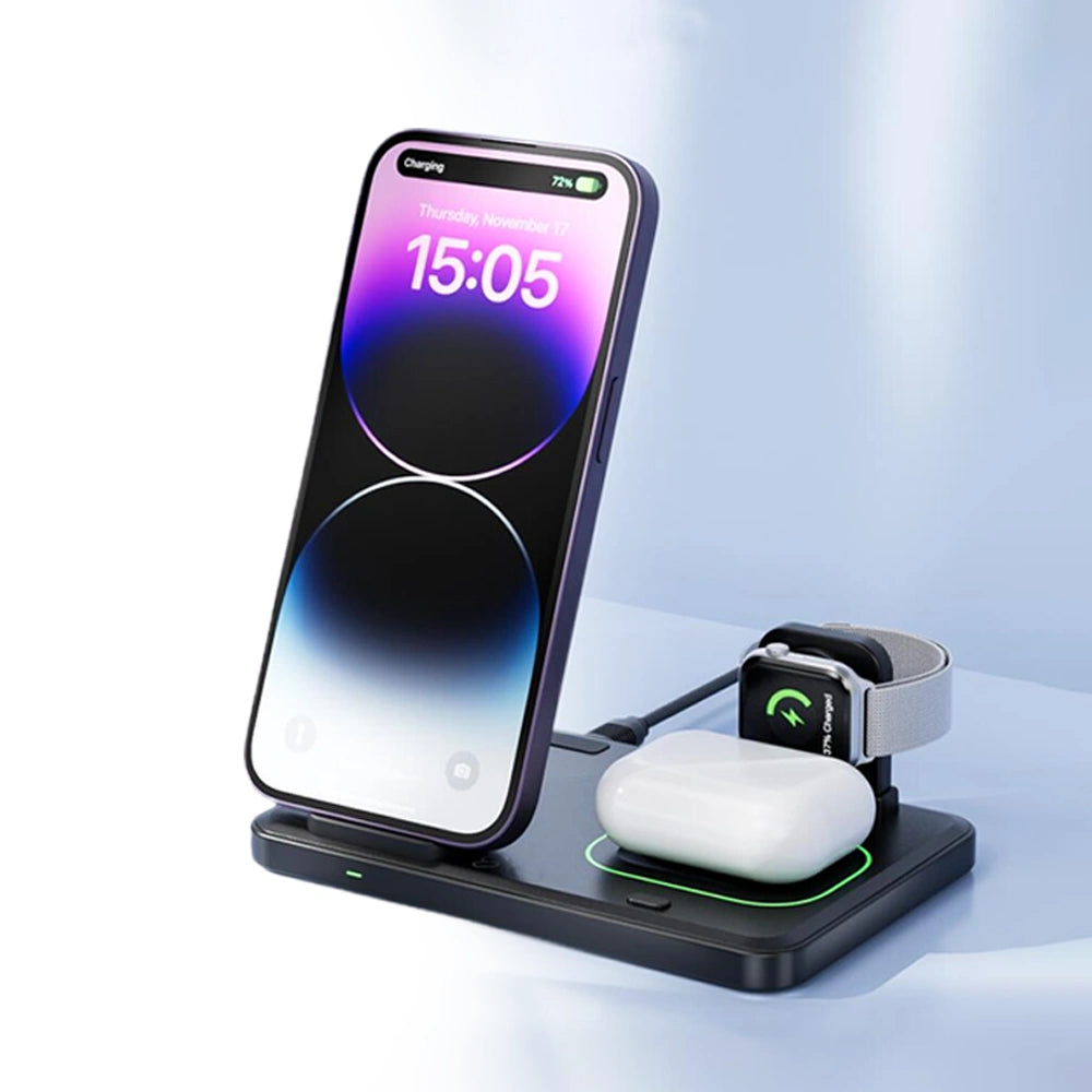 Transform your charging experience with the ChargeSymphony Trio's unique foldable design. Unleash the power of adaptability as this sleek charging stand effortlessly folds into a compact shape, making it the perfect companion for your on-the-go lifestyle.