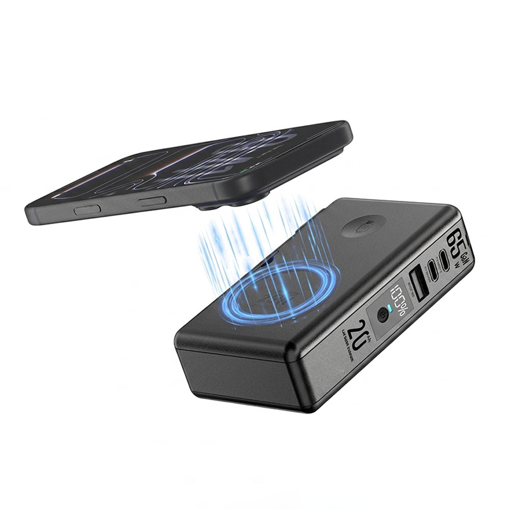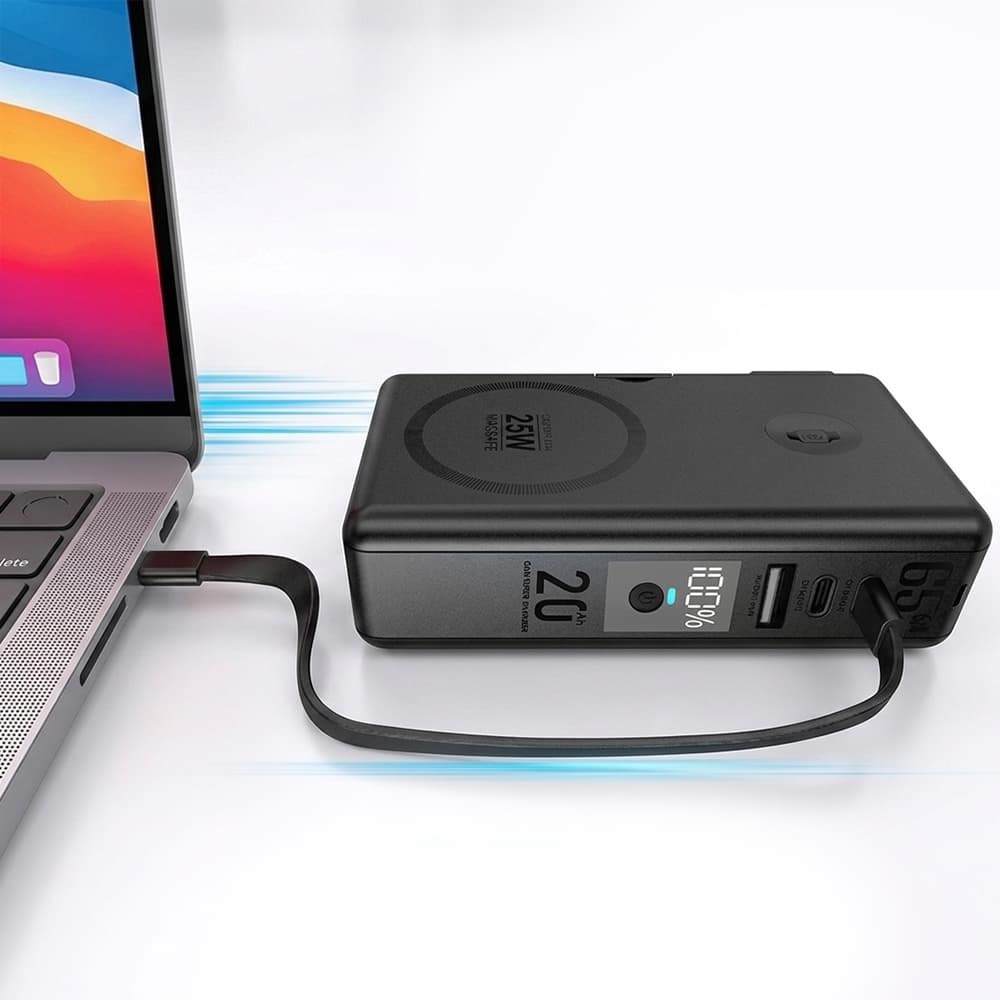 Never worry about running out of power with the JetVolt Qi 2 65W MagSafe Power Bank. Featuring a massive 20,000mAh solid-state battery, it keeps your phone, tablet, laptop, and accessories fully charged throughout the day. Its compact, travel-ready design combines a wall charger, power bank, and wireless charging station into a single, convenient device.