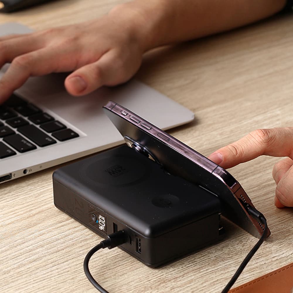 Snap your iPhone onto the built-in Qi2.2 magnetic charger for fast, secure wireless charging up to 25W. It works seamlessly with MagSafe-compatible cases and all modern Apple Watch models, making it ideal for charging on the go. Two high-speed USB-C ports deliver up to 65W of power, capable of charging USB-C phones, tablets, and even MacBook Air-class laptops at full speed. A USB-A port provides 10W output for smaller devices like earbuds or accessories, ensuring all your essentials stay powered.