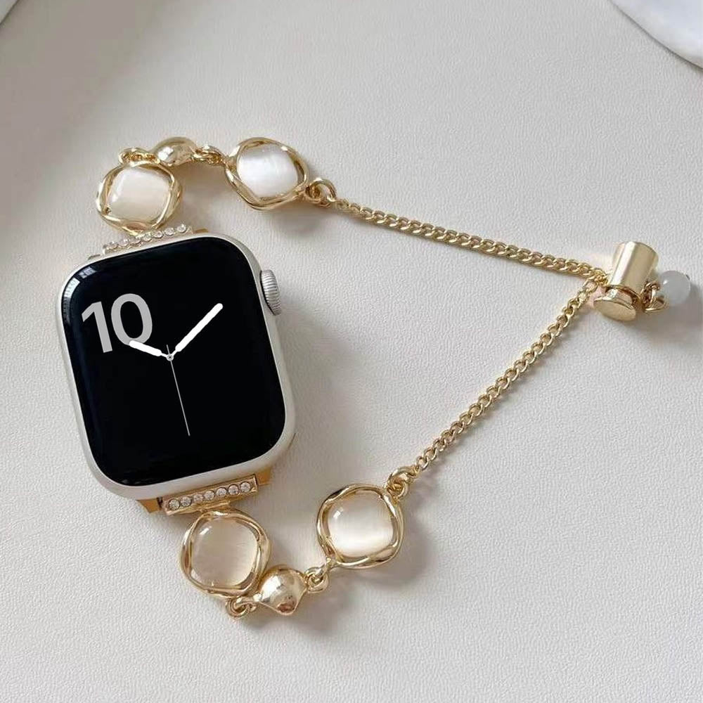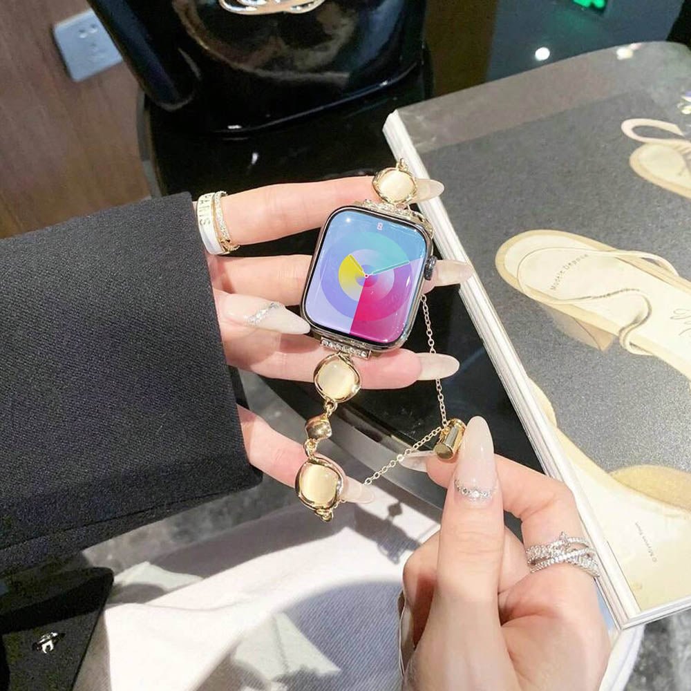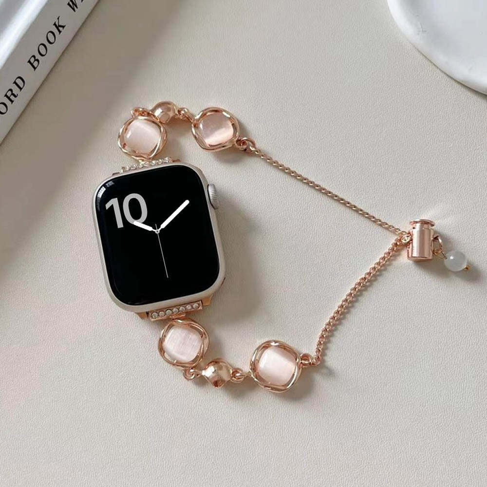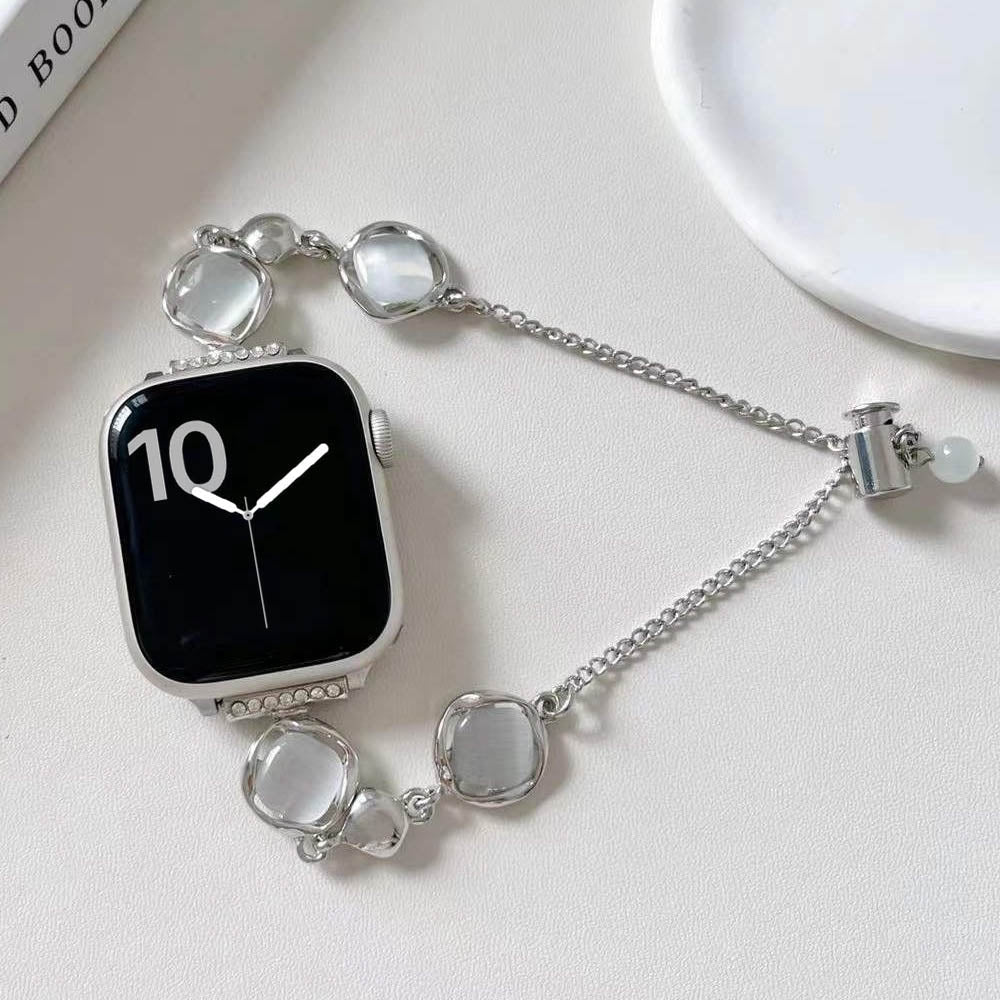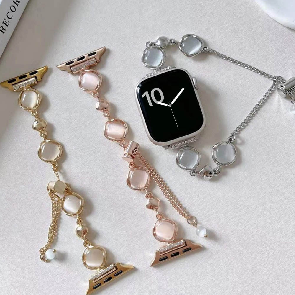 The CrystalCuff Apple Watch Band combine luxurious materials and sophisticated design, transforming your smartwatch into a stylish accessory. The stones reflect soft, subtle hues that complement the chic appearance of the bands. Each band is adorned with a decorative chain detail, adding a touch of elegance. This makes it ideal for those looking to elevate their smartwatch for special occasions or daily wear while securely attaching to the smartwatch.