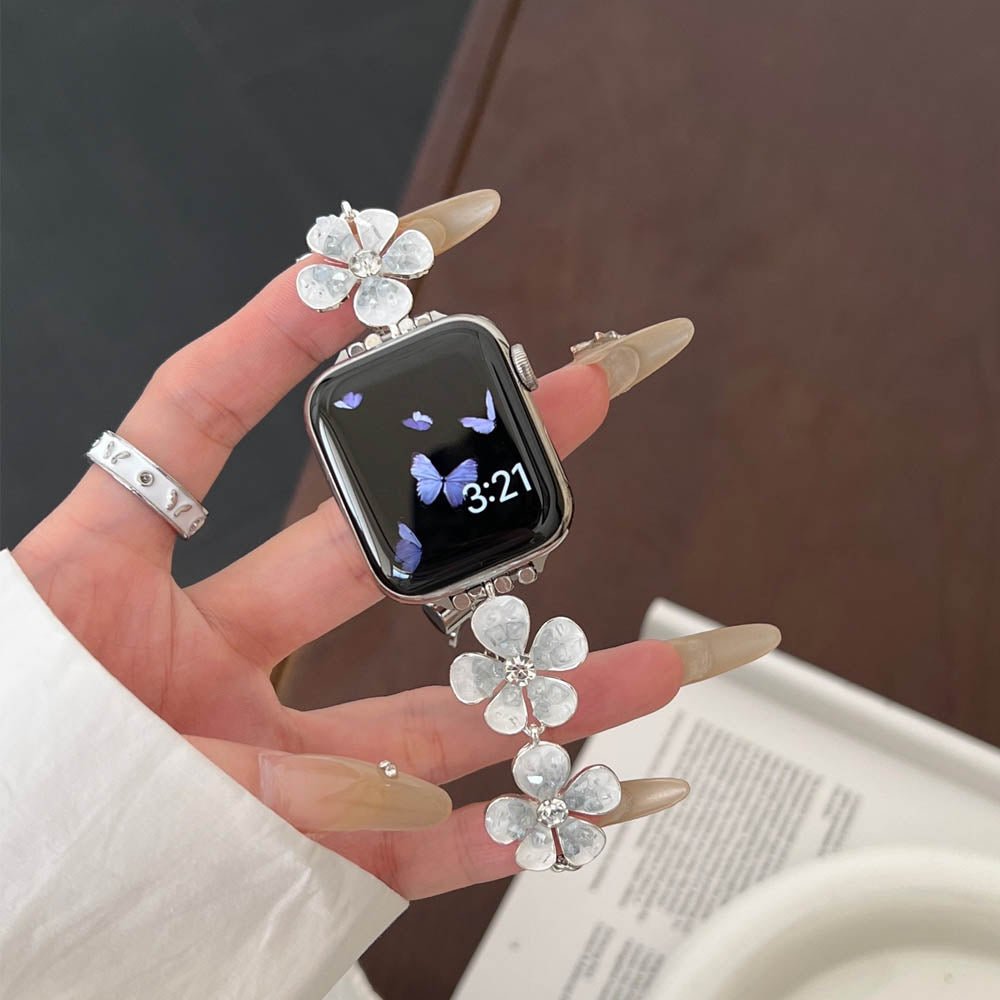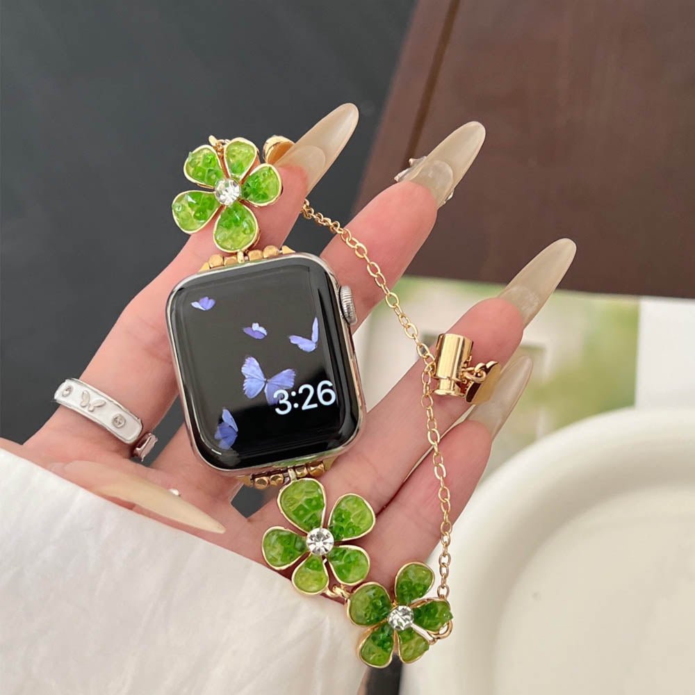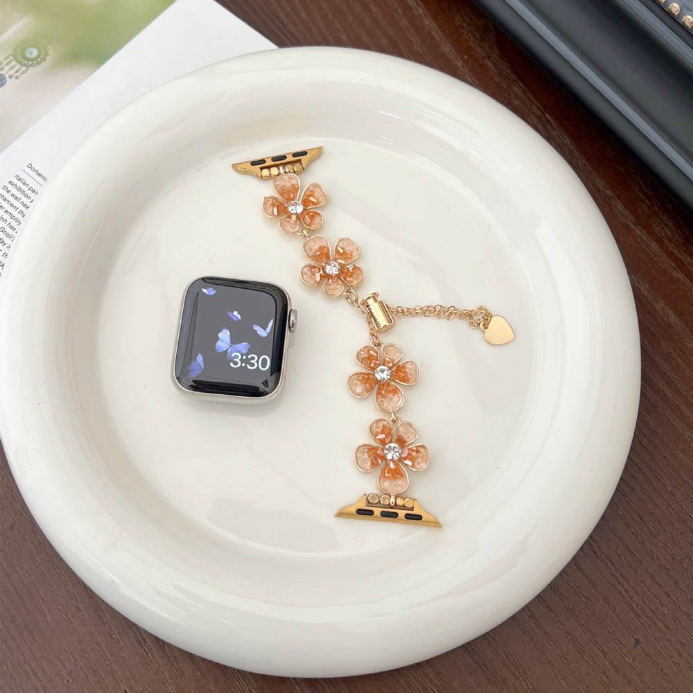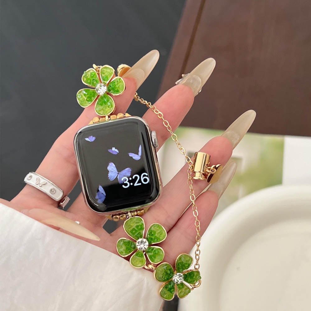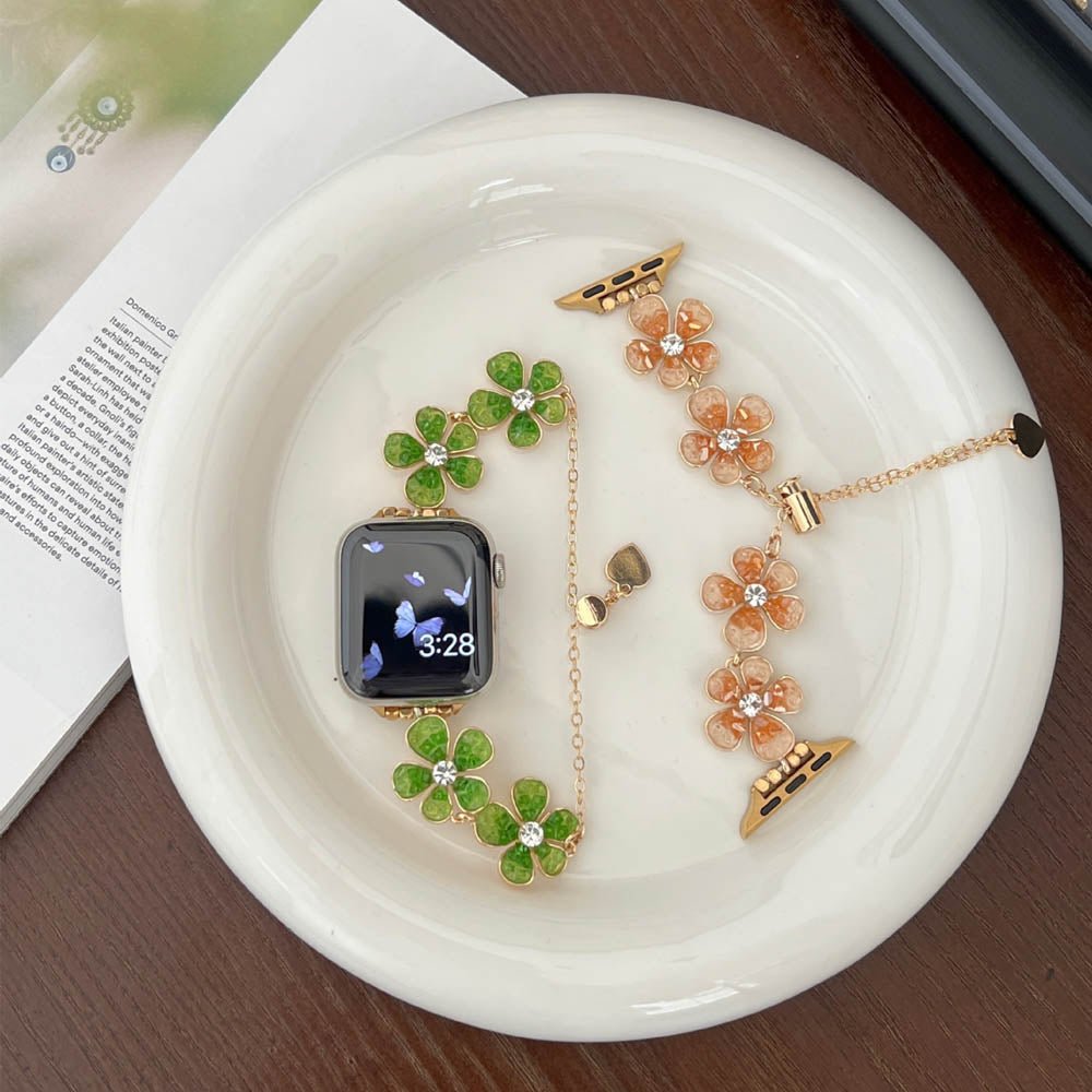 The FloraBella Apple Watch Strap is an enchanting accessory designed to bring a touch of elegance to your smartwatch. With its vibrant floral design, this Apple Watch strap is a standout piece that exudes charm and sophistication. The flowers are crafted from glossy, translucent materials with a striking gemstone center, creating a delicate yet bold visual impact. This strap is ideal for those looking to make a fashion statement with their smartwatch while maintaining comfort and durability. The stainless steel construction ensures longevity, while the lightweight design offers comfortable wear throughout the day. This captivating floral design is the ideal blend of fashion and function, making it a perfect choice for both casual and formal wear.