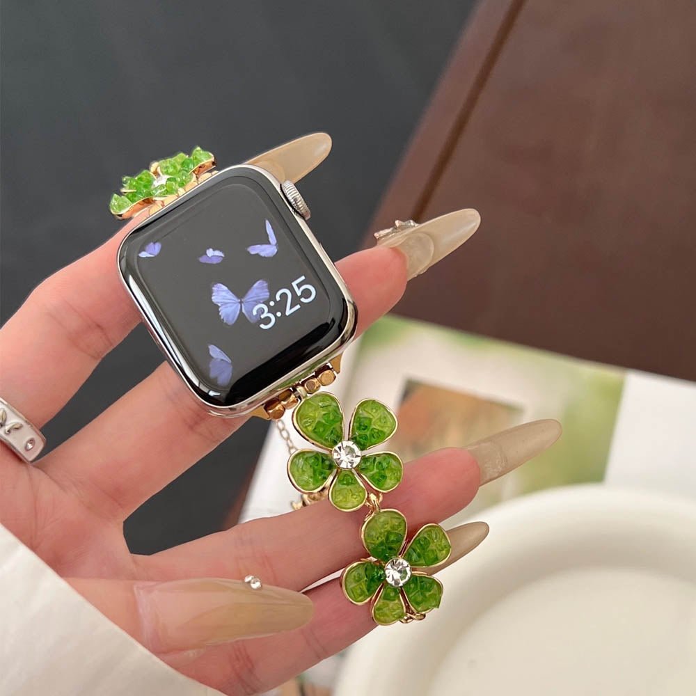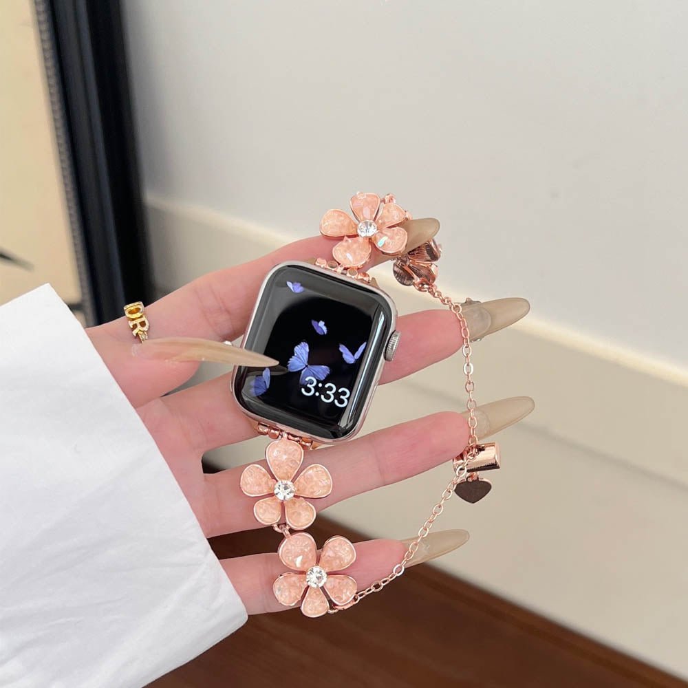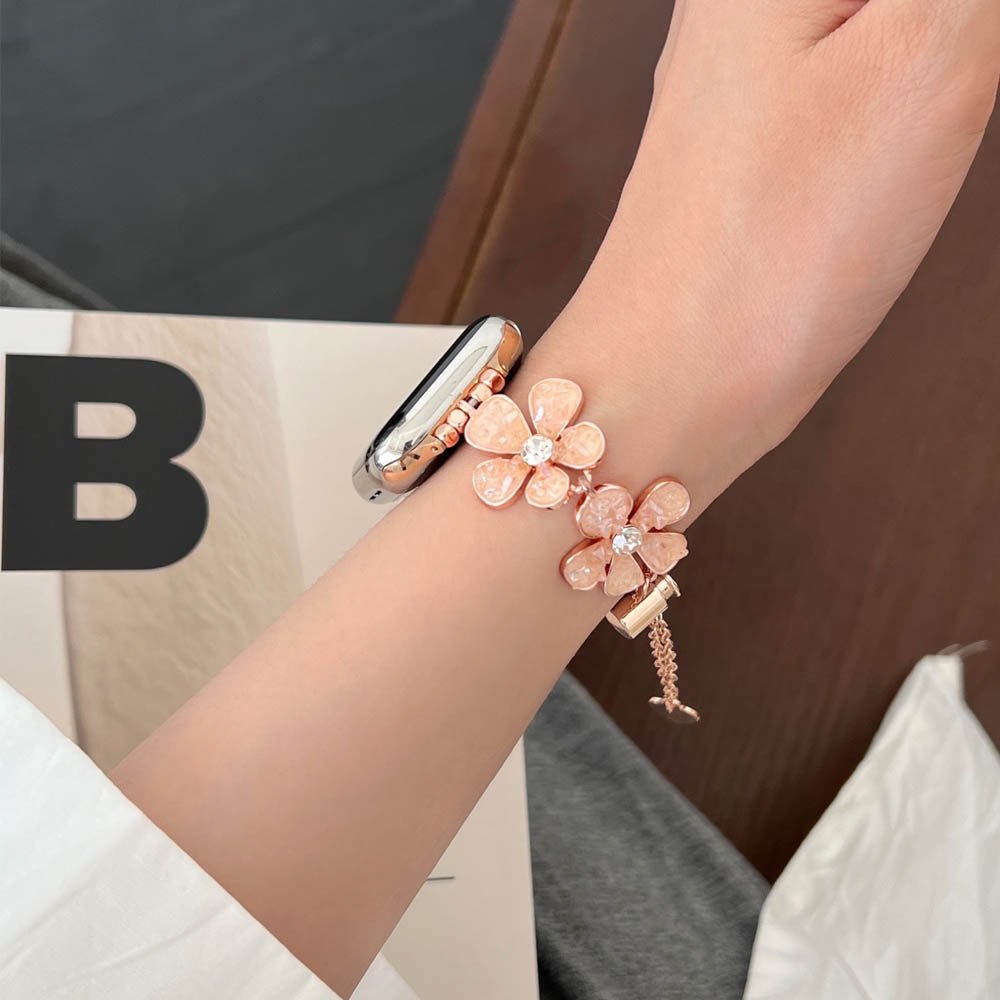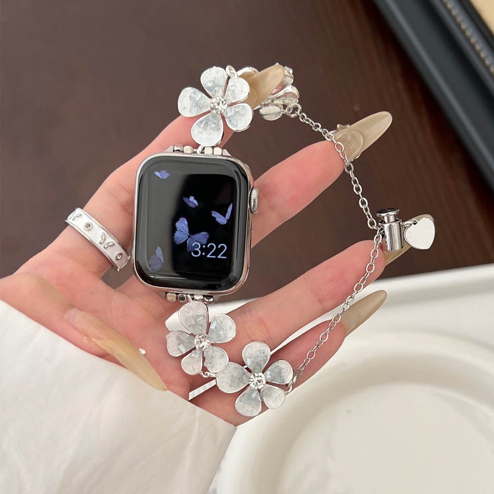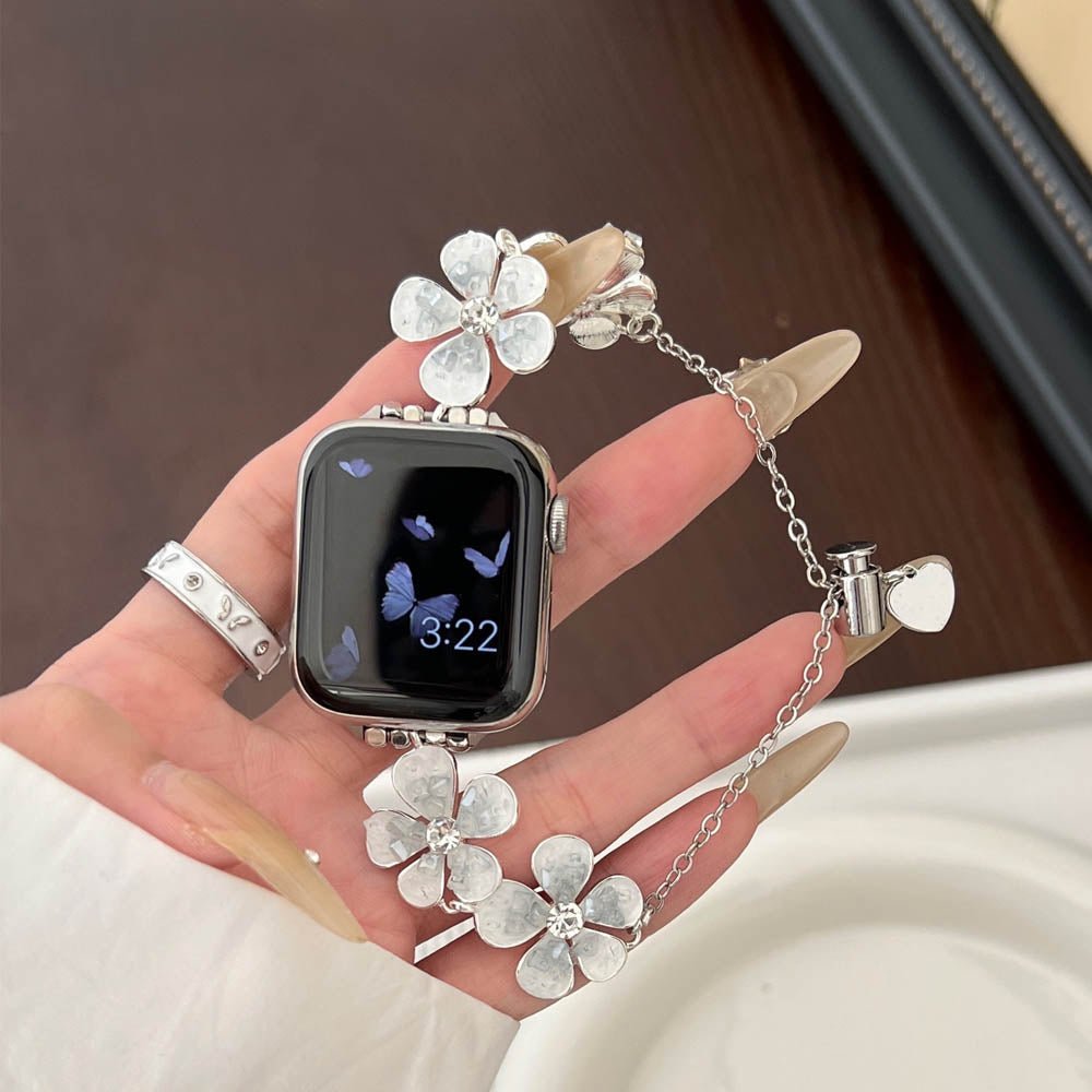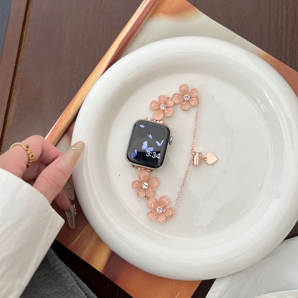 The FloraBella Apple Watch Strap is an enchanting accessory designed to bring a touch of elegance to your smartwatch. With its vibrant floral design, this Apple Watch strap is a standout piece that exudes charm and sophistication. The flowers are crafted from glossy, translucent materials with a striking gemstone center, creating a delicate yet bold visual impact. This strap is ideal for those looking to make a fashion statement with their smartwatch while maintaining comfort and durability. The stainless steel construction ensures longevity, while the lightweight design offers comfortable wear throughout the day. This captivating floral design is the ideal blend of fashion and function, making it a perfect choice for both casual and formal wear.