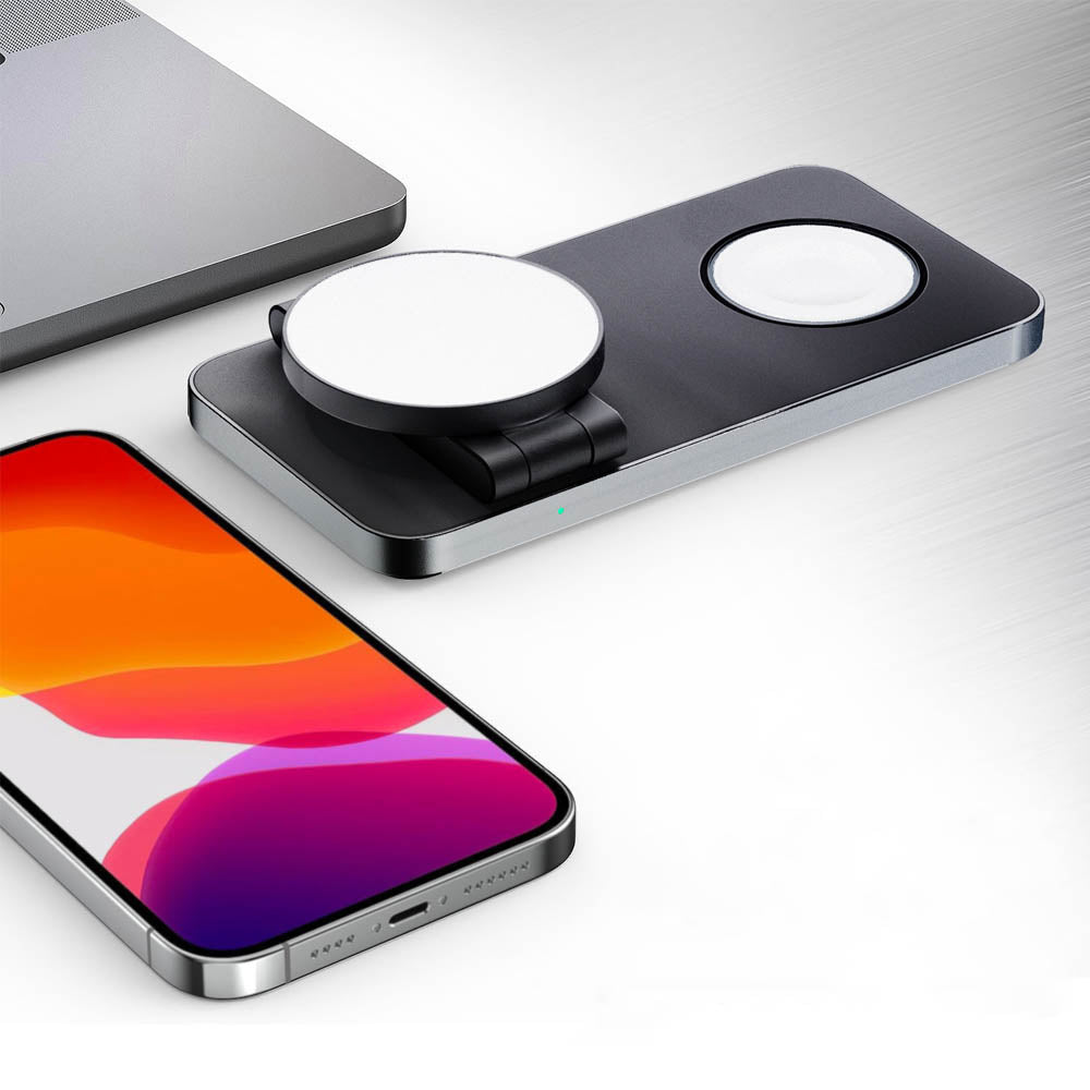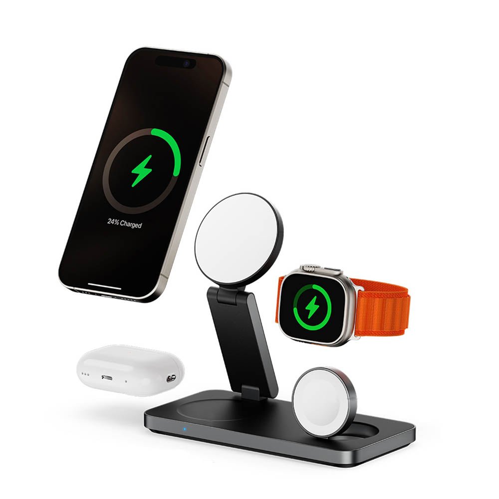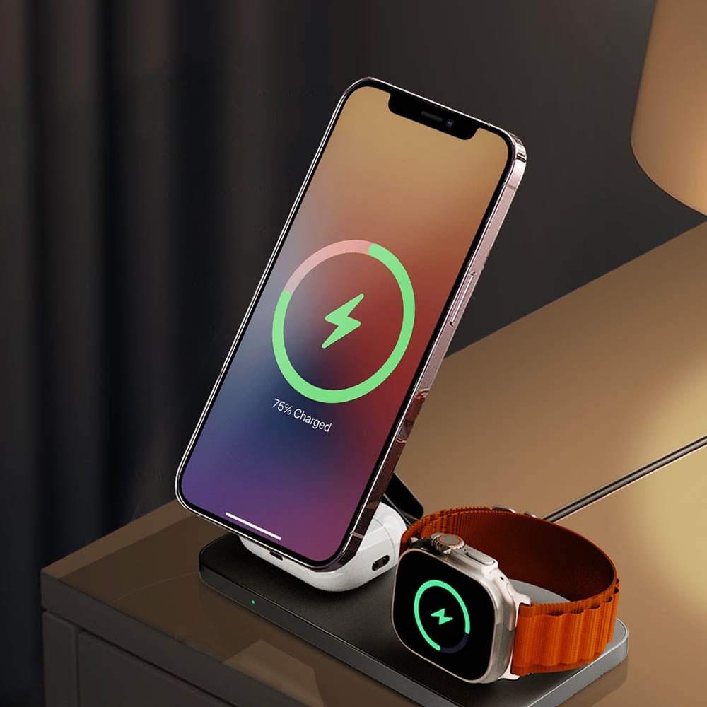 Multi-Device Charging: Charges multiple devices (iPhone, AirPods, and Apple Watch) simultaneously with a strong magnetic attraction.