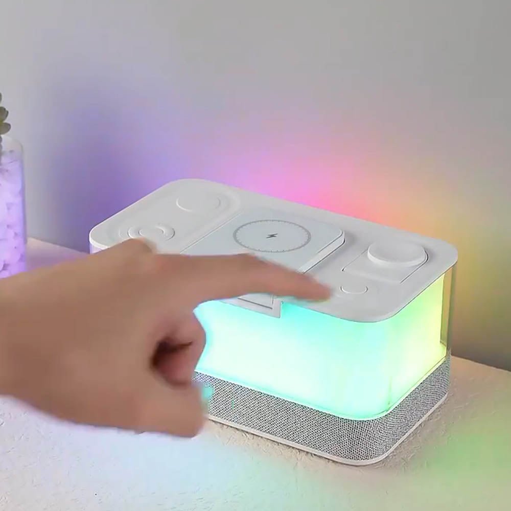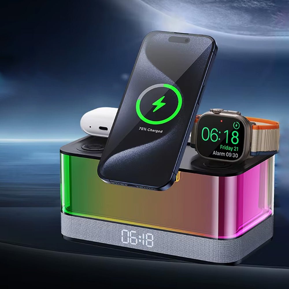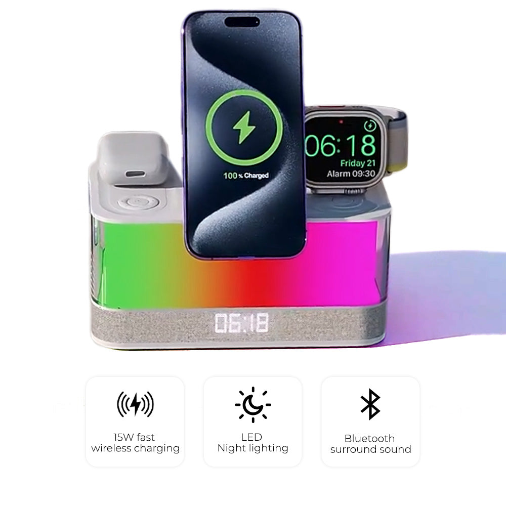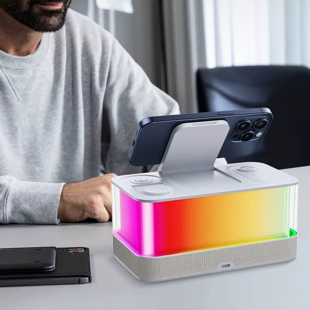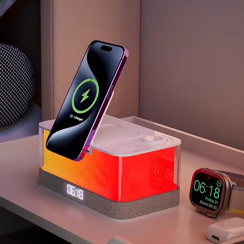 The Audilume 3-in-1 MagSafe Charger delivers 15W fast wireless charging, immersive Bluetooth surround sound, and adjustable LED lighting—all in a sleek, compact design that transforms your space.