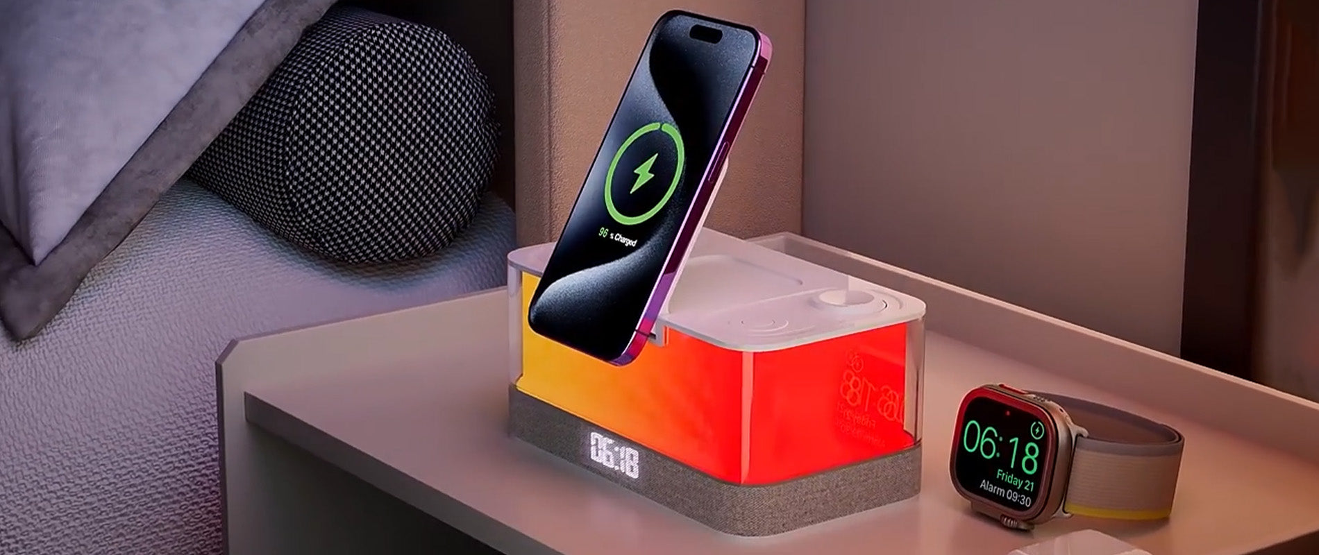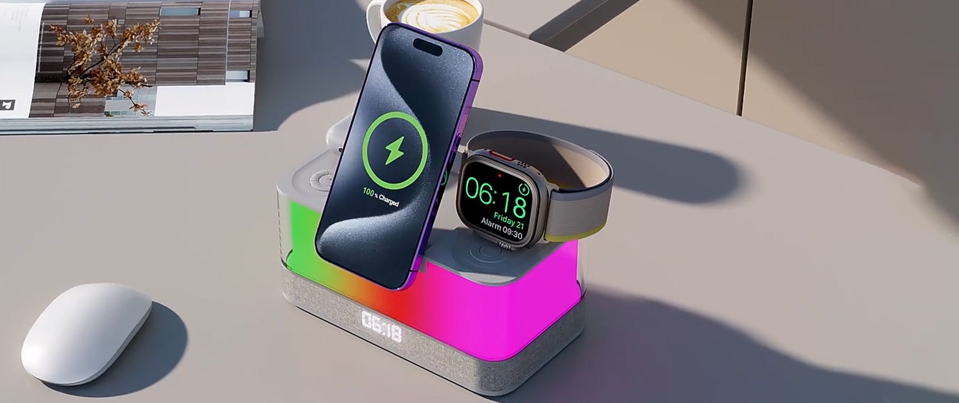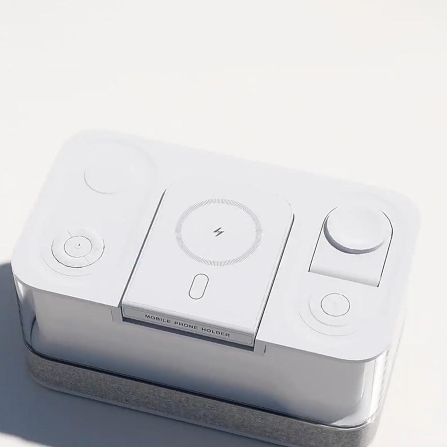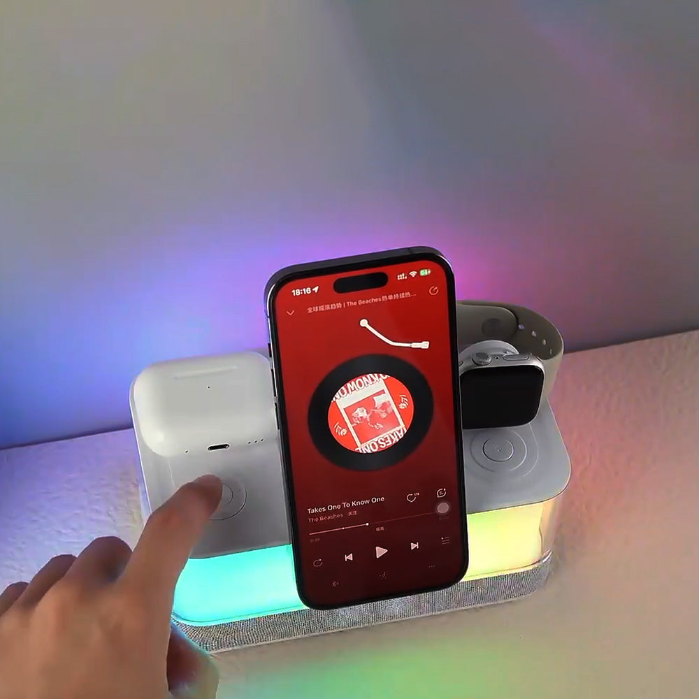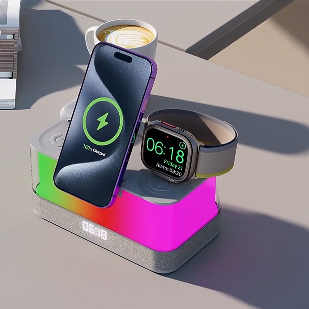 The Audilume 3-in-1 MagSafe Charger delivers 15W fast wireless charging, immersive Bluetooth surround sound, and adjustable LED lighting—all in a sleek, compact design that transforms your space.