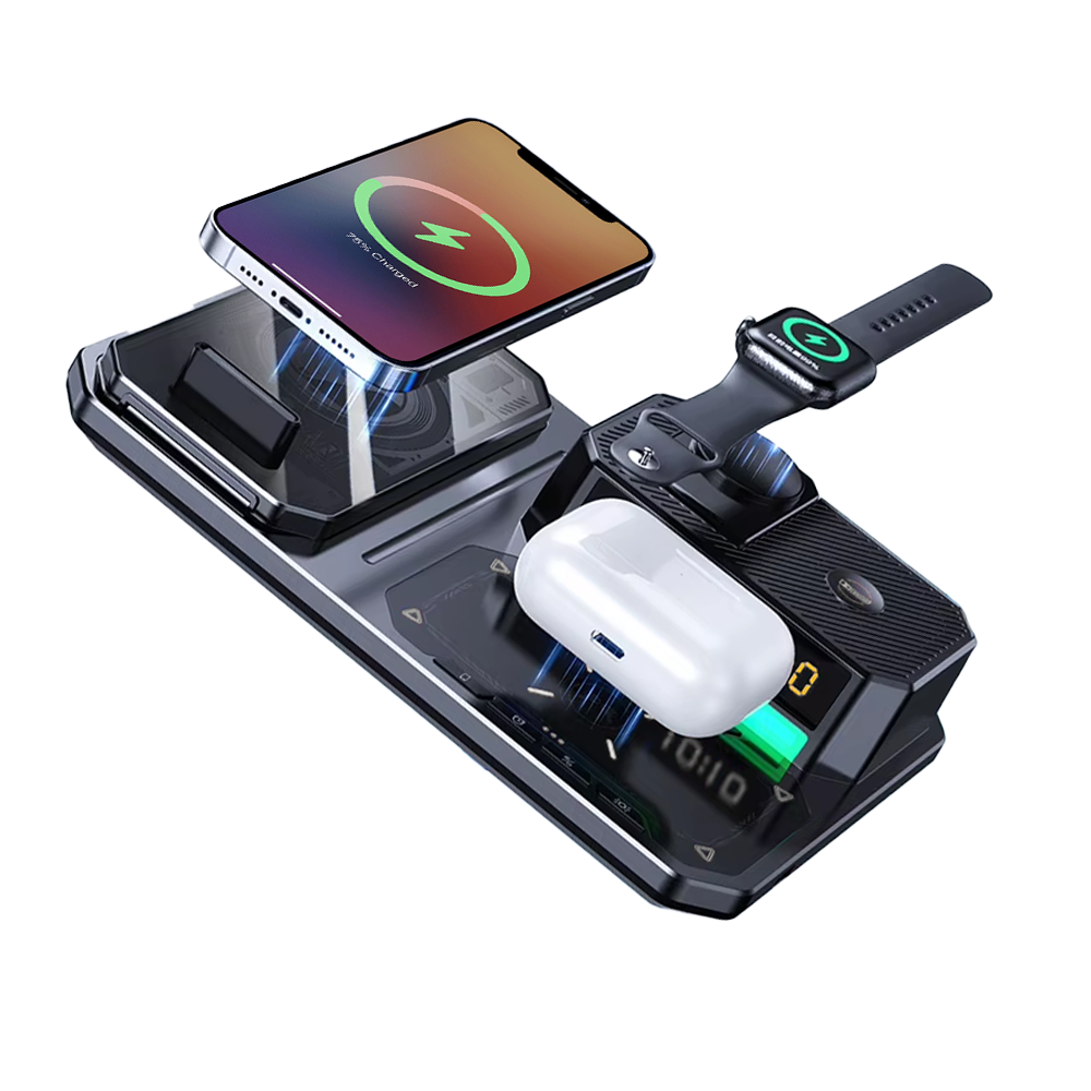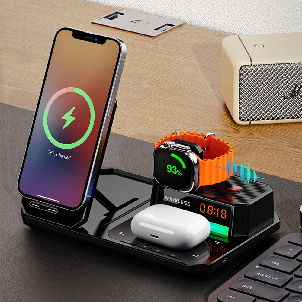 Experience premium audio with deep bass and crystal-clear sound, perfect for enjoying music, taking calls, or enhancing your daily routine—all integrated into one stylish charging station.