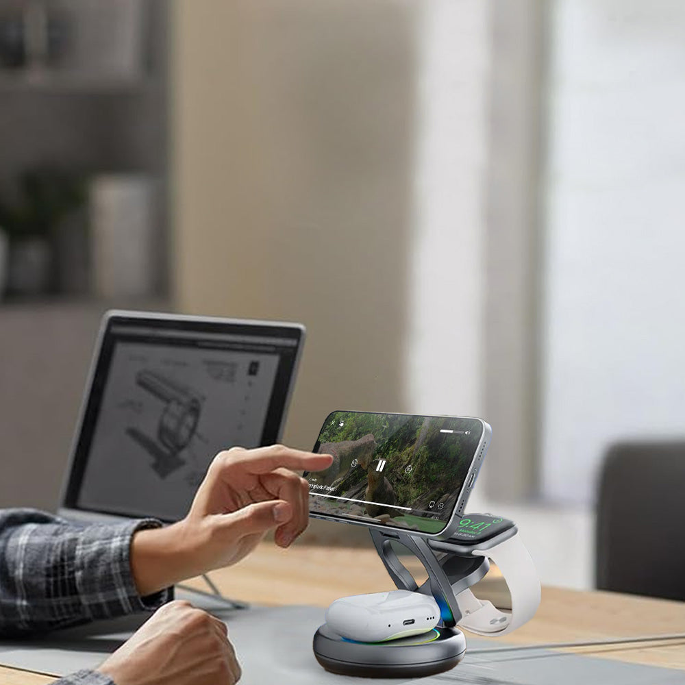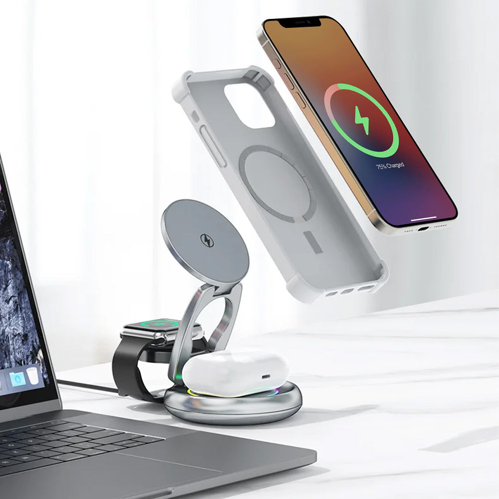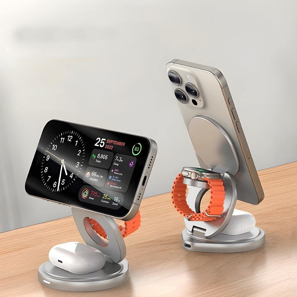• The MagiSpin Trio Foldable 3-in-1 MagSafe Charger is the ultimate all-in-one charging station. It supports both horizontal and vertical viewing for your phone, perfect for entertainment while it powers up. The built-in colorful dynamic lighting indicates charging status and adds a modern ambiance. Designed with a sleek, foldable zinc alloy body and a 360° rotating base, it features a strong magnetic connection that holds securely, even with a phone case on. It effortlessly charges your phone, watch, and headphones simultaneously at up to 15W. It's the perfect solution for a stylish, clutter-free, and versatile charging experience.