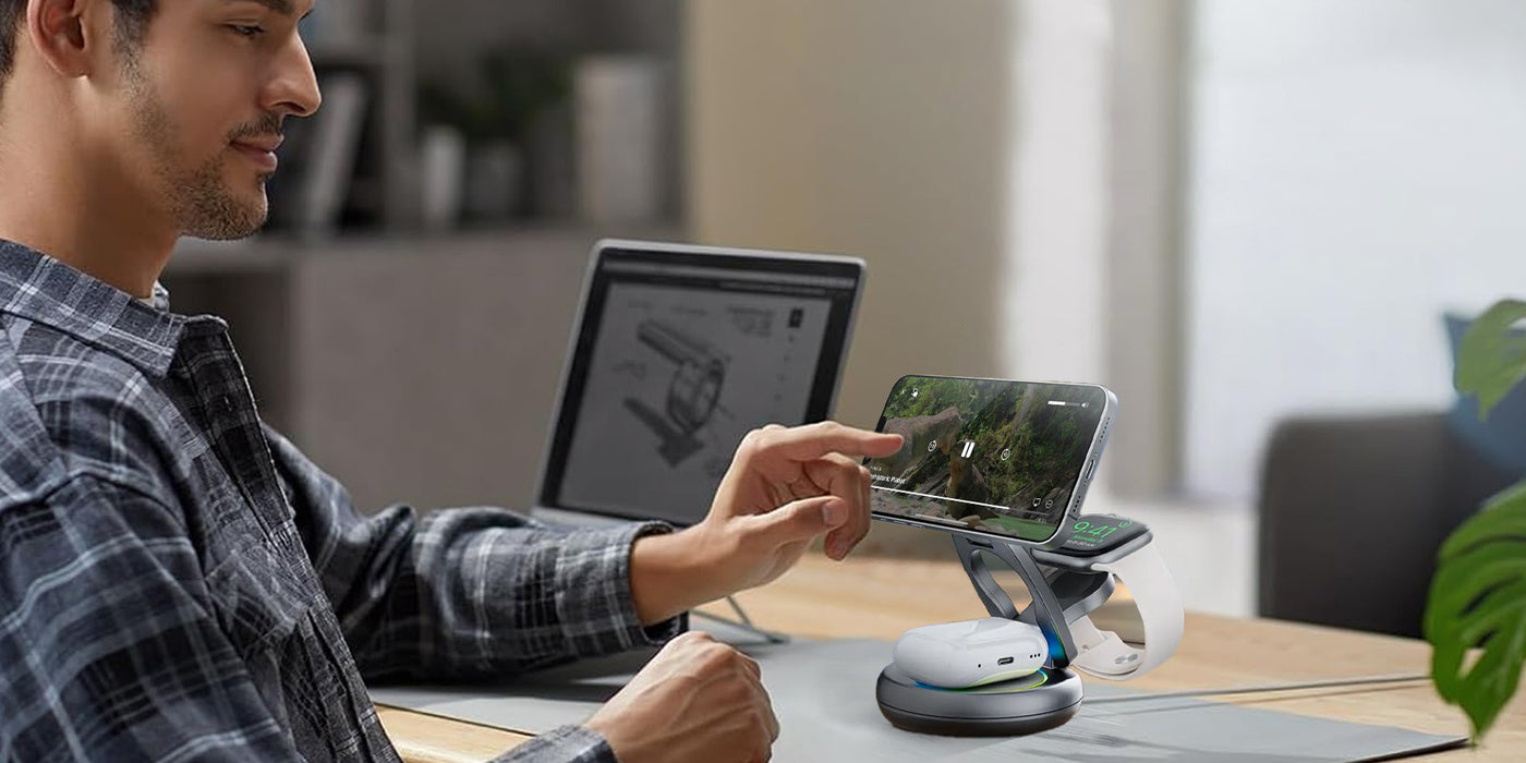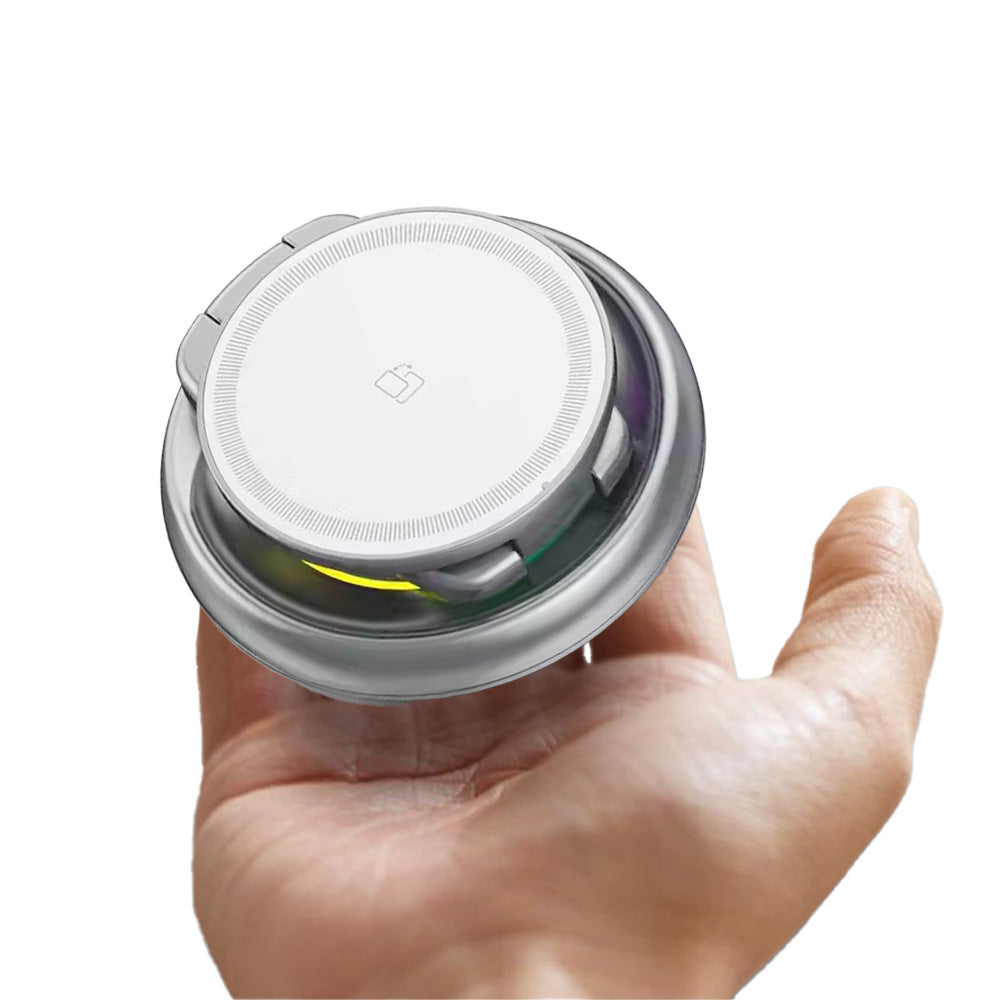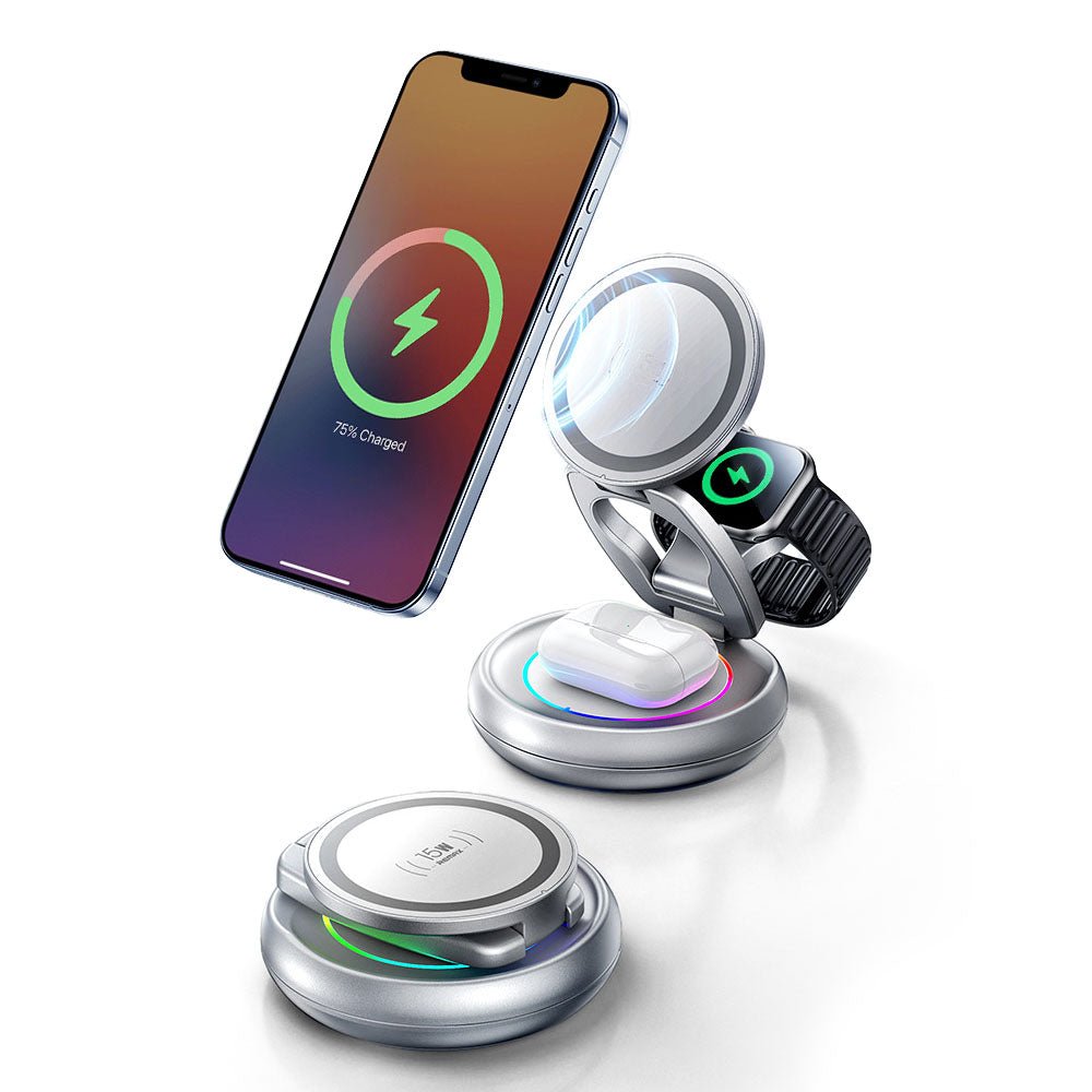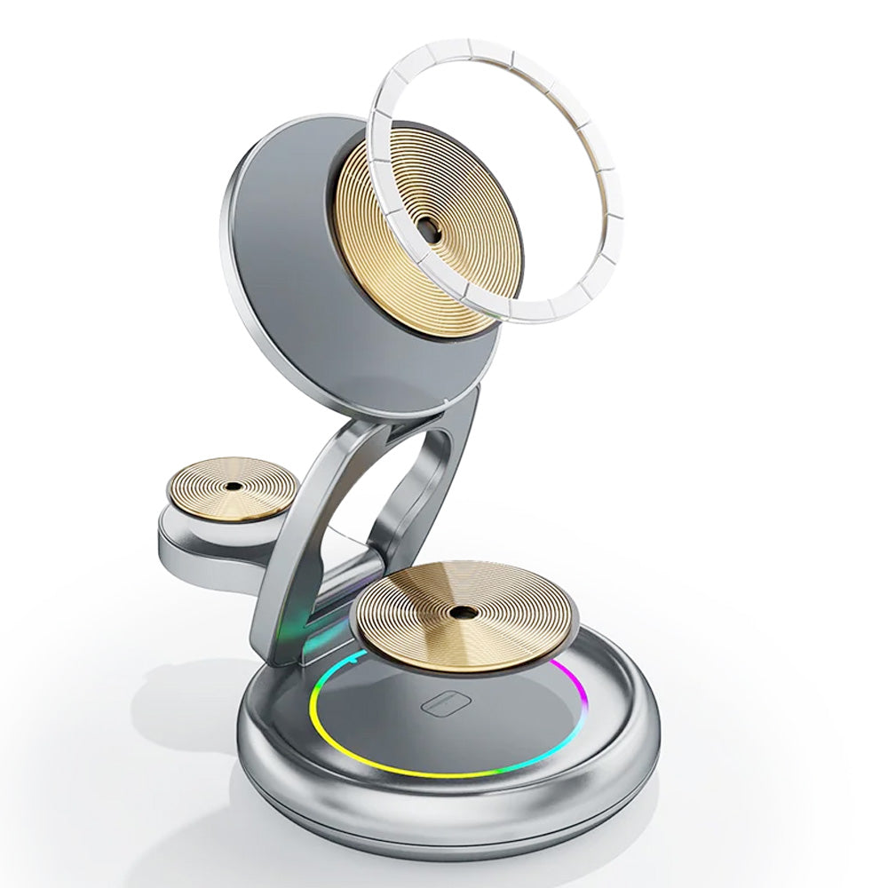 • The MagiSpin Trio Foldable 3-in-1 MagSafe Charger is the ultimate all-in-one charging station. It supports both horizontal and vertical viewing for your phone, perfect for entertainment while it powers up. The built-in colorful dynamic lighting indicates charging status and adds a modern ambiance. Designed with a sleek, foldable zinc alloy body and a 360° rotating base, it features a strong magnetic connection that holds securely, even with a phone case on. It effortlessly charges your phone, watch, and headphones simultaneously at up to 15W. It's the perfect solution for a stylish, clutter-free, and versatile charging experience.