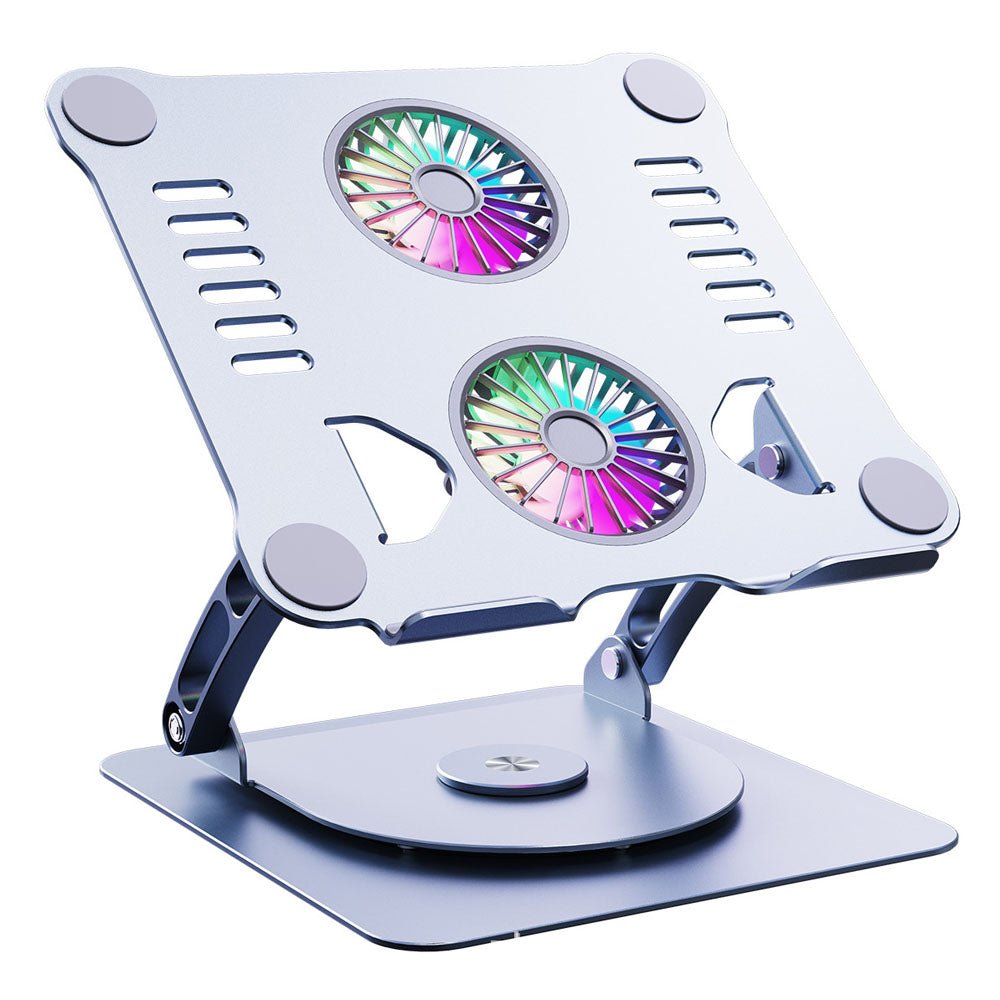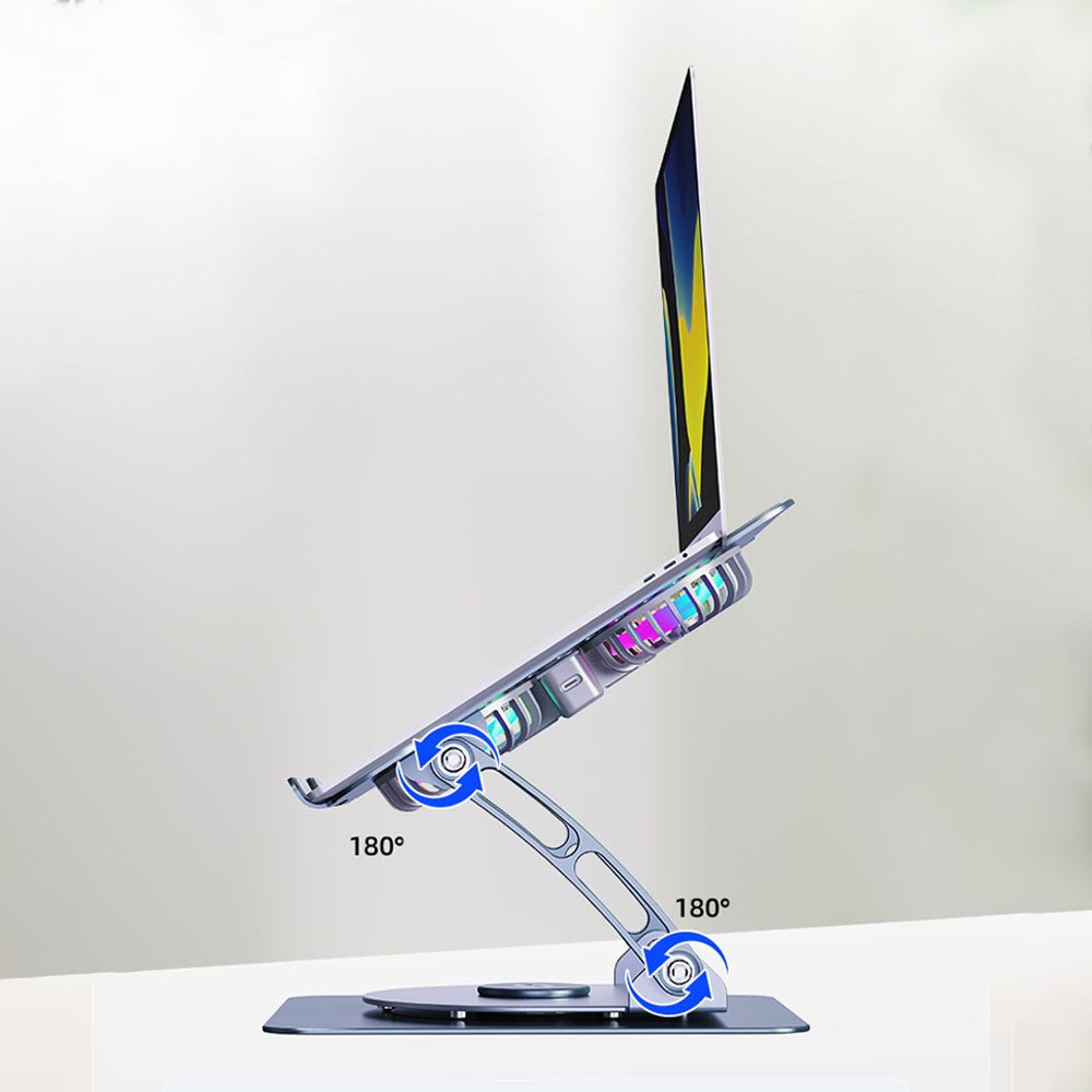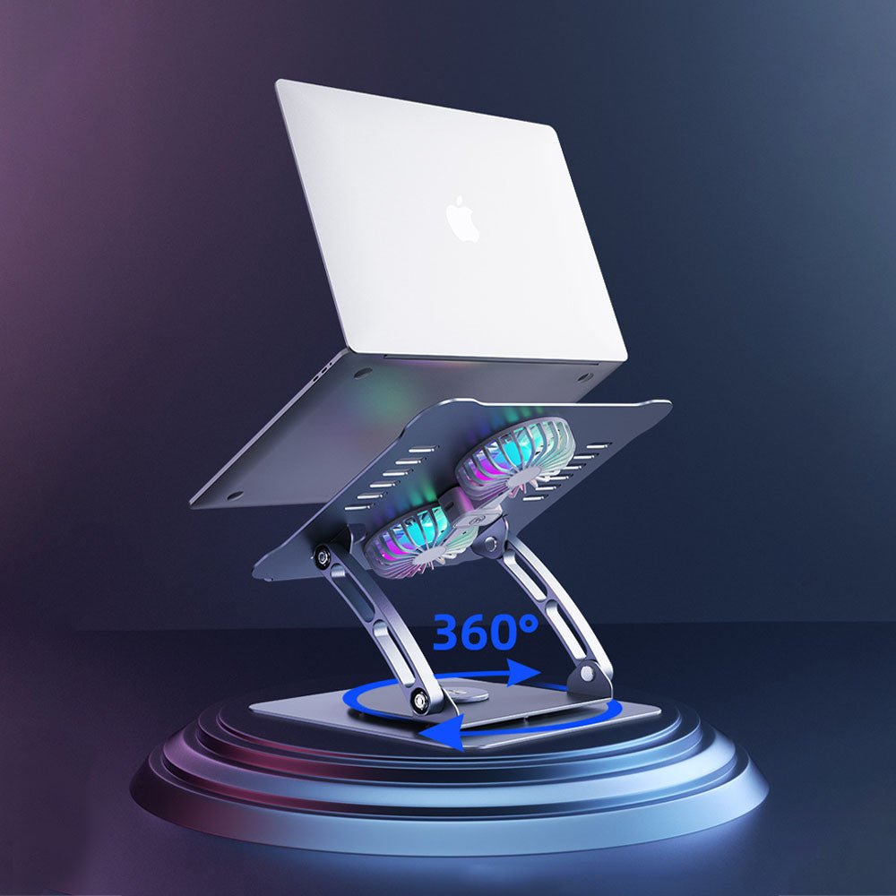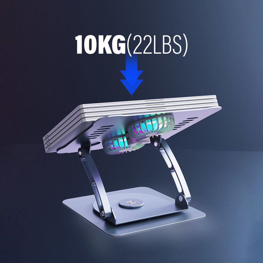 The SpinChill Pro Foldable Laptop Stand is a versatile tool that supports laptops and tablets up to 16 inches and can hold devices weighing up to 10 kg(22lbs). It features smooth 360° rotation, allowing you to easily adjust your screen to any angle. Made from durable aluminum, it ensures your device stays stable and cool with built-in cooling fans. The stand includes soft silicone pads to protect against scratches and slipping. You can effortlessly adjust the height and angle to find your perfect ergonomic position. Plus, it’s foldable for easy storage and portability, making it a great companion for work or play.