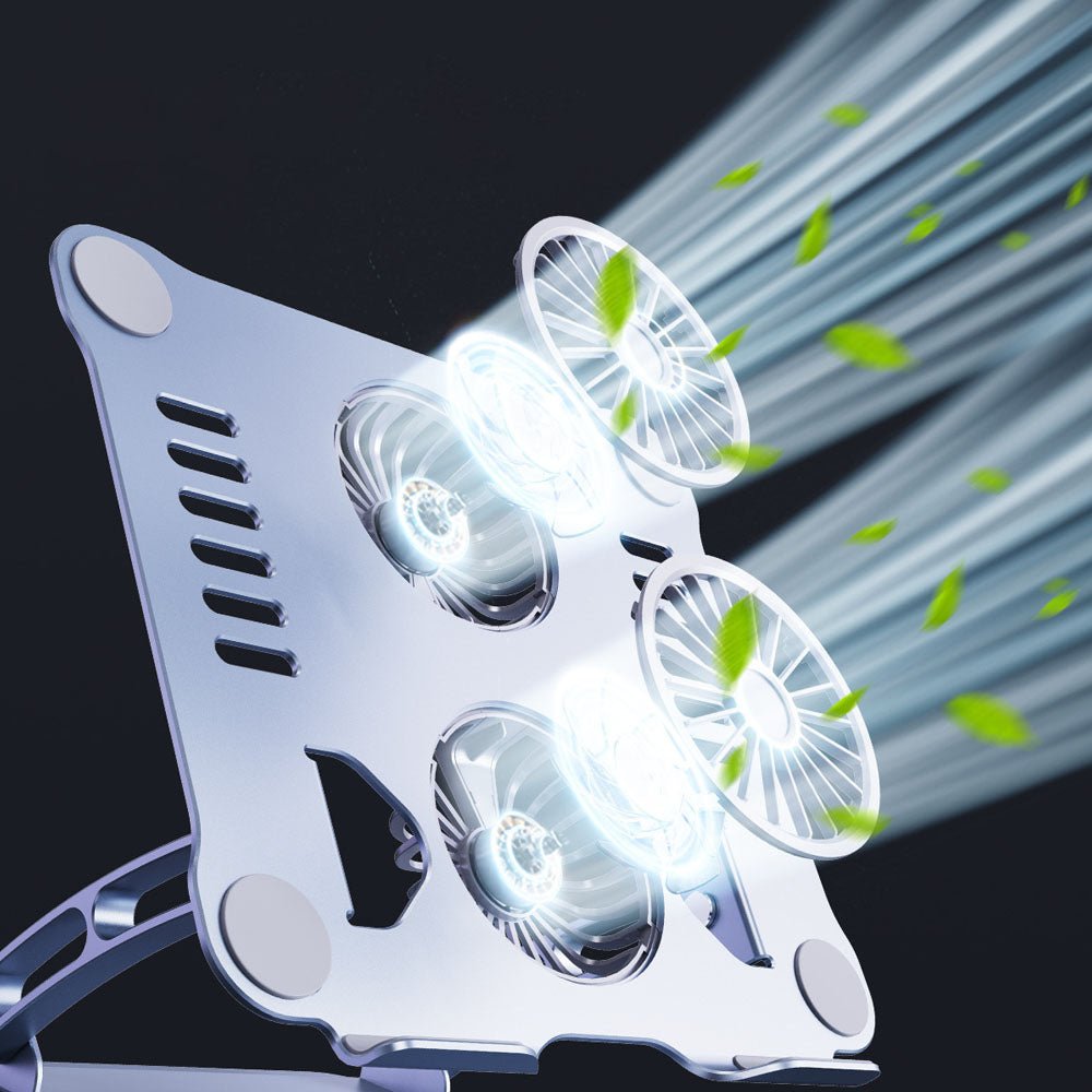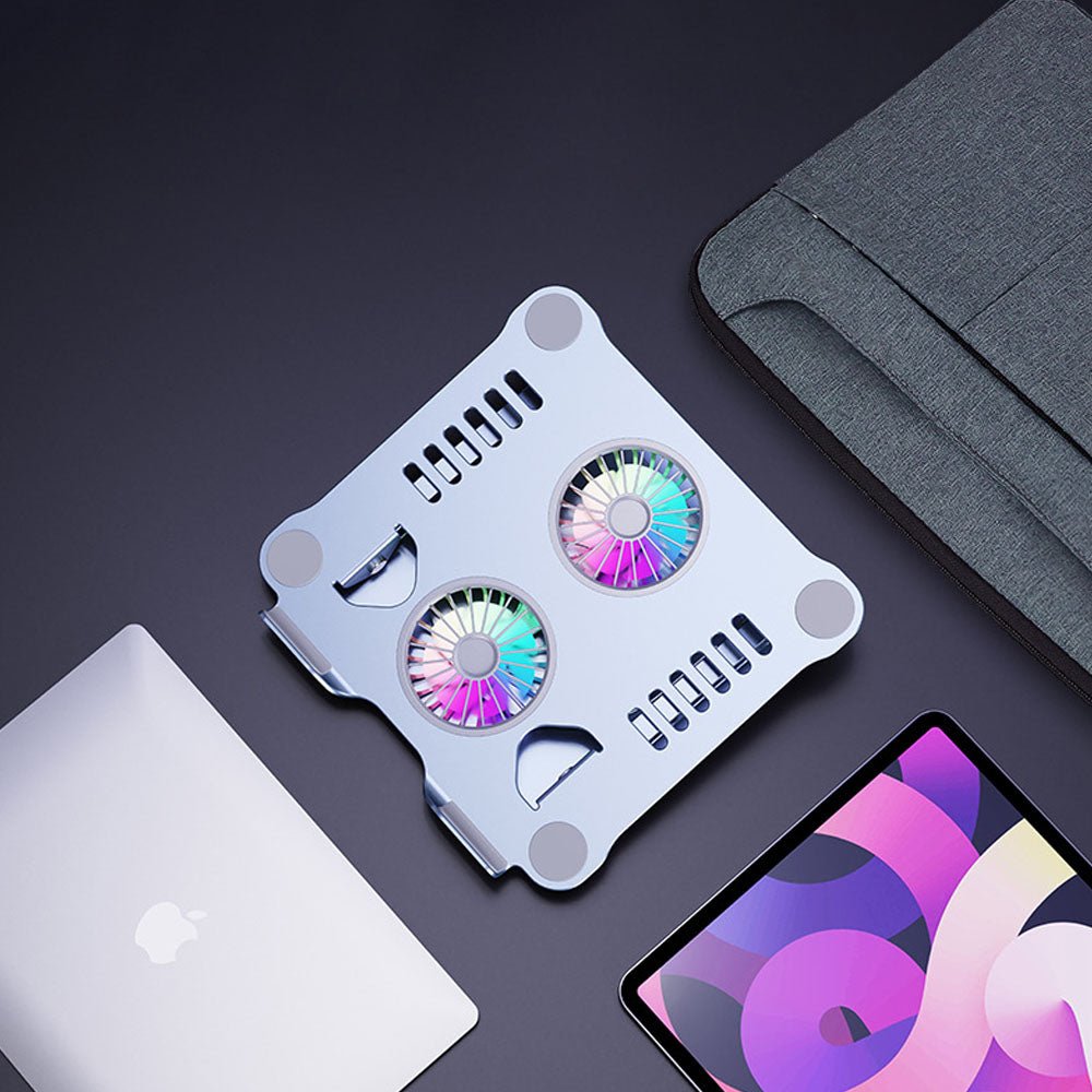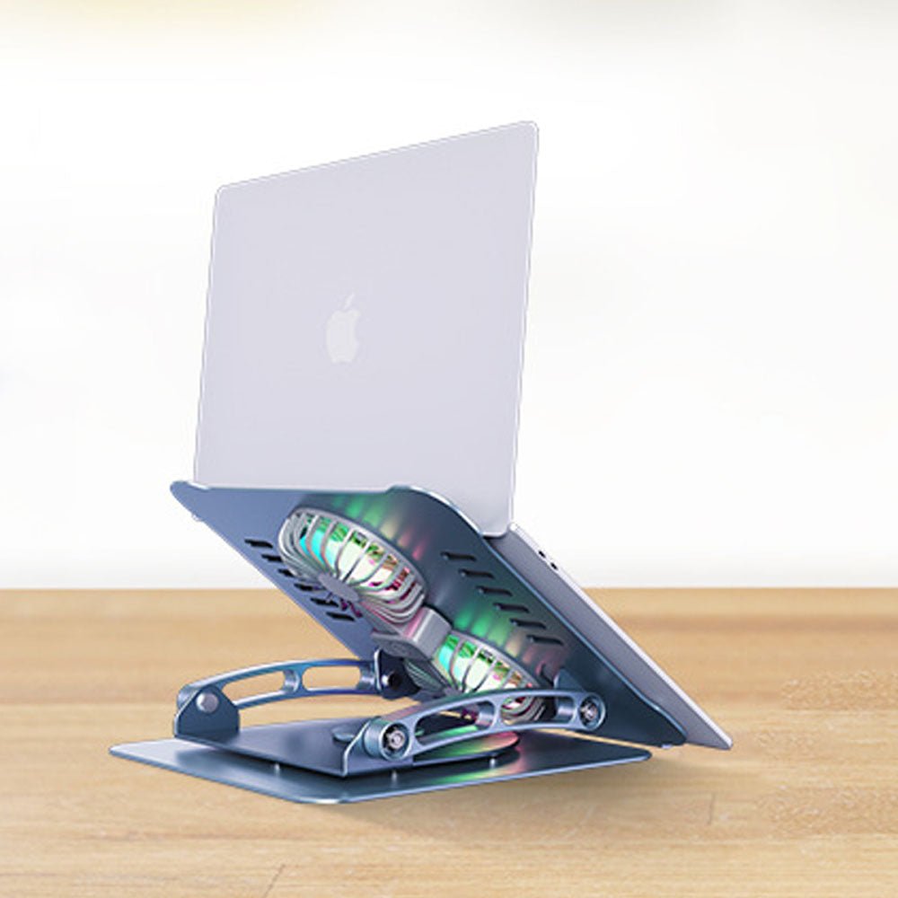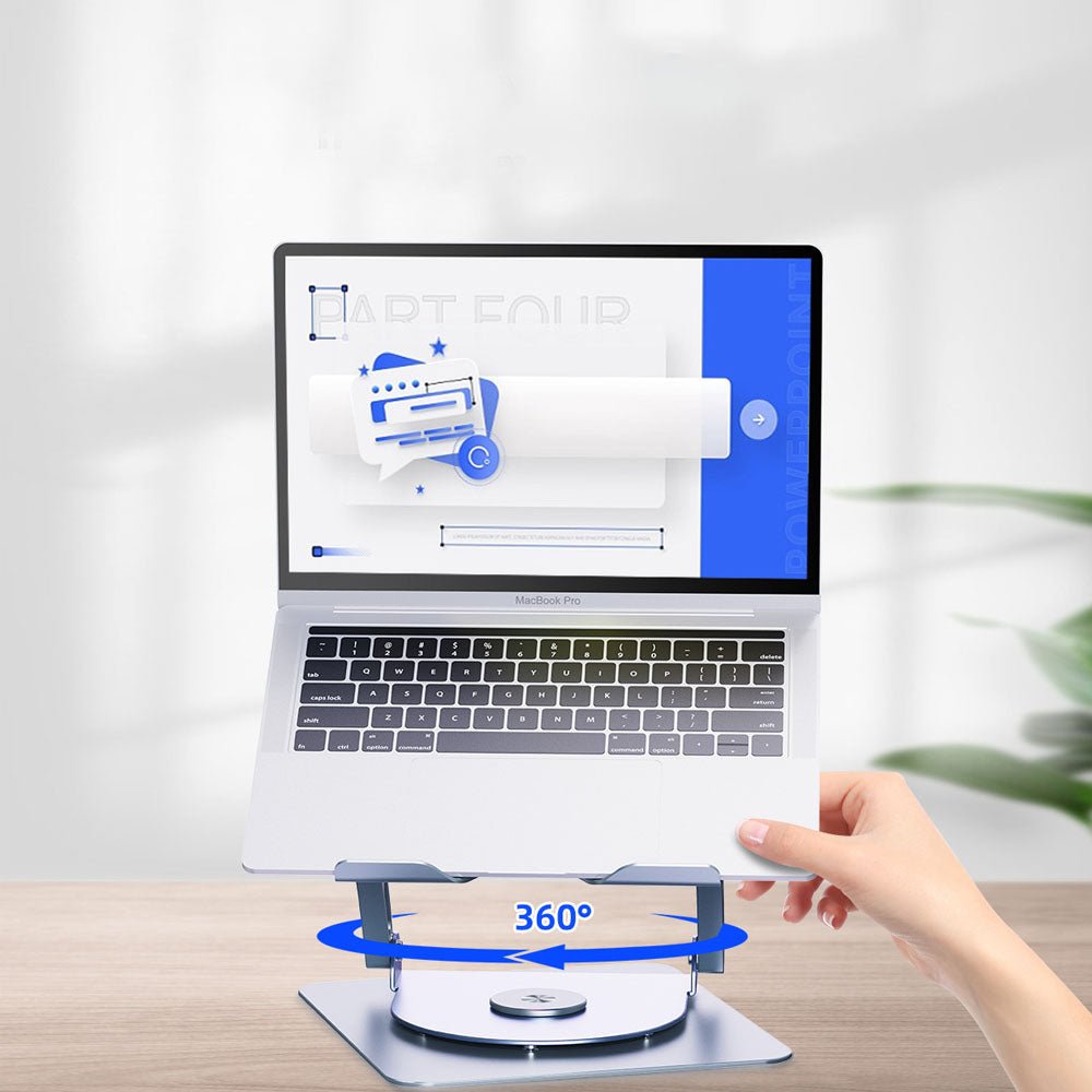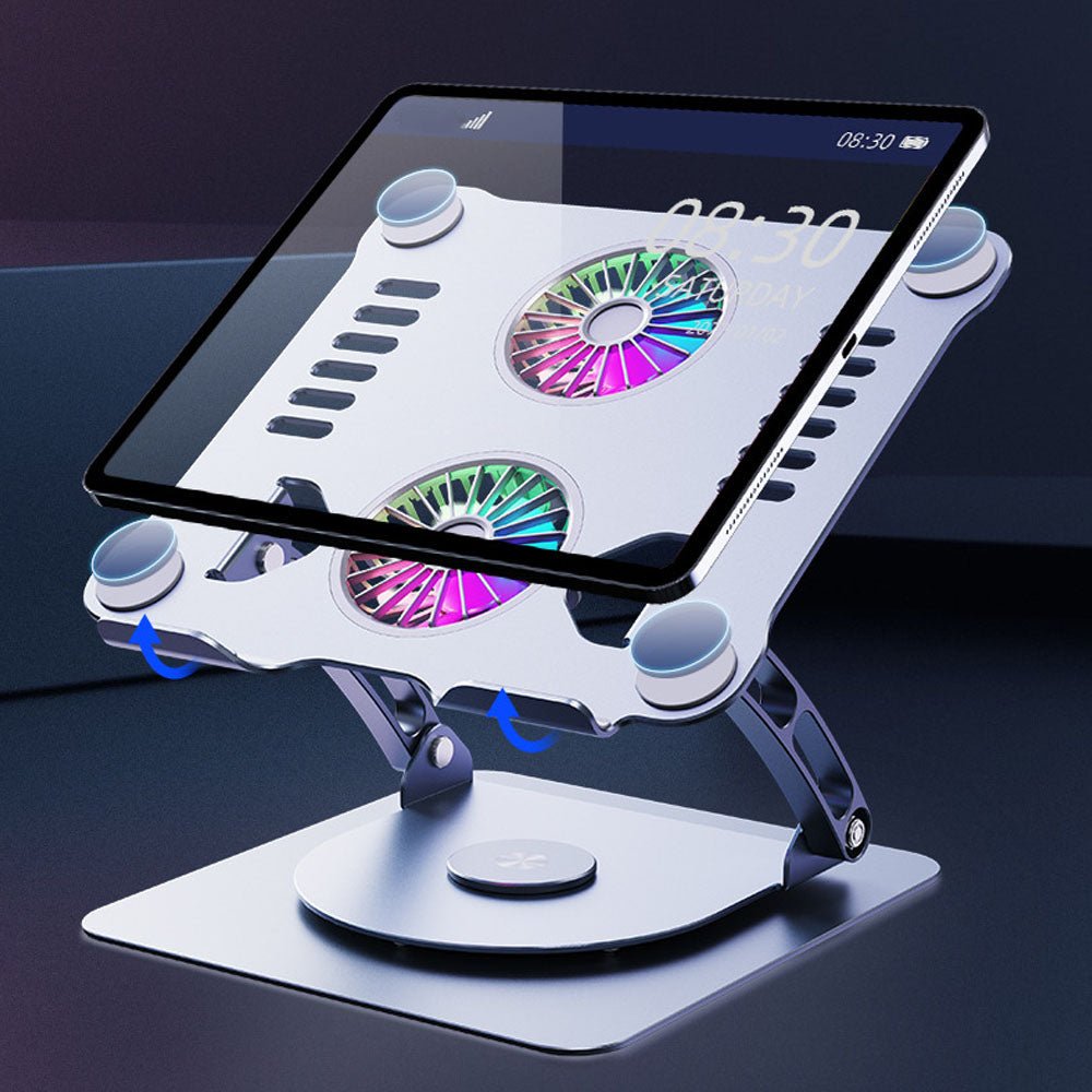 The SpinChill Pro Foldable Laptop Stand is a versatile tool that supports laptops and tablets up to 16 inches and can hold devices weighing up to 10 kg(22lbs). It features smooth 360° rotation, allowing you to easily adjust your screen to any angle. Made from durable aluminum, it ensures your device stays stable and cool with built-in cooling fans. The stand includes soft silicone pads to protect against scratches and slipping. You can effortlessly adjust the height and angle to find your perfect ergonomic position. Plus, it’s foldable for easy storage and portability, making it a great companion for work or play.