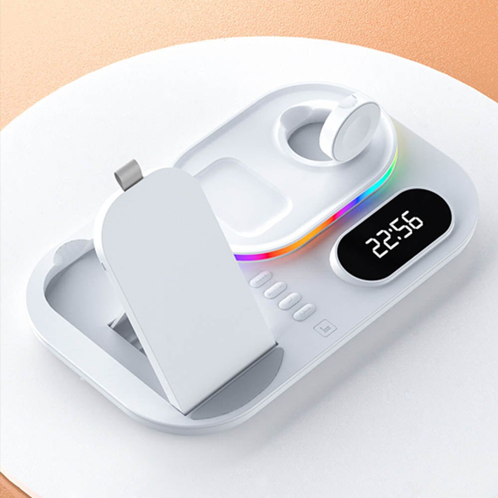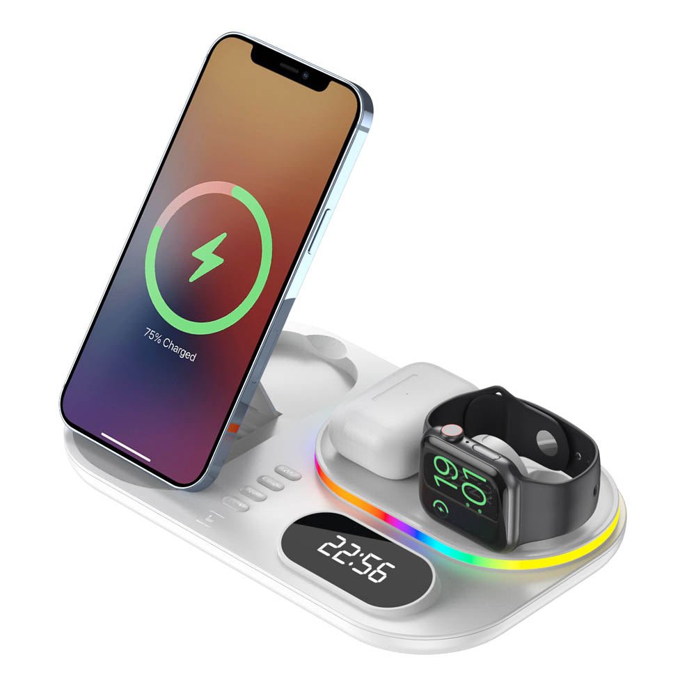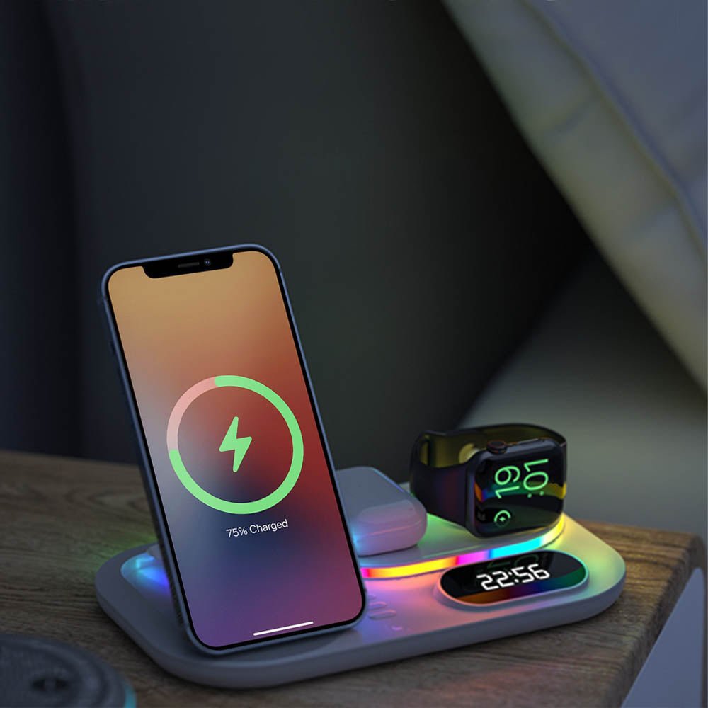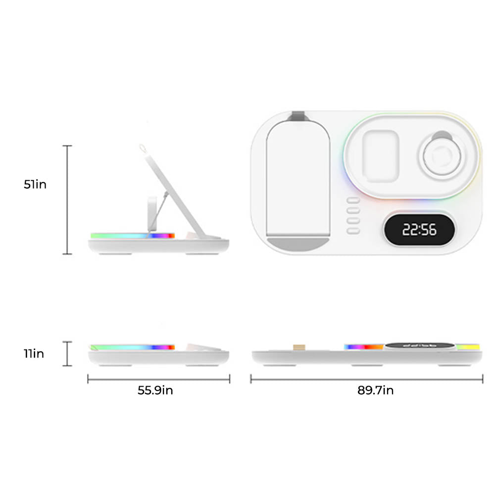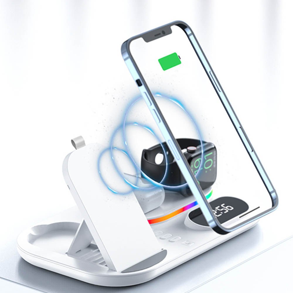 • The FusionCharge 4-in-1 Wireless Charger is designed to simultaneously charge your iPhone, Apple Watch, and AirPods, helping you maintain a clean and organized space. Its high-speed wireless charging capability ensures that your devices power up quickly without overheating or damaging the battery. In addition to its functionality, the FusionCharge features a digital clock display and RGB ambient lighting, adding a stylish touch to your desk or nightstand. With a peak output of 25W, it provides fast charging, while intelligent temperature control keeps your devices cool during the charging process. Its foldable and retractable design allows for easy storage and portability, making it a versatile addition to any setting.