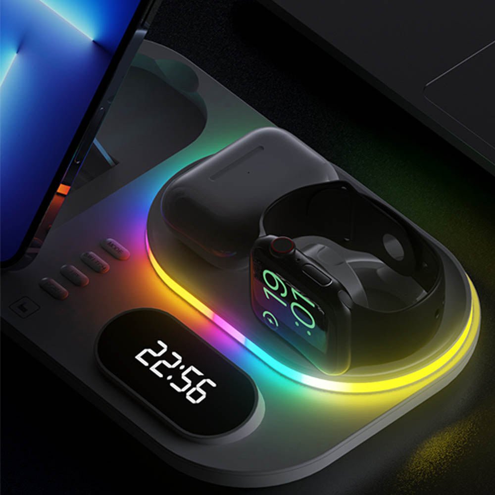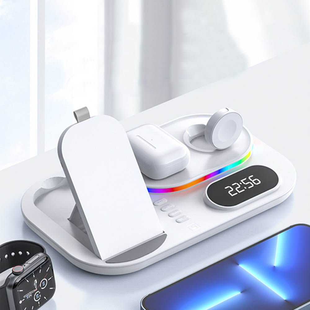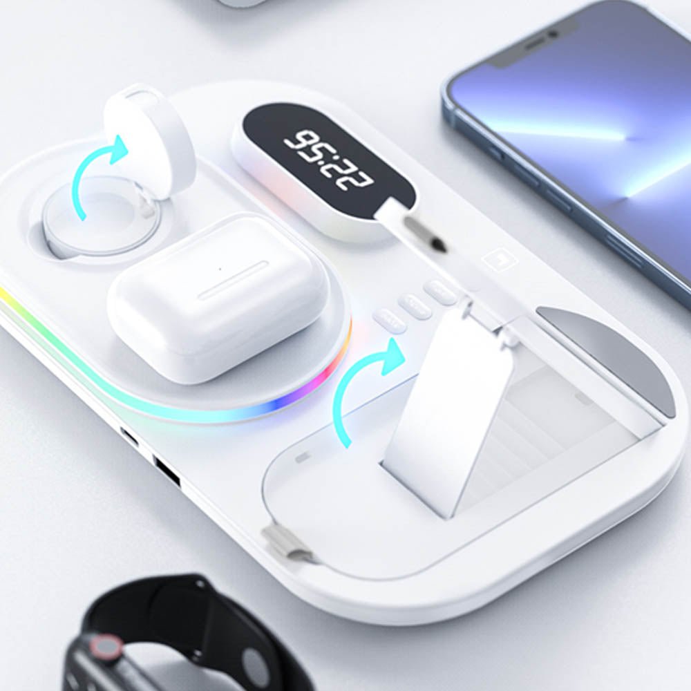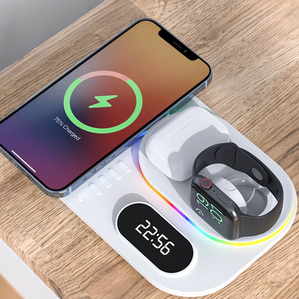 • The FusionCharge 4-in-1 Wireless Charger is designed to simultaneously charge your iPhone, Apple Watch, and AirPods, helping you maintain a clean and organized space. Its high-speed wireless charging capability ensures that your devices power up quickly without overheating or damaging the battery. In addition to its functionality, the FusionCharge features a digital clock display and RGB ambient lighting, adding a stylish touch to your desk or nightstand. With a peak output of 25W, it provides fast charging, while intelligent temperature control keeps your devices cool during the charging process. Its foldable and retractable design allows for easy storage and portability, making it a versatile addition to any setting.
