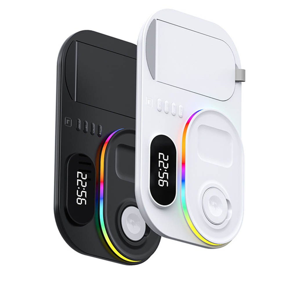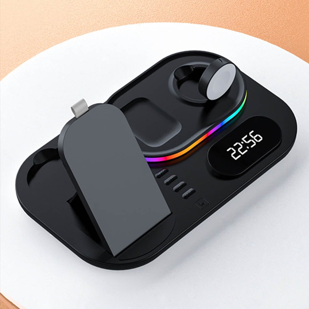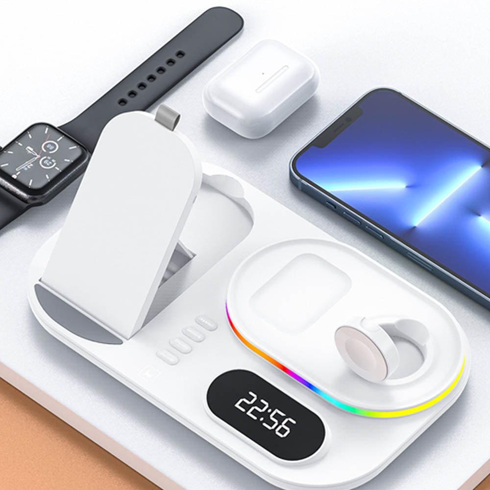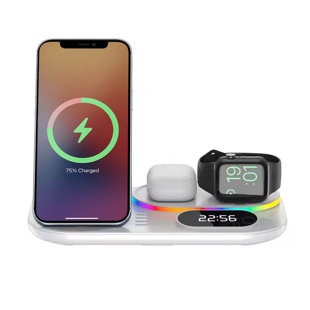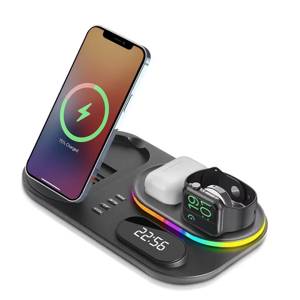 • The FusionCharge 4-in-1 Wireless Charger is designed to simultaneously charge your iPhone, Apple Watch, and AirPods, helping you maintain a clean and organized space. Its high-speed wireless charging capability ensures that your devices power up quickly without overheating or damaging the battery. In addition to its functionality, the FusionCharge features a digital clock display and RGB ambient lighting, adding a stylish touch to your desk or nightstand. With a peak output of 25W, it provides fast charging, while intelligent temperature control keeps your devices cool during the charging process. Its foldable and retractable design allows for easy storage and portability, making it a versatile addition to any setting.
