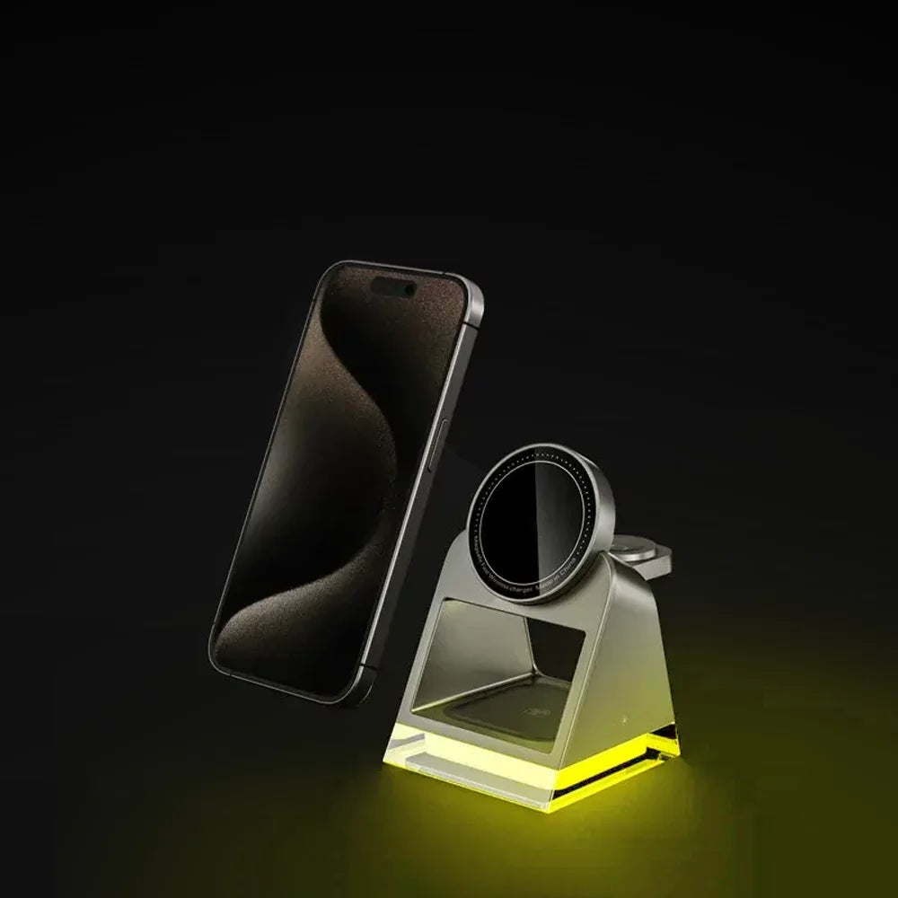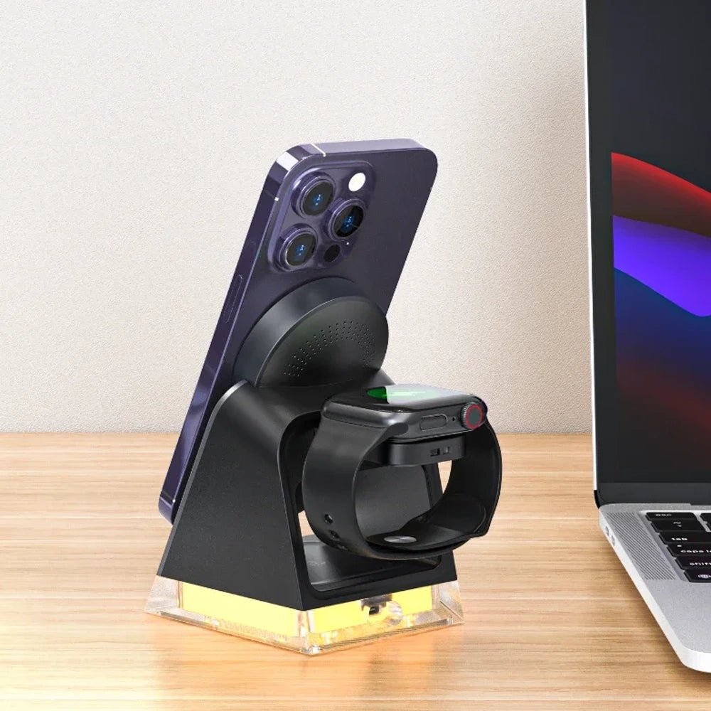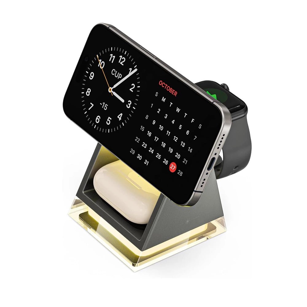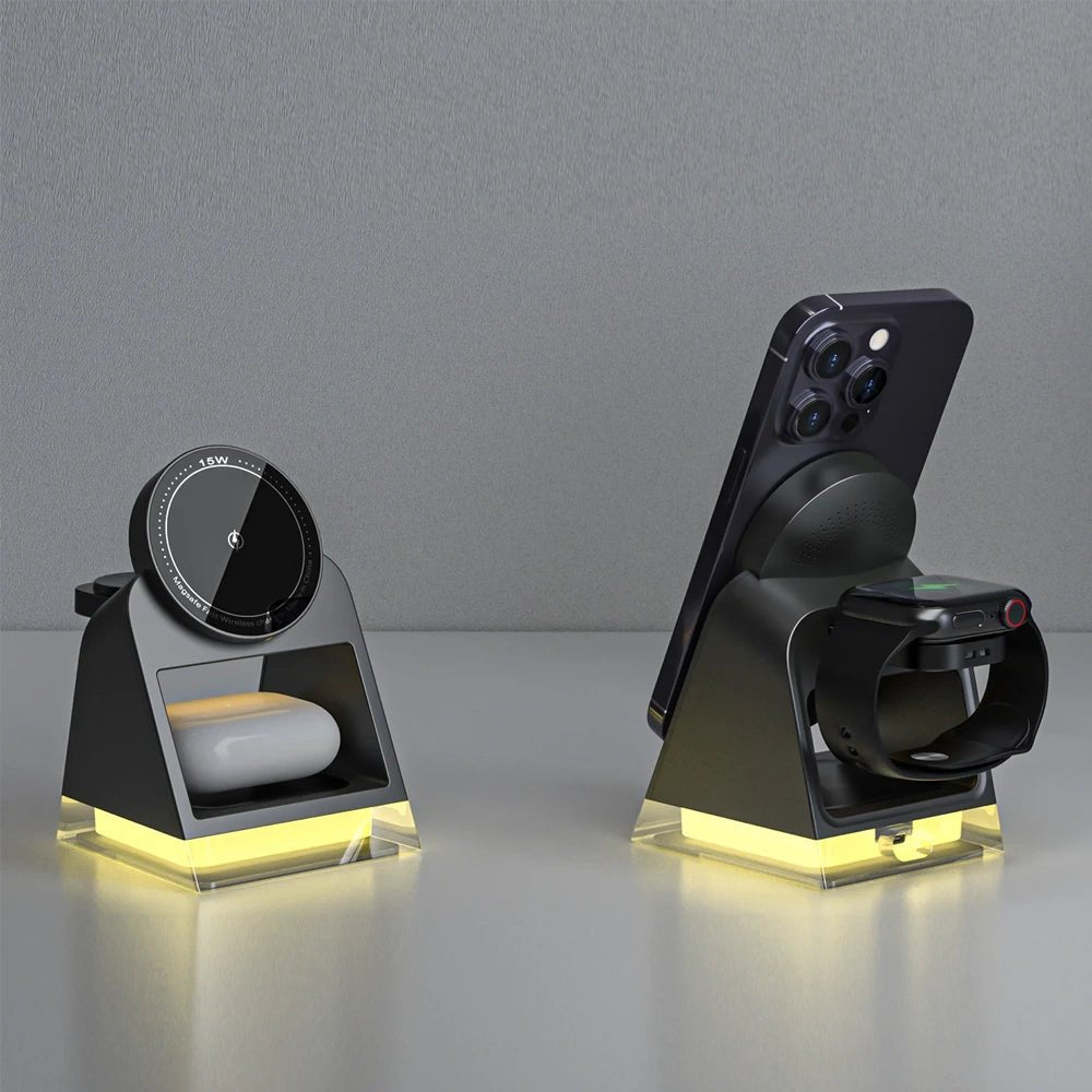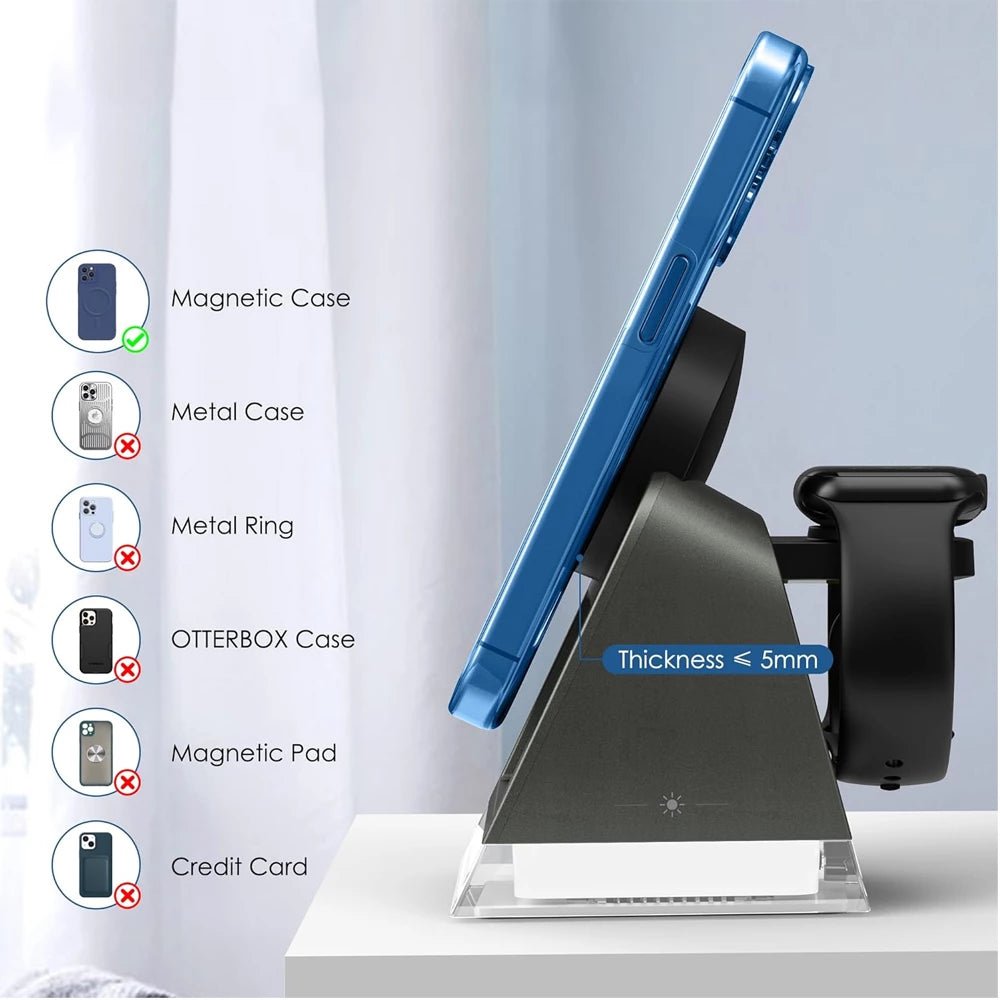 • Experience seamless charging with our latest PowerTrio Plus 3 in 1 MagSafe Charging Hub for Apple devices. Simultaneously power up your iPhone, Apple Watch, and AirPods with efficiency and convenience. Designed for both functionality and aesthetics, our charging hub features a unique crystal night lamp that offers customizable lighting options for a soothing ambiance. Easily detach the portable Apple Watch charger for added flexibility. With powerful magnetic technology ensuring precise alignment, enjoy safe and efficient charging without worrying about misalignment. Equipped with advanced safety features including temperature control, over-voltage protection, short circuit protection, and over-current protection, our charging hub guarantees a secure charging experience. Compact and space-saving, our 3 in 1 wireless charger stand is the perfect addition to your desk or nightstand. Upgrade your charging setup and simplify your life with our versatile PowerTrio Plus 3 in 1 MagSafe Charging Hub.
