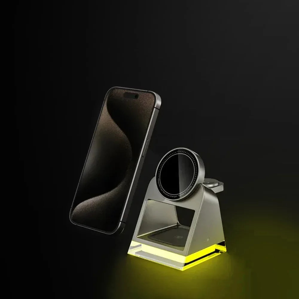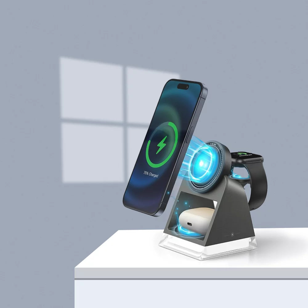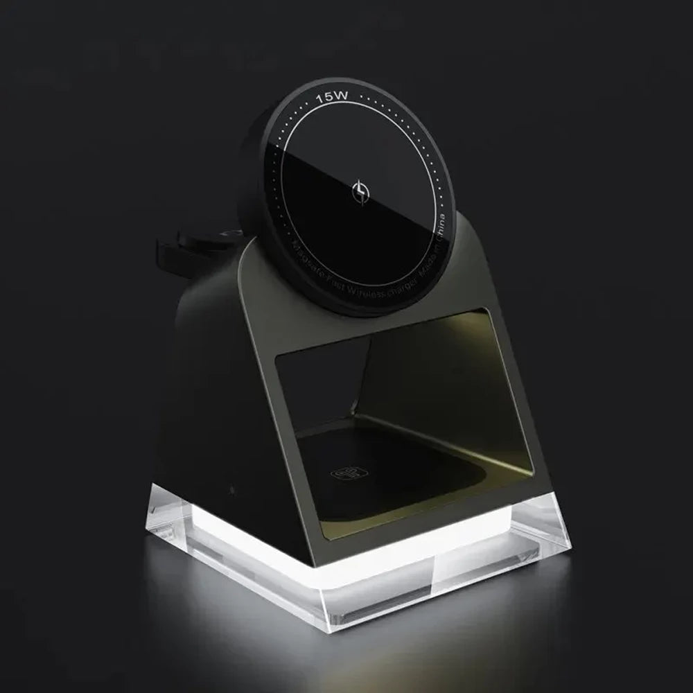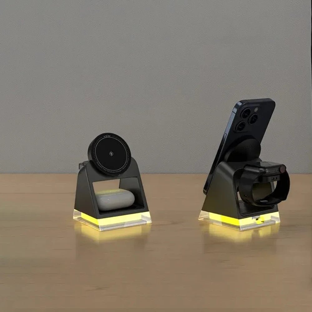 • Experience seamless charging with our latest PowerTrio Plus 3 in 1 MagSafe Charging Hub for Apple devices. Simultaneously power up your iPhone, Apple Watch, and AirPods with efficiency and convenience. Designed for both functionality and aesthetics, our charging hub features a unique crystal night lamp that offers customizable lighting options for a soothing ambiance. Easily detach the portable Apple Watch charger for added flexibility. With powerful magnetic technology ensuring precise alignment, enjoy safe and efficient charging without worrying about misalignment. Equipped with advanced safety features including temperature control, over-voltage protection, short circuit protection, and over-current protection, our charging hub guarantees a secure charging experience. Compact and space-saving, our 3 in 1 wireless charger stand is the perfect addition to your desk or nightstand. Upgrade your charging setup and simplify your life with our versatile PowerTrio Plus 3 in 1 MagSafe Charging Hub.
