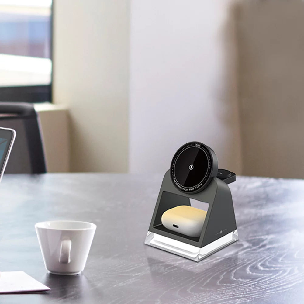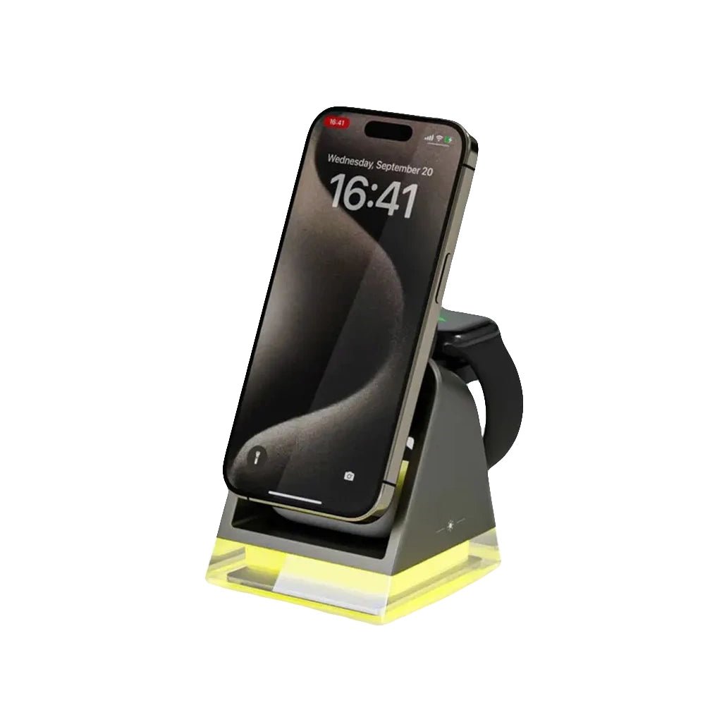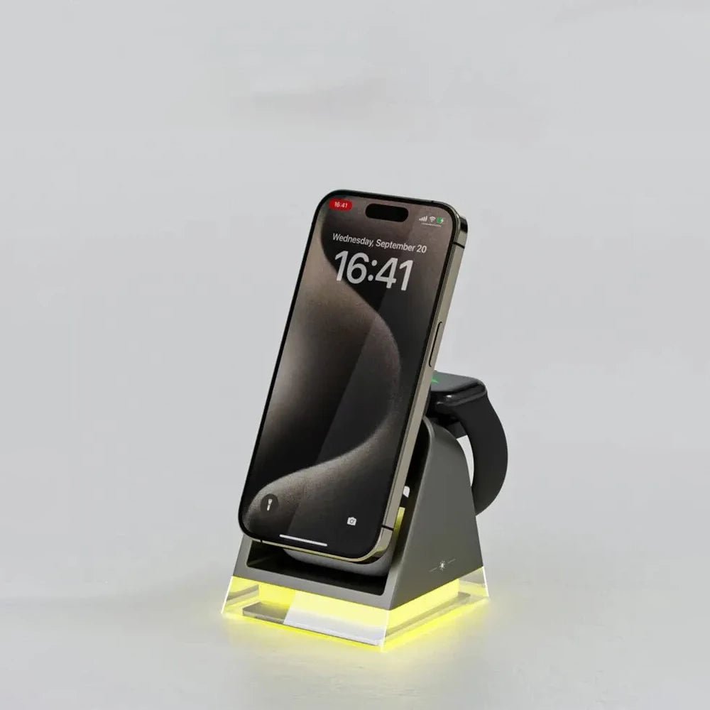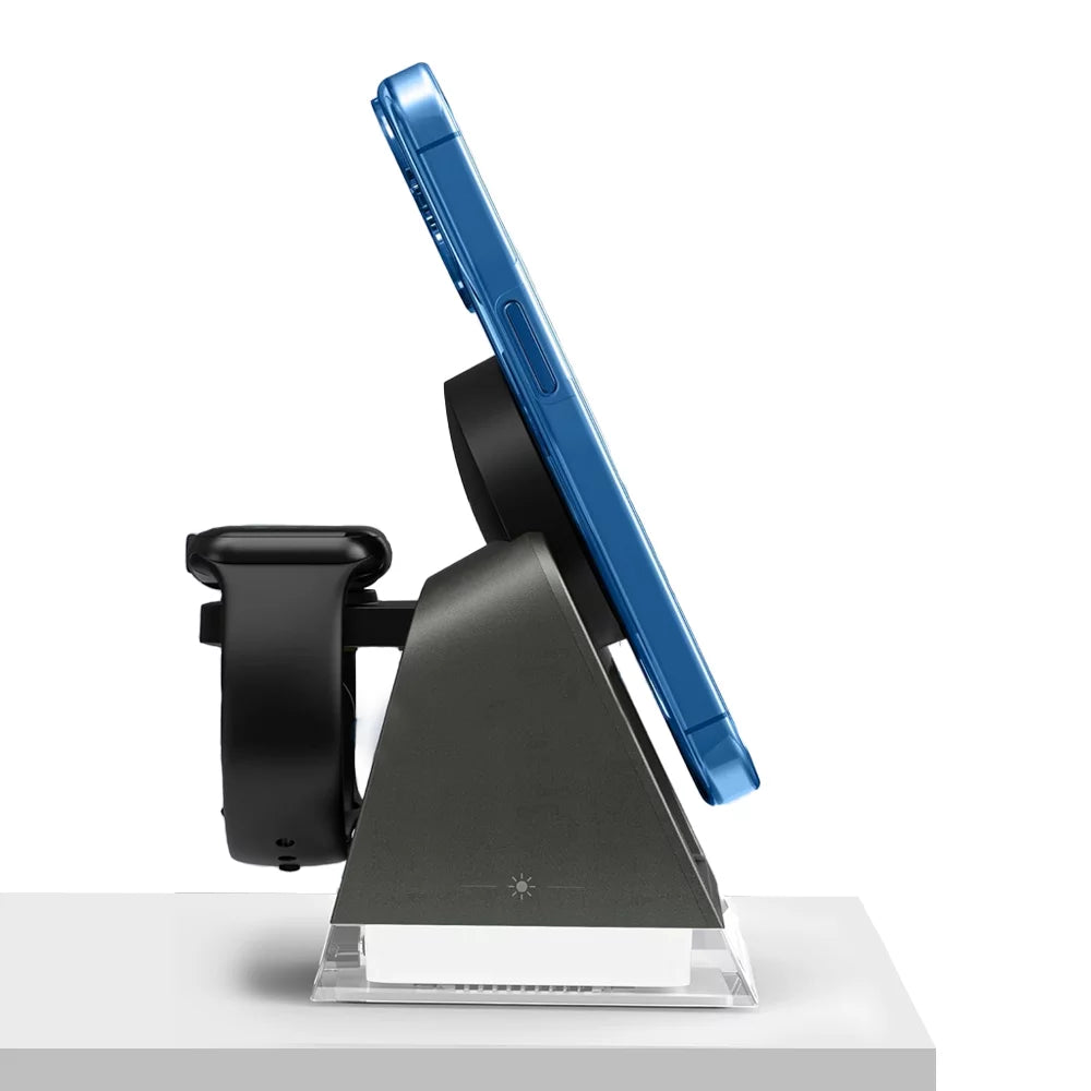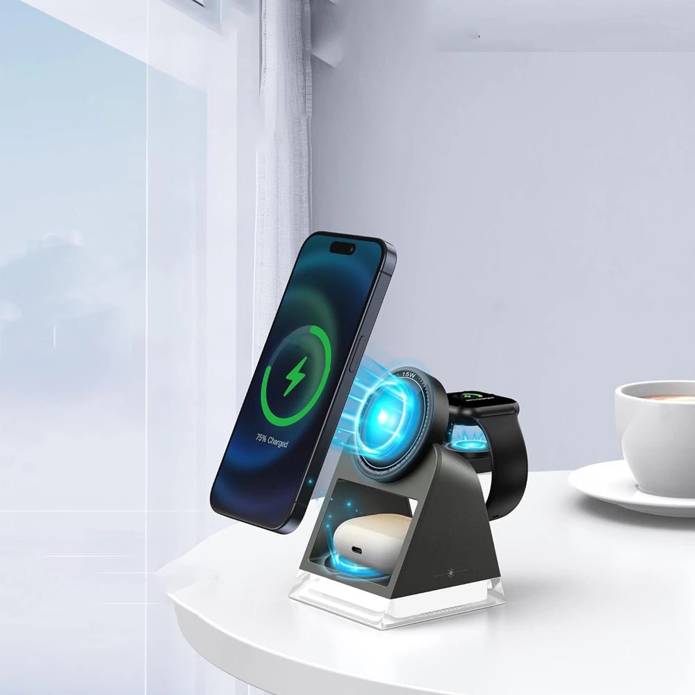 • Experience seamless charging with our latest PowerTrio Plus 3 in 1 MagSafe Charging Hub for Apple devices. Simultaneously power up your iPhone, Apple Watch, and AirPods with efficiency and convenience. Designed for both functionality and aesthetics, our charging hub features a unique crystal night lamp that offers customizable lighting options for a soothing ambiance. Easily detach the portable Apple Watch charger for added flexibility. With powerful magnetic technology ensuring precise alignment, enjoy safe and efficient charging without worrying about misalignment. Equipped with advanced safety features including temperature control, over-voltage protection, short circuit protection, and over-current protection, our charging hub guarantees a secure charging experience. Compact and space-saving, our 3 in 1 wireless charger stand is the perfect addition to your desk or nightstand. Upgrade your charging setup and simplify your life with our versatile PowerTrio Plus 3 in 1 MagSafe Charging Hub.