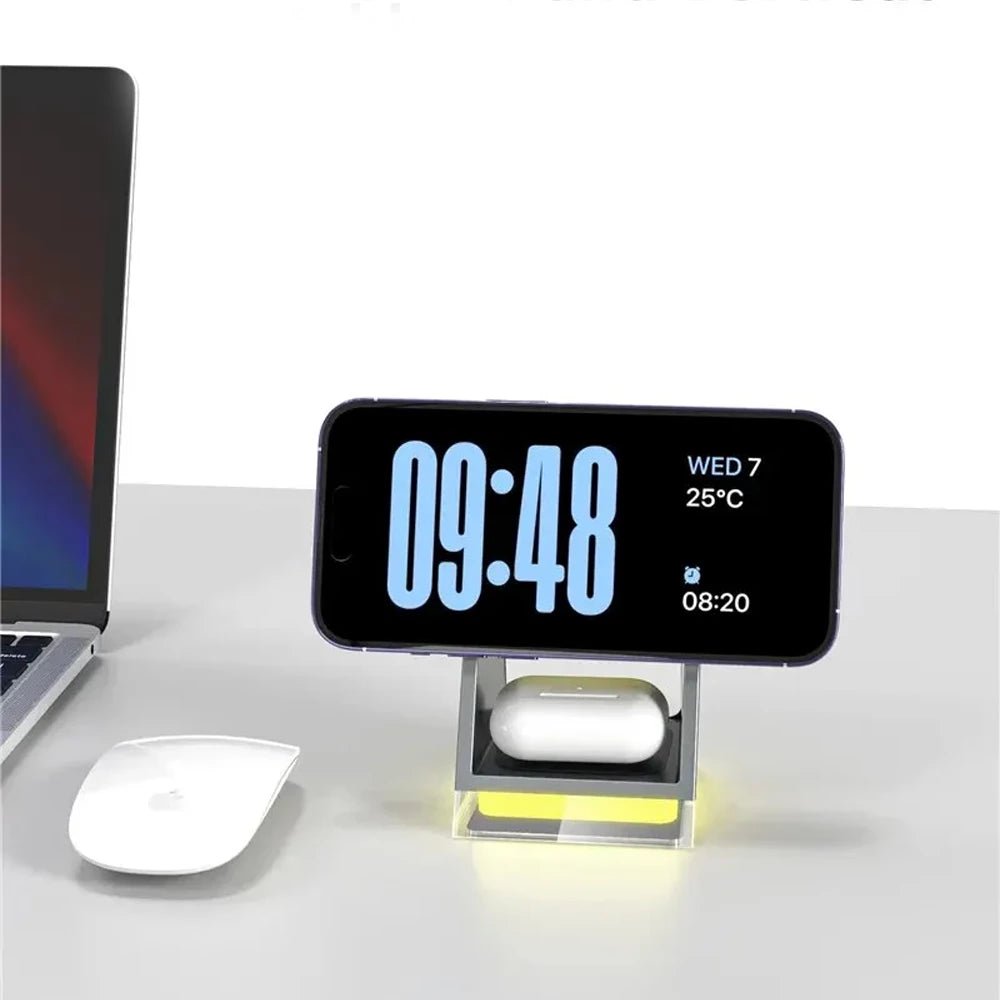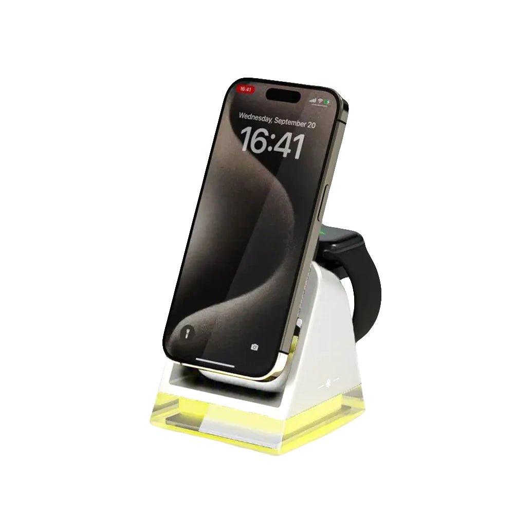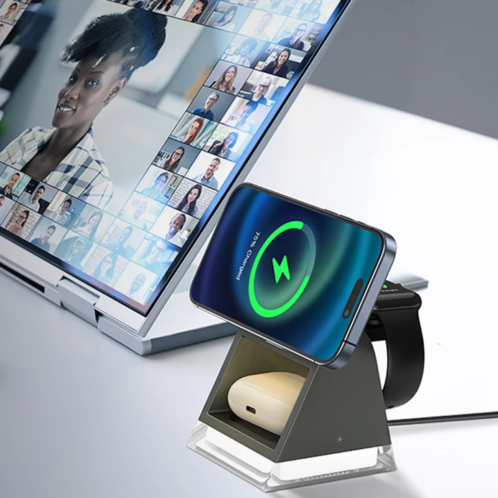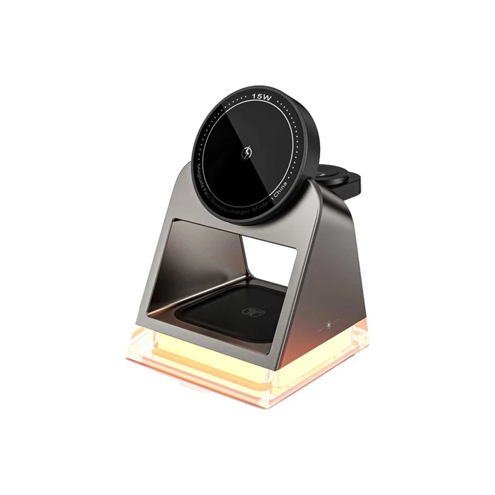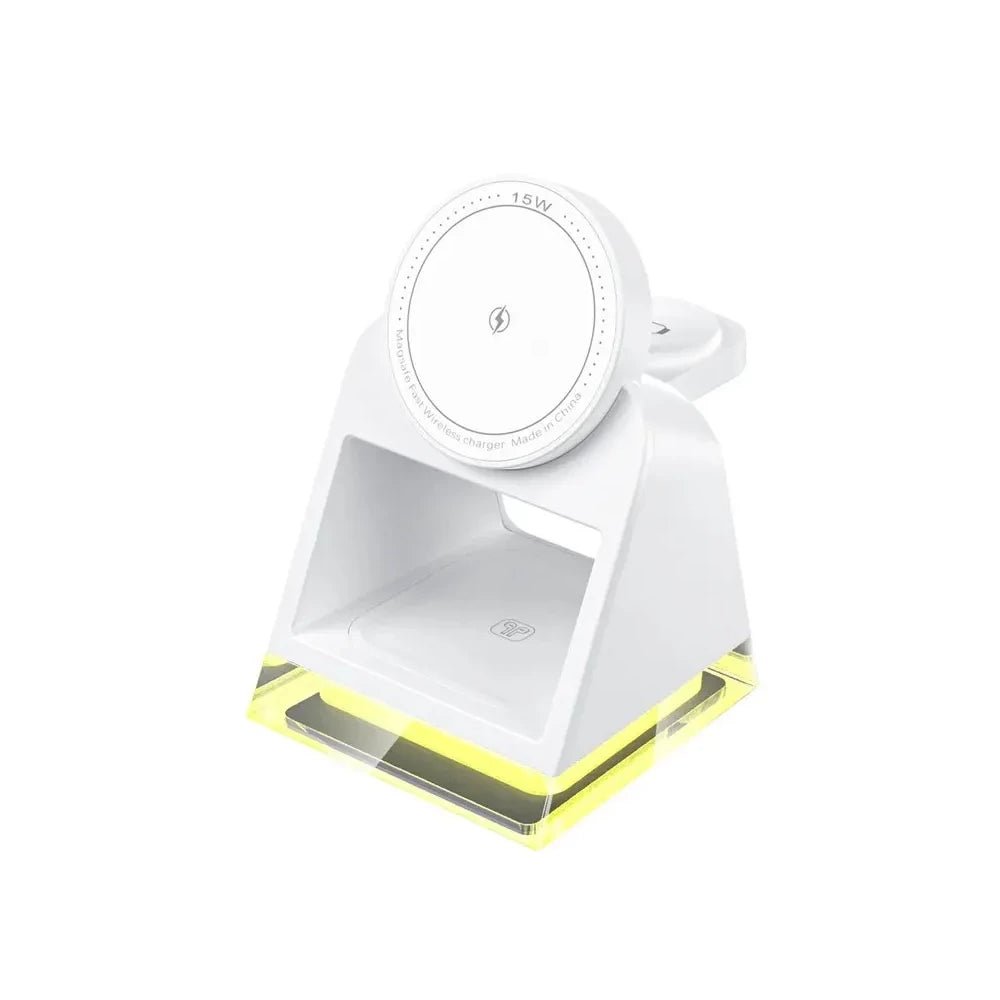 • Experience seamless charging with our latest PowerTrio Plus 3 in 1 MagSafe Charging Hub for Apple devices. Simultaneously power up your iPhone, Apple Watch, and AirPods with efficiency and convenience. Designed for both functionality and aesthetics, our charging hub features a unique crystal night lamp that offers customizable lighting options for a soothing ambiance. Easily detach the portable Apple Watch charger for added flexibility. With powerful magnetic technology ensuring precise alignment, enjoy safe and efficient charging without worrying about misalignment. Equipped with advanced safety features including temperature control, over-voltage protection, short circuit protection, and over-current protection, our charging hub guarantees a secure charging experience. Compact and space-saving, our 3 in 1 wireless charger stand is the perfect addition to your desk or nightstand. Upgrade your charging setup and simplify your life with our versatile PowerTrio Plus 3 in 1 MagSafe Charging Hub.