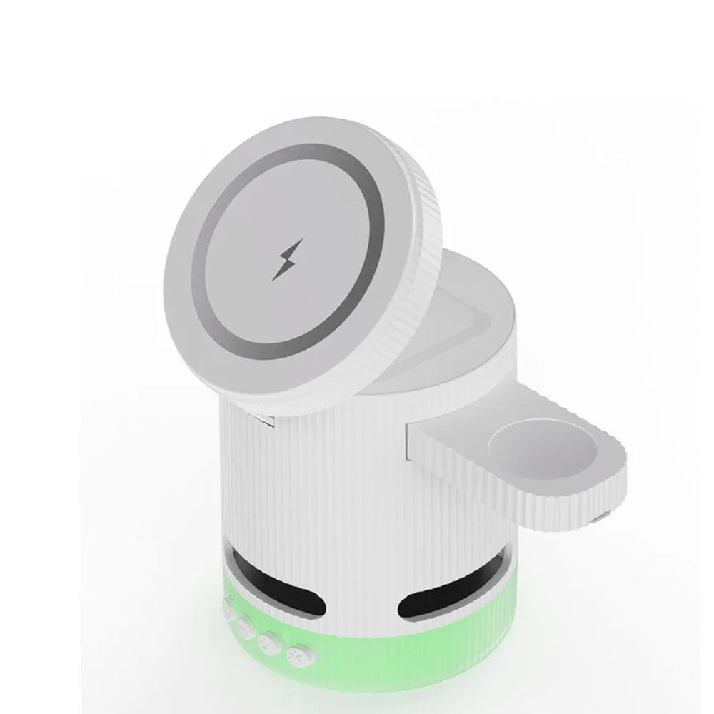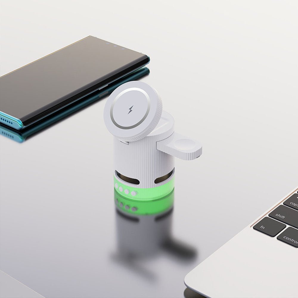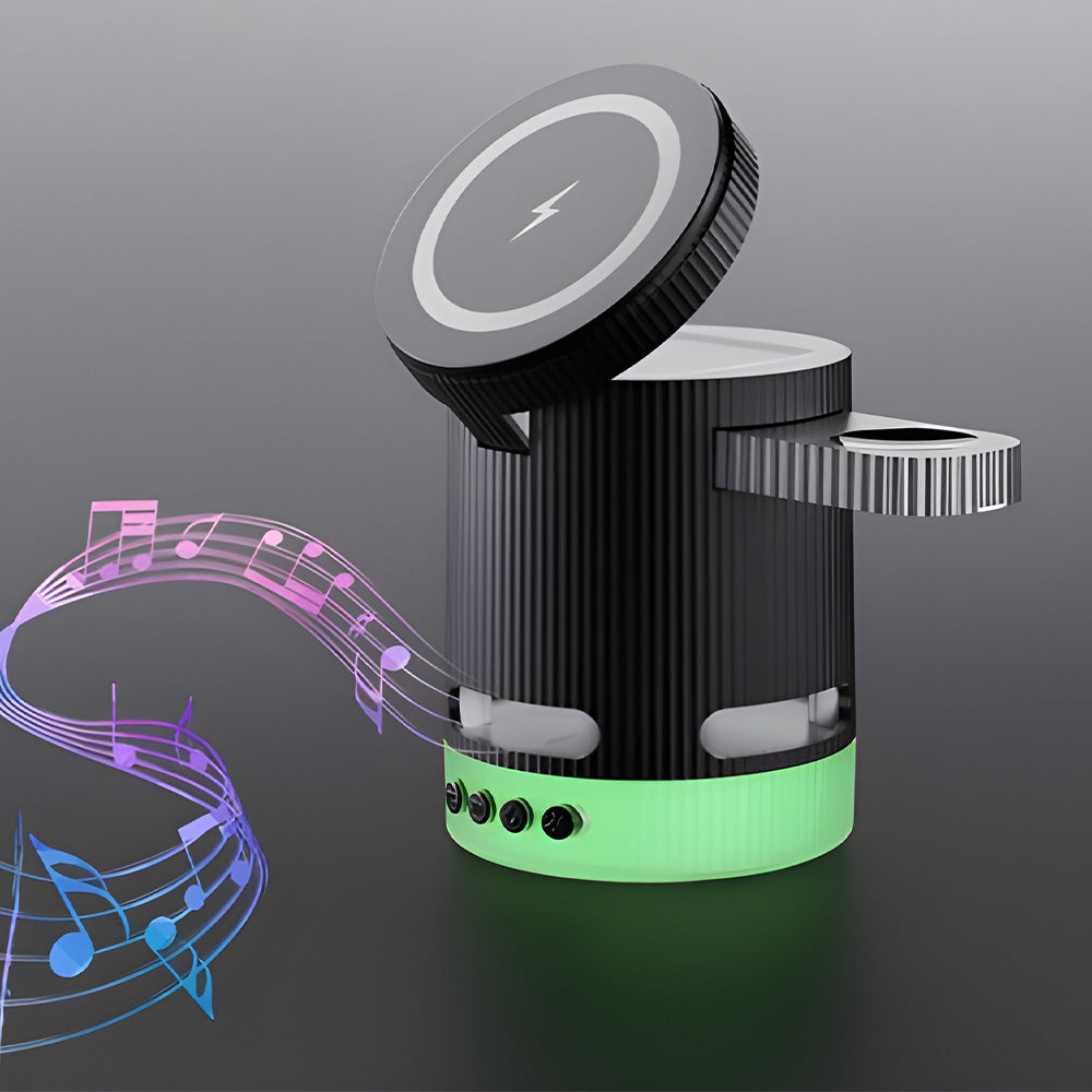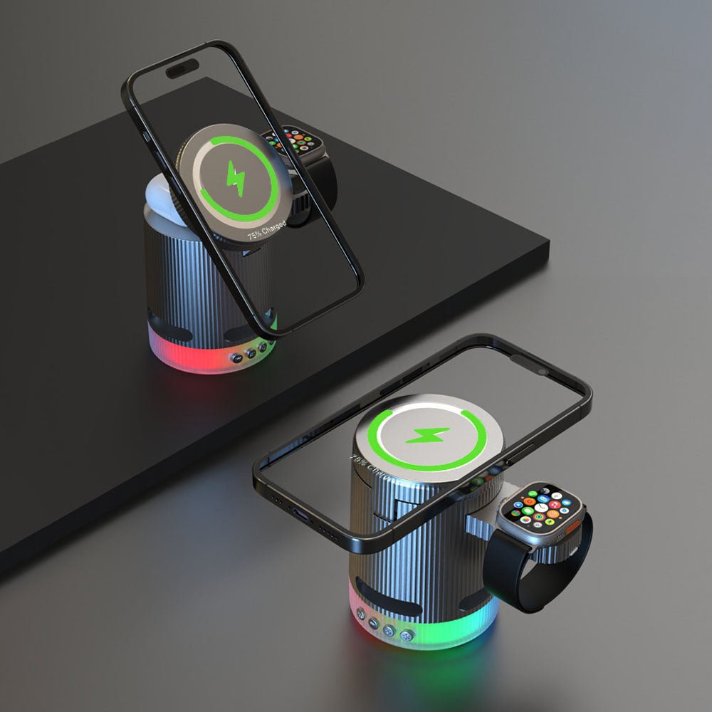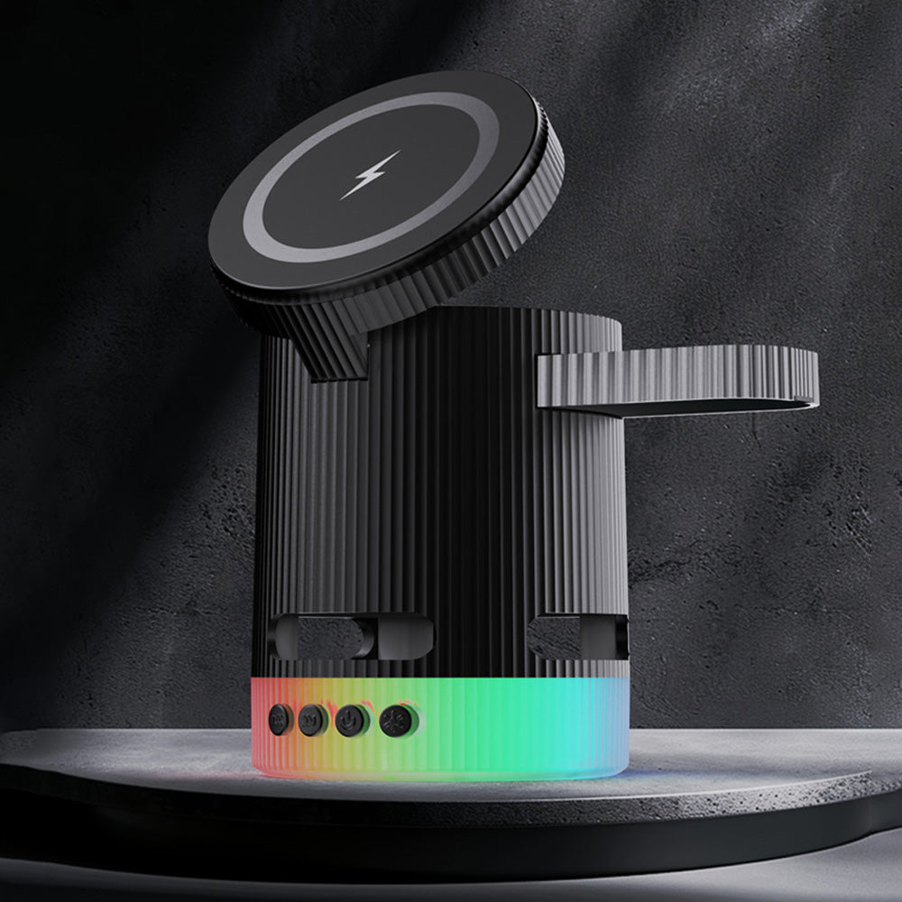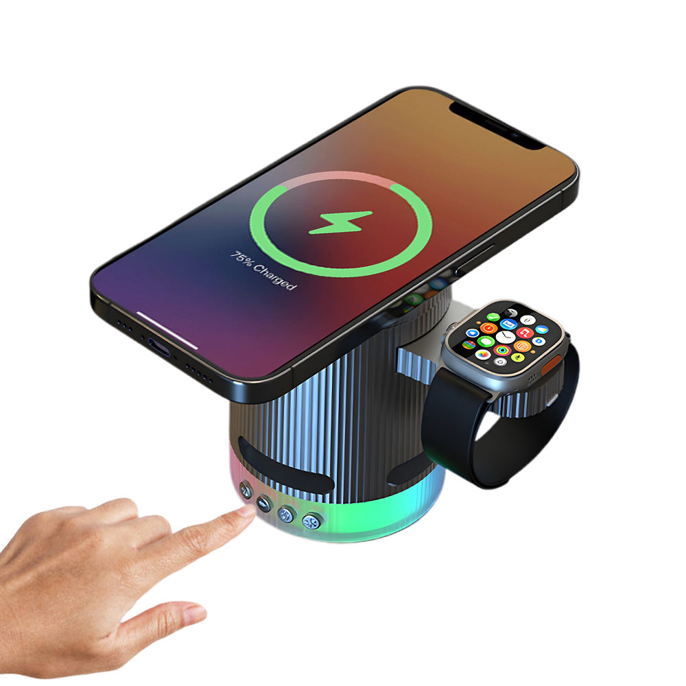• Introducing the ultimate all-in-one wireless charging station with built-in Bluetooth speaker, designed to elevate your charging experience. This versatile 4-in-1 foldable charger features 15W magnetic wireless charging for your iPhone, a 2.5W dedicated Apple Watch charger, and a hidden charging pad for seamless multi-device power-ups. Enjoy vibrant RGB mood lighting and immersive sound from the integrated Bluetooth speaker, perfect for music, movies, or creating a relaxing ambiance. The N52 strong magnet ensures a secure hold, while smart temperature control prevents overheating for safe overnight charging. Foldable and compact, it unlocks multiple charging positions for convenience at home, work, or travel.