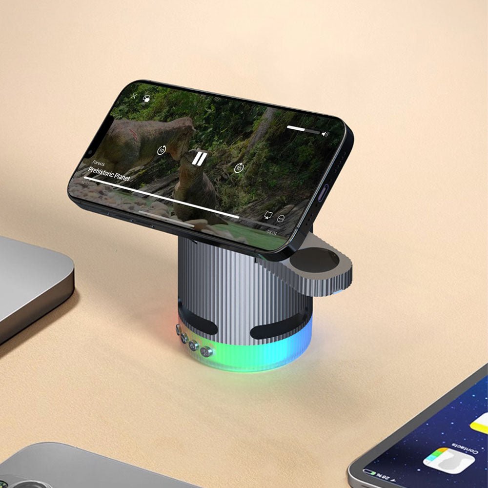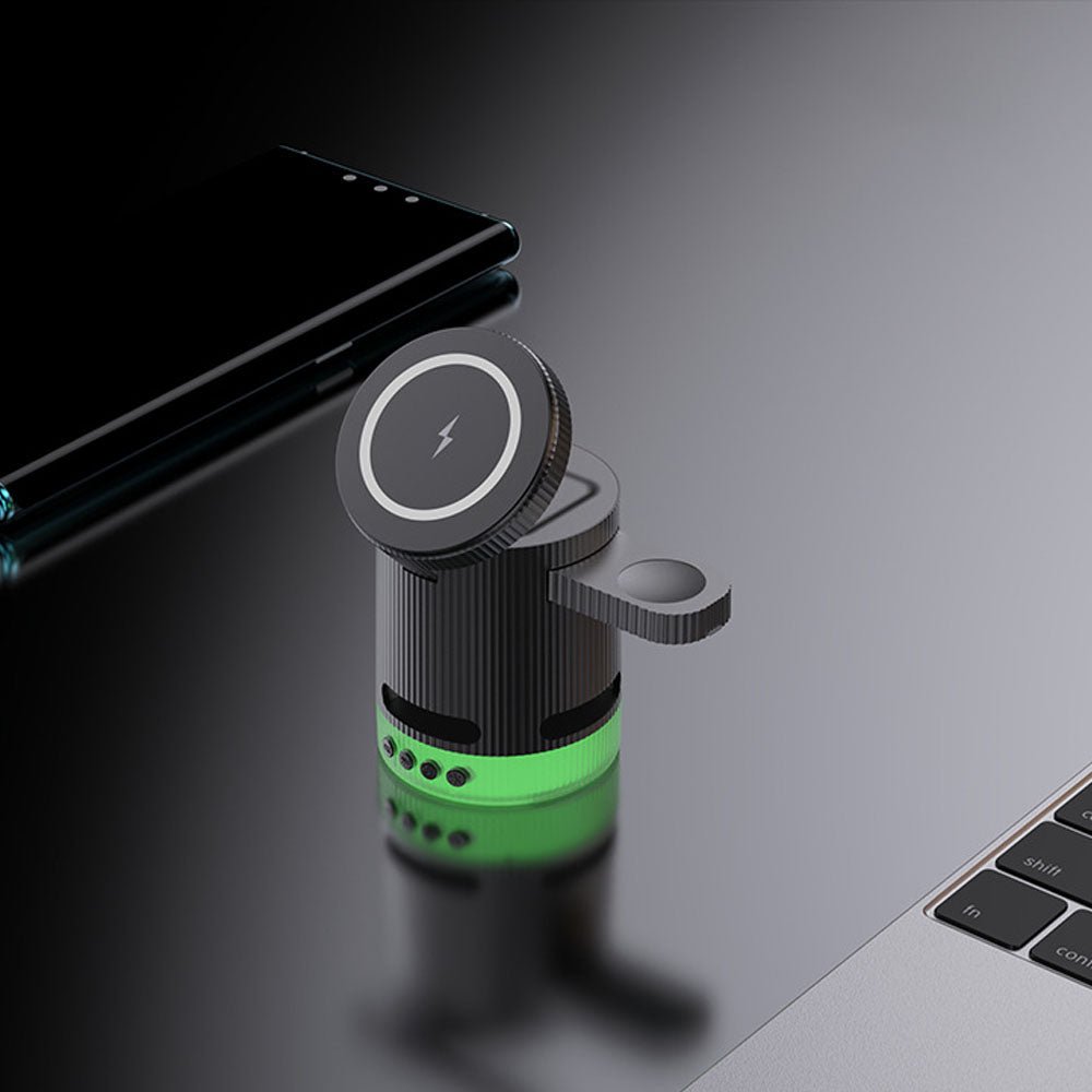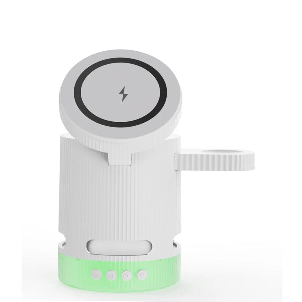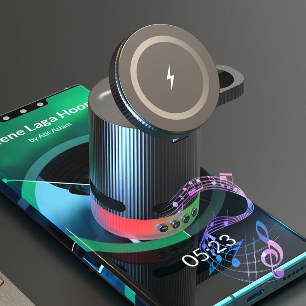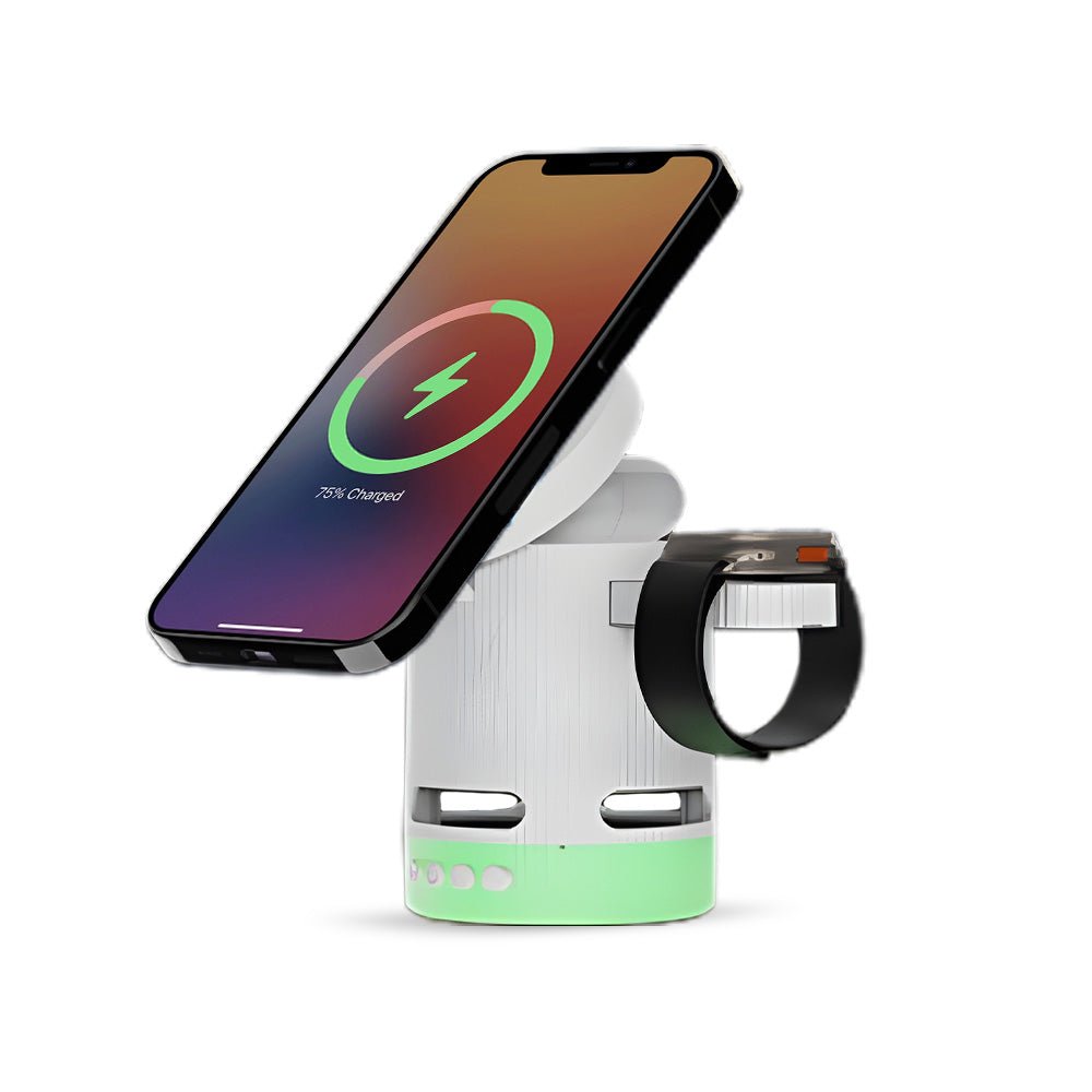 • Introducing the ultimate all-in-one wireless charging station with built-in Bluetooth speaker, designed to elevate your charging experience. This versatile 4-in-1 foldable charger features 15W magnetic wireless charging for your iPhone, a 2.5W dedicated Apple Watch charger, and a hidden charging pad for seamless multi-device power-ups. Enjoy vibrant RGB mood lighting and immersive sound from the integrated Bluetooth speaker, perfect for music, movies, or creating a relaxing ambiance. The N52 strong magnet ensures a secure hold, while smart temperature control prevents overheating for safe overnight charging. Foldable and compact, it unlocks multiple charging positions for convenience at home, work, or travel.