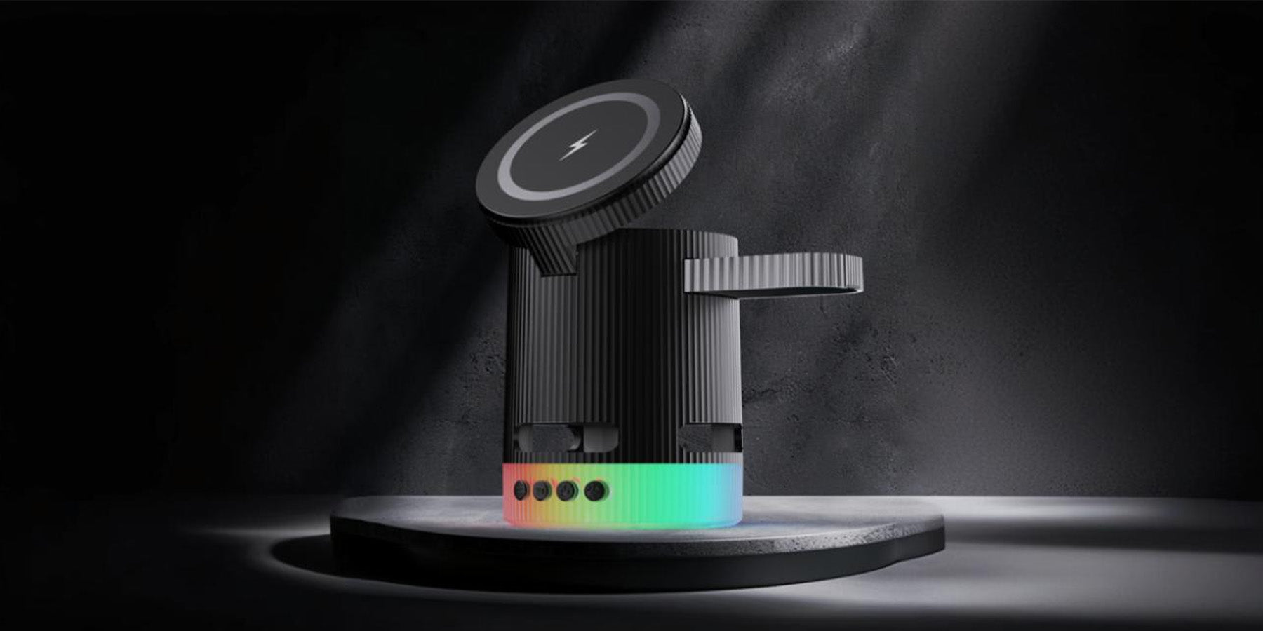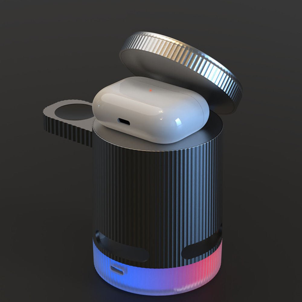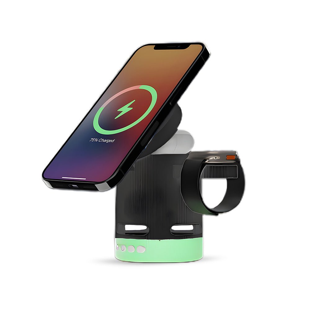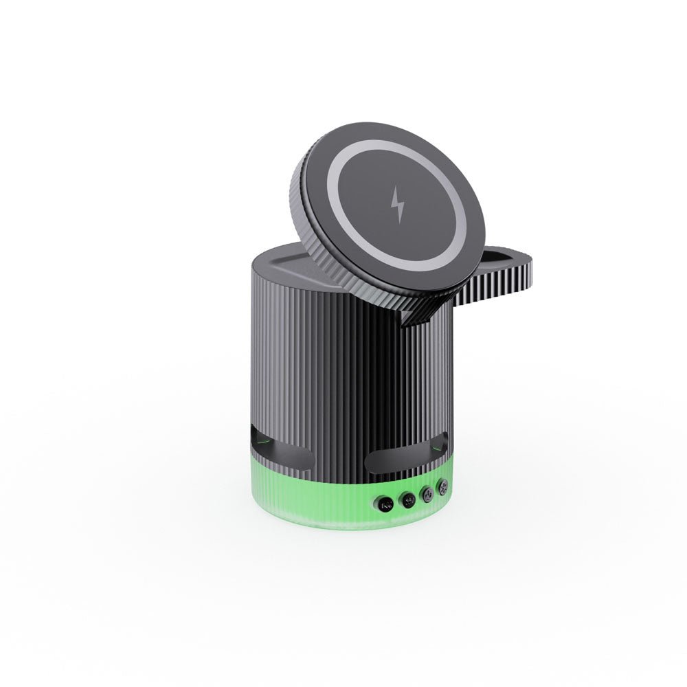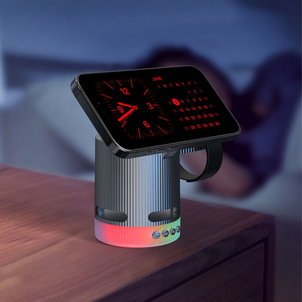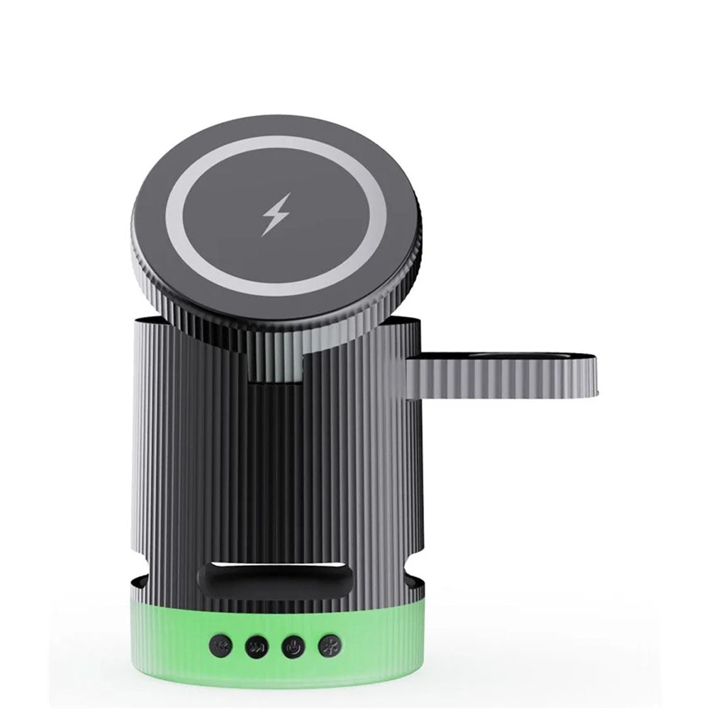 • Introducing the ultimate all-in-one wireless charging station with built-in Bluetooth speaker, designed to elevate your charging experience. This versatile 4-in-1 foldable charger features 15W magnetic wireless charging for your iPhone, a 2.5W dedicated Apple Watch charger, and a hidden charging pad for seamless multi-device power-ups. Enjoy vibrant RGB mood lighting and immersive sound from the integrated Bluetooth speaker, perfect for music, movies, or creating a relaxing ambiance. The N52 strong magnet ensures a secure hold, while smart temperature control prevents overheating for safe overnight charging. Foldable and compact, it unlocks multiple charging positions for convenience at home, work, or travel.