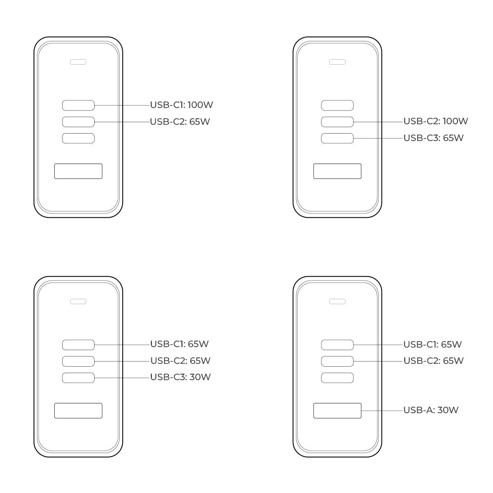 USB-C1: 65W, USB-C2: 65W, USB-A: 30W