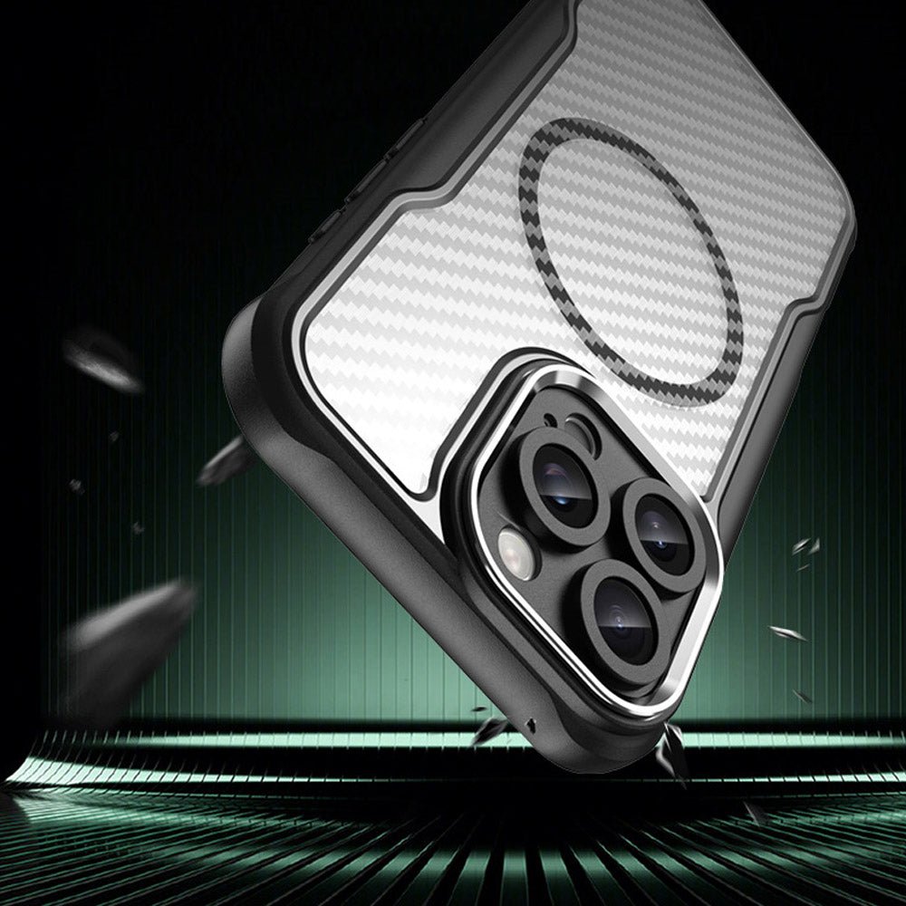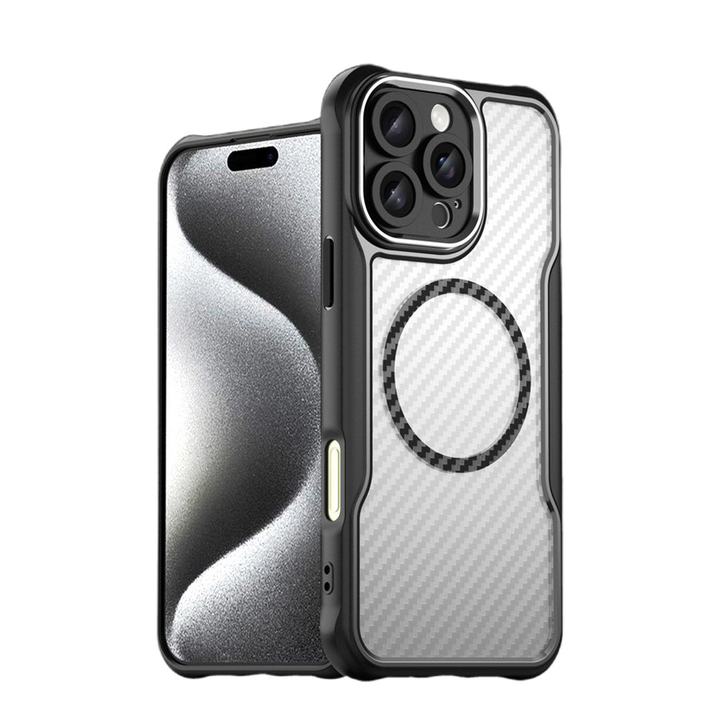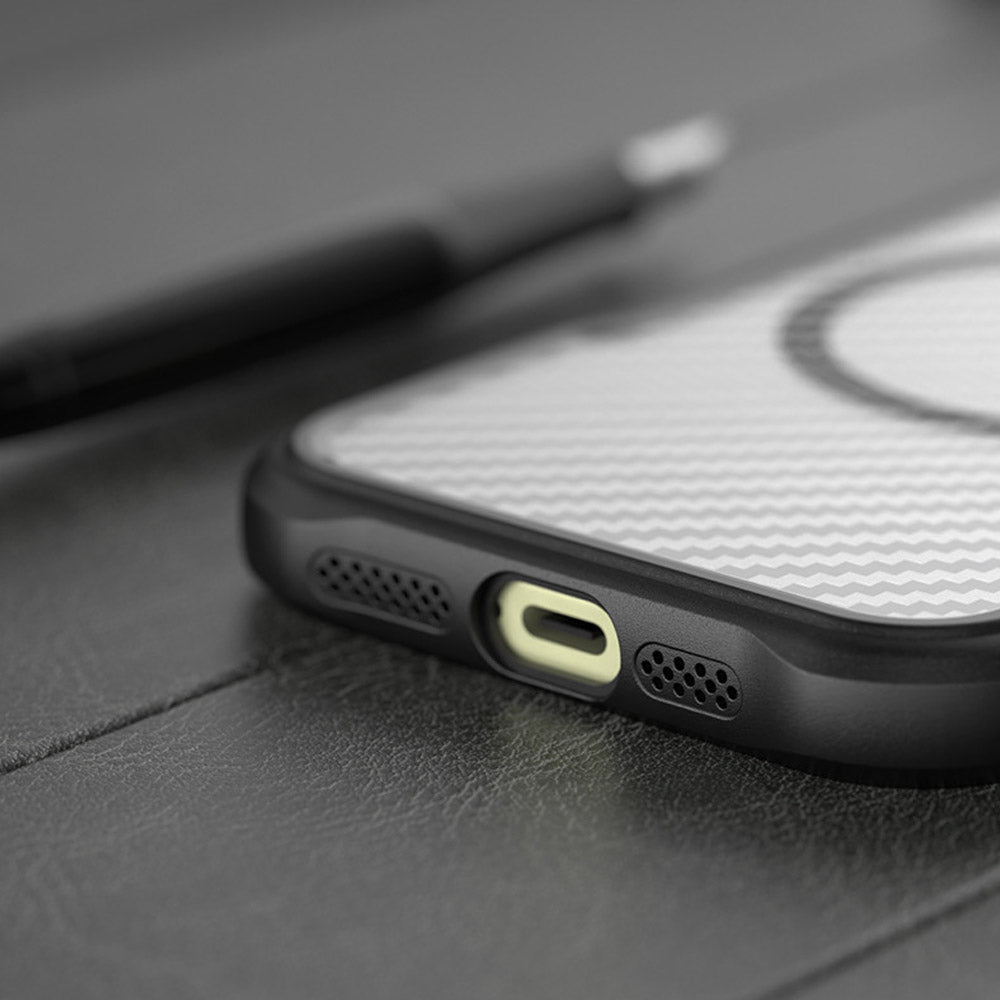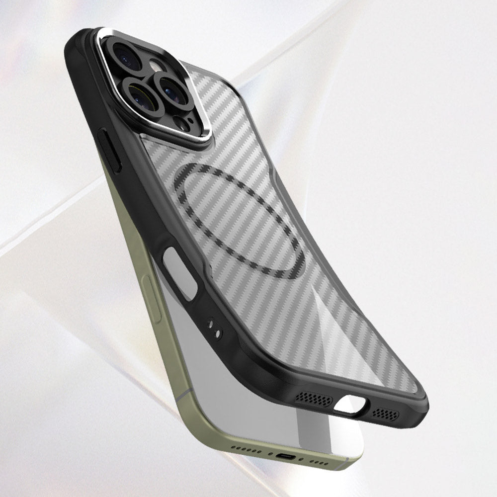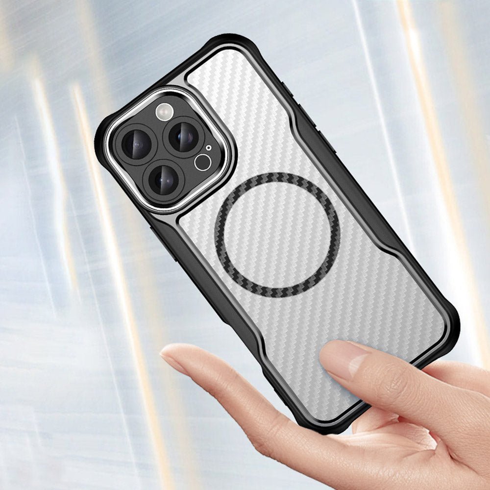 Introducing the CarbonGuard MagSafe iPhone Case. Designed with a semi-transparent carbon fiber texture and silicone frame, this case offers a sleek frosted finish that feels as good as it looks. Its matte surface resists sweat and oil, ensuring a fresh, non-slip grip every time. Featuring invisible anti-collision airbags. Built with military-grade materials, it offers comprehensive protection, including a durable aluminum alloy lens frame to safeguard your camera. This case effortlessly snaps into place, delivering strong magnetic alignment for uninterrupted wireless charging.