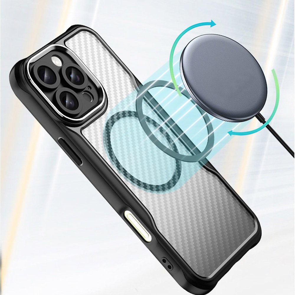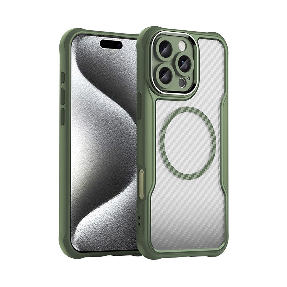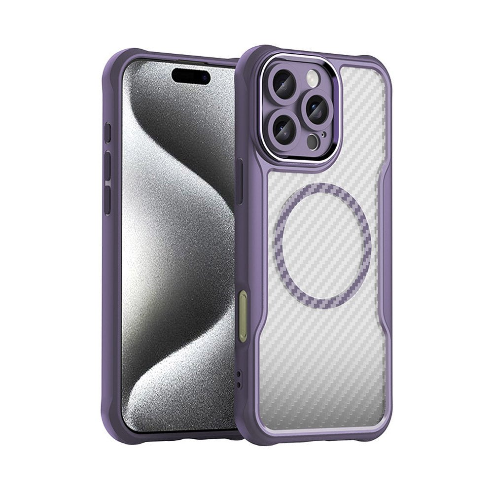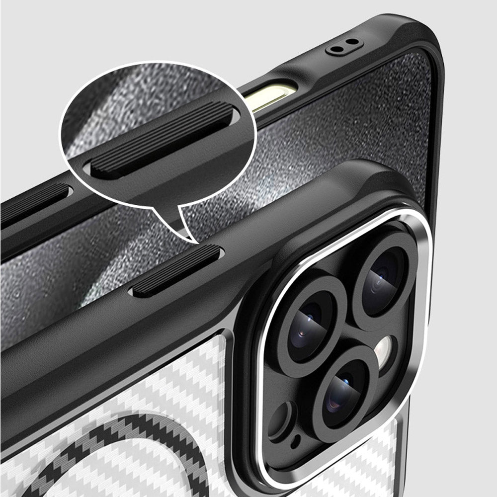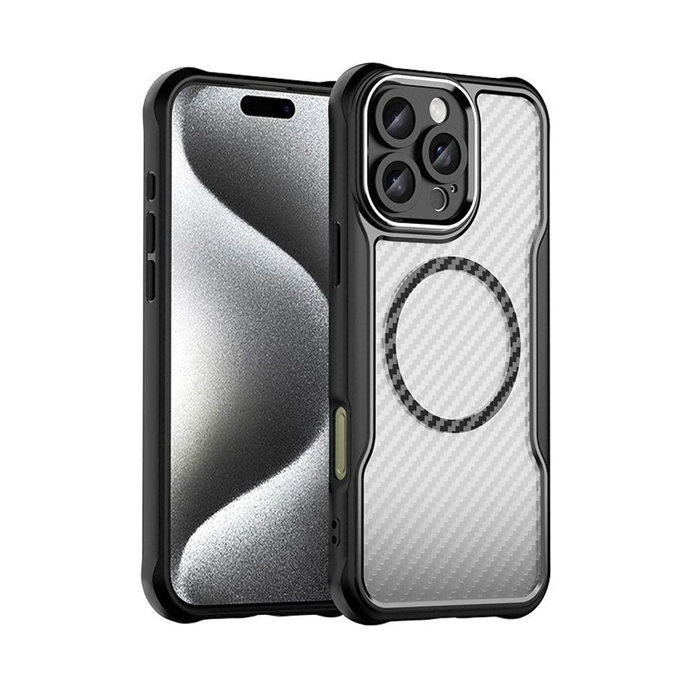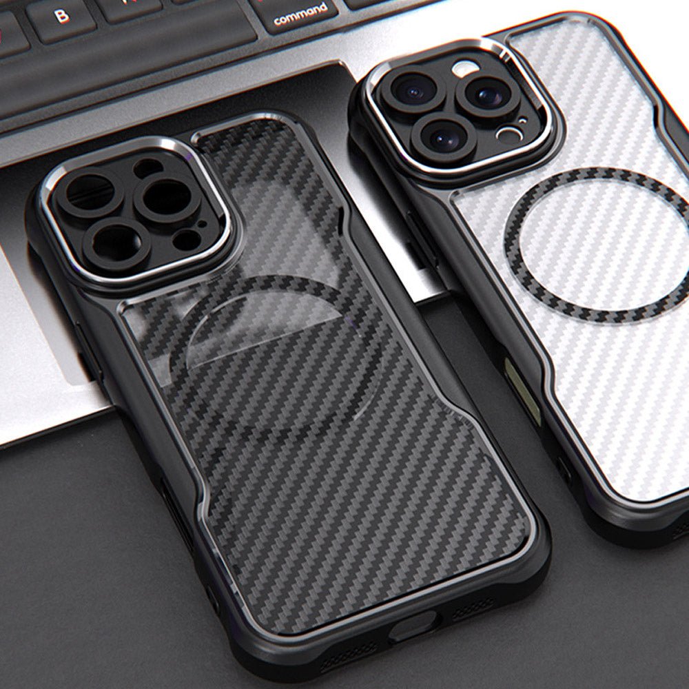Introducing the CarbonGuard MagSafe iPhone Case. Designed with a semi-transparent carbon fiber texture and silicone frame, this case offers a sleek frosted finish that feels as good as it looks. Its matte surface resists sweat and oil, ensuring a fresh, non-slip grip every time. Featuring invisible anti-collision airbags. Built with military-grade materials, it offers comprehensive protection, including a durable aluminum alloy lens frame to safeguard your camera. This case effortlessly snaps into place, delivering strong magnetic alignment for uninterrupted wireless charging.
