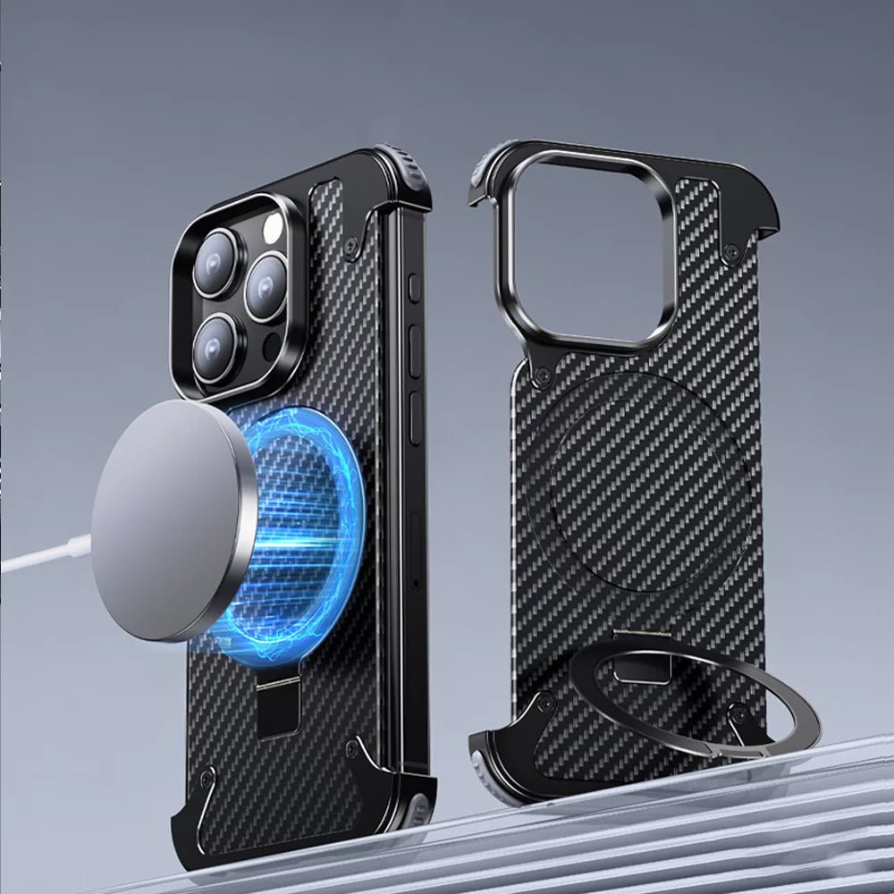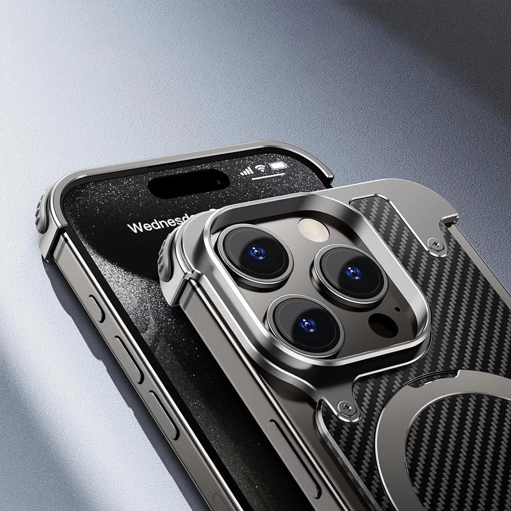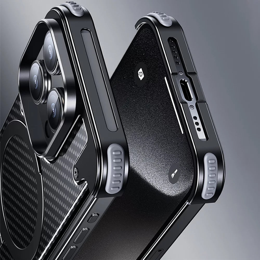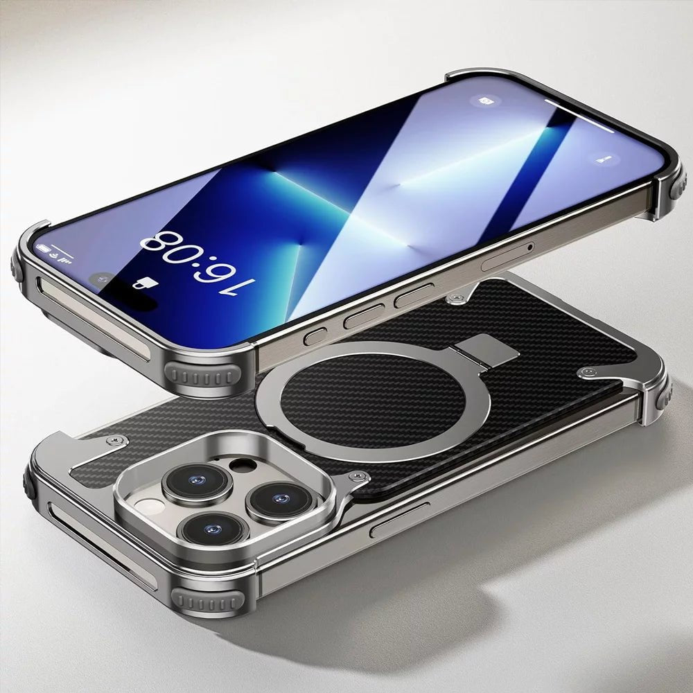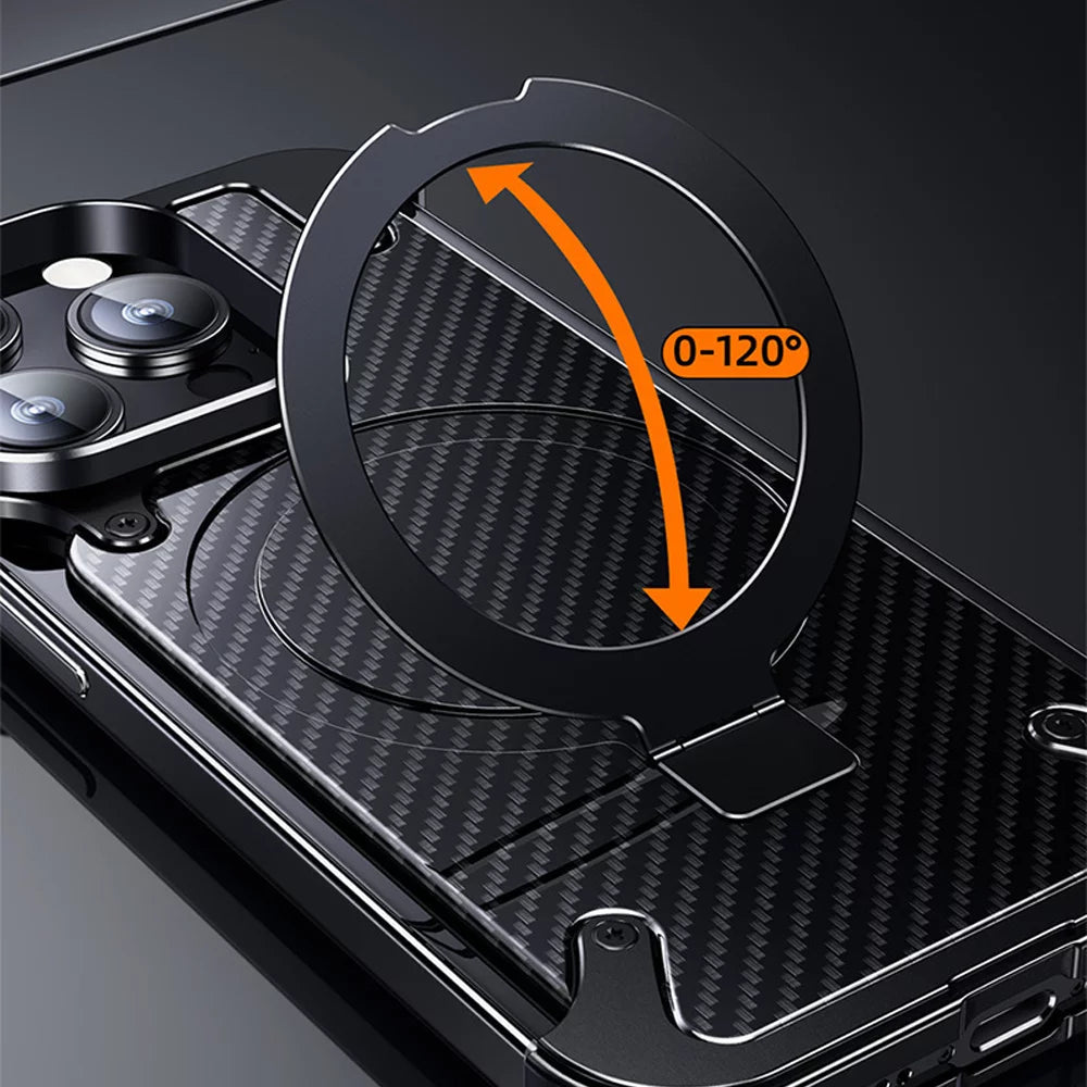 • Introducing the EdgeX CarbonShield MagSafe iPhone Case, where sophistication meets protection. With a sleek bezelless design and carbon fiber pattern, it offers both style and security. The stronger magnetic lock ensures easy wireless charging on the go, while the shock-absorbing corners provide unmatched drop protection. Its raised metal lens frame and corners safeguard your camera and screen. The integrated stand, reinforced with aerospace-grade aluminum, offers hands-free convenience without bulk. Enjoy the Carbon Design Texture, MagSafe compatibility, and customizable viewing angles. Made from durable Aluminum Metal Alloy, it's resistant to falls and spills. Plus, it's anti-fingerprint, anti-sweat, and anti-oil, keeping your device looking pristine while providing a comfortable grip.