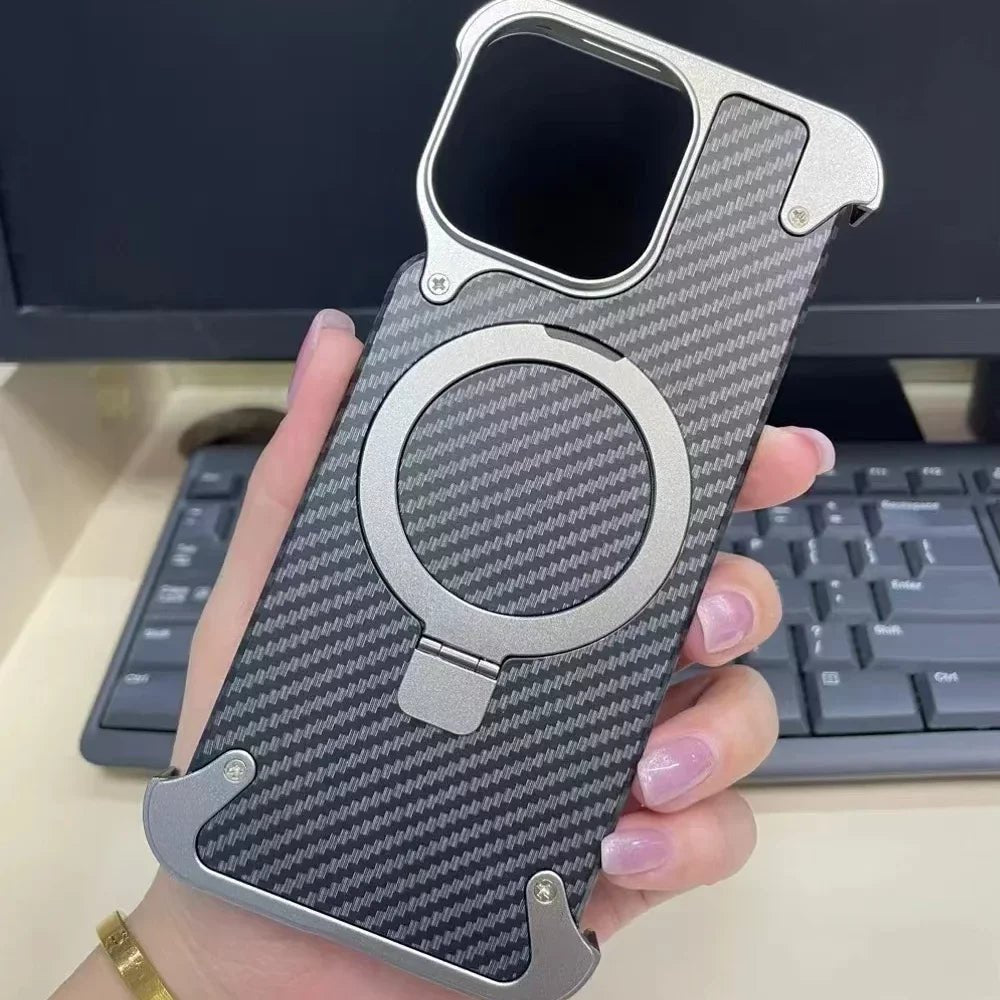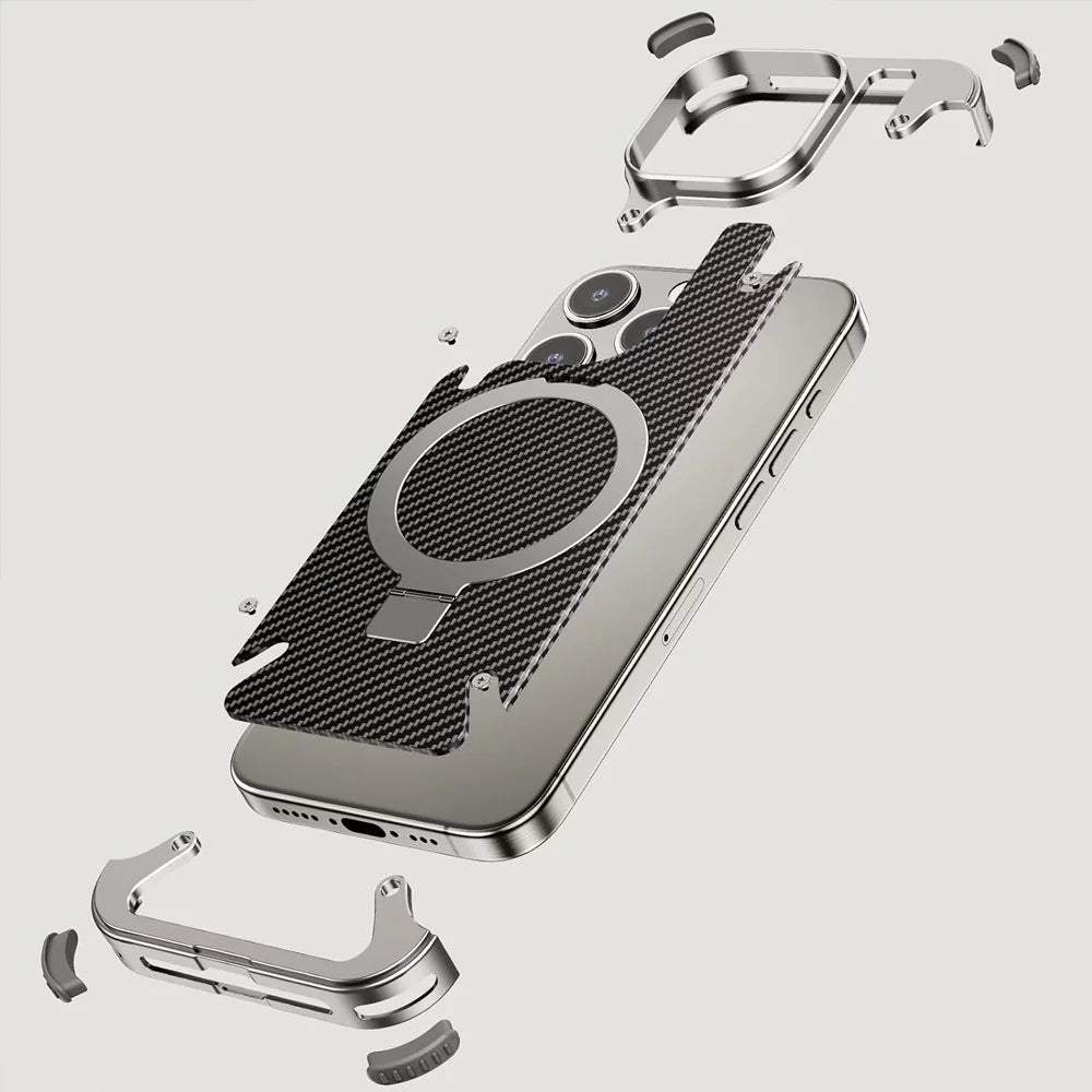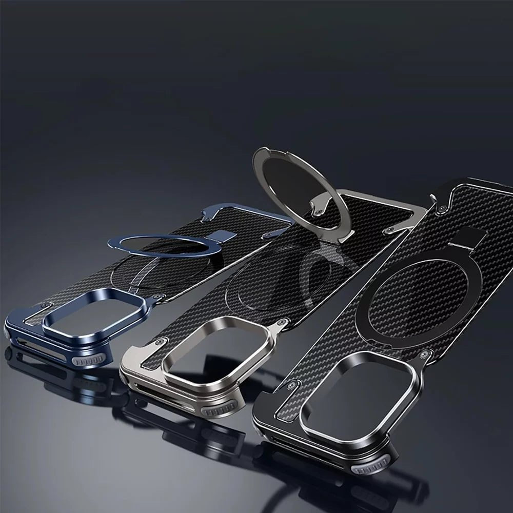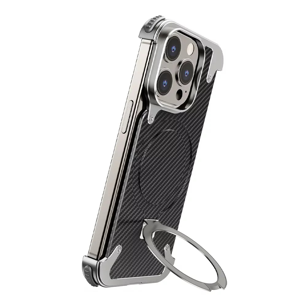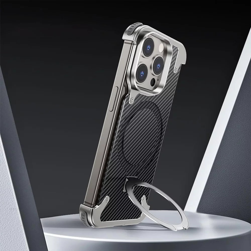 • Introducing the EdgeX CarbonShield MagSafe iPhone Case, where sophistication meets protection. With a sleek bezelless design and carbon fiber pattern, it offers both style and security. The stronger magnetic lock ensures easy wireless charging on the go, while the shock-absorbing corners provide unmatched drop protection. Its raised metal lens frame and corners safeguard your camera and screen. The integrated stand, reinforced with aerospace-grade aluminum, offers hands-free convenience without bulk. Enjoy the Carbon Design Texture, MagSafe compatibility, and customizable viewing angles. Made from durable Aluminum Metal Alloy, it's resistant to falls and spills. Plus, it's anti-fingerprint, anti-sweat, and anti-oil, keeping your device looking pristine while providing a comfortable grip.