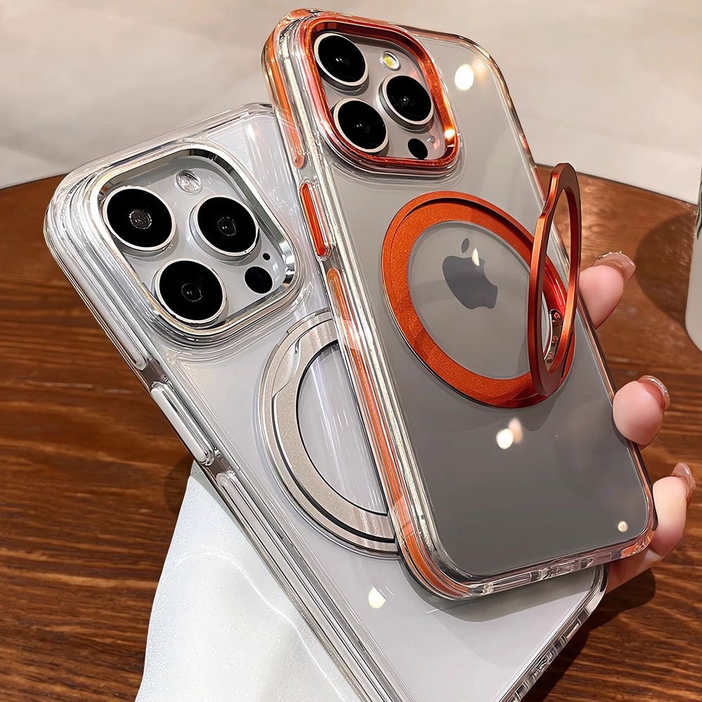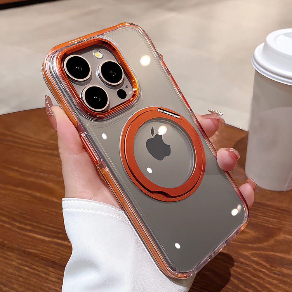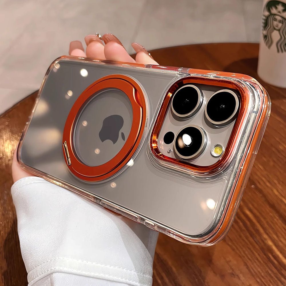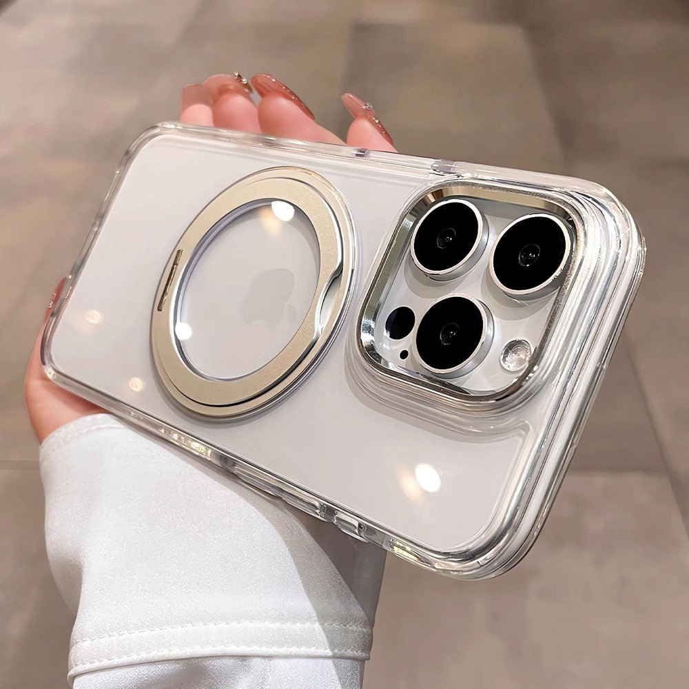 Introducing Fortis MagSafe iPhone Case. This case features a premium metal lens frame and an anti-scratch, anti-wear design, providing top-tier defense for your device while maintaining a sleek, modern look. The innovative high-transparency composite material showcases the original color of your phone, creating a stunning, near-bare-metal aesthetic. The case is engineered with an upgraded 360° rotating stand, allowing for free rotation and hands-free convenience. It is also equipped with a MagSafe smart magnetic ring, ensuring tight, secure charging with seamless magnetic adsorption. For enhanced durability, the case includes a full-screen surround anti-fall strip with military-grade protection, making it more resistant to drops and impacts. The precise craftsmanship ensures a flawless fit, with sensitive, responsive individual buttons and accurate hole alignment.