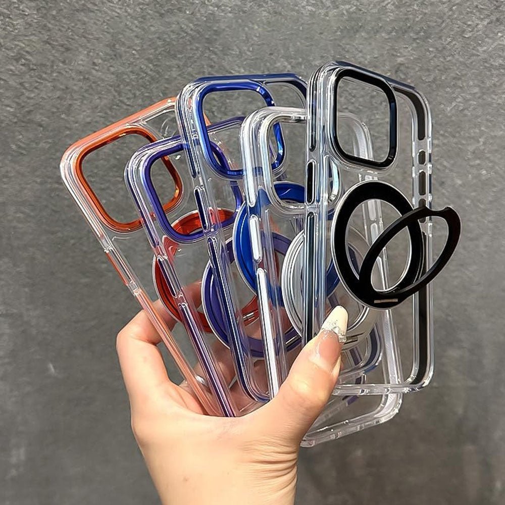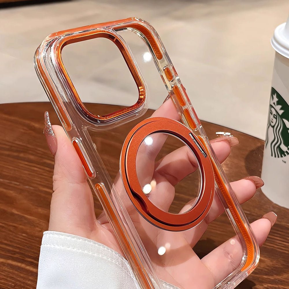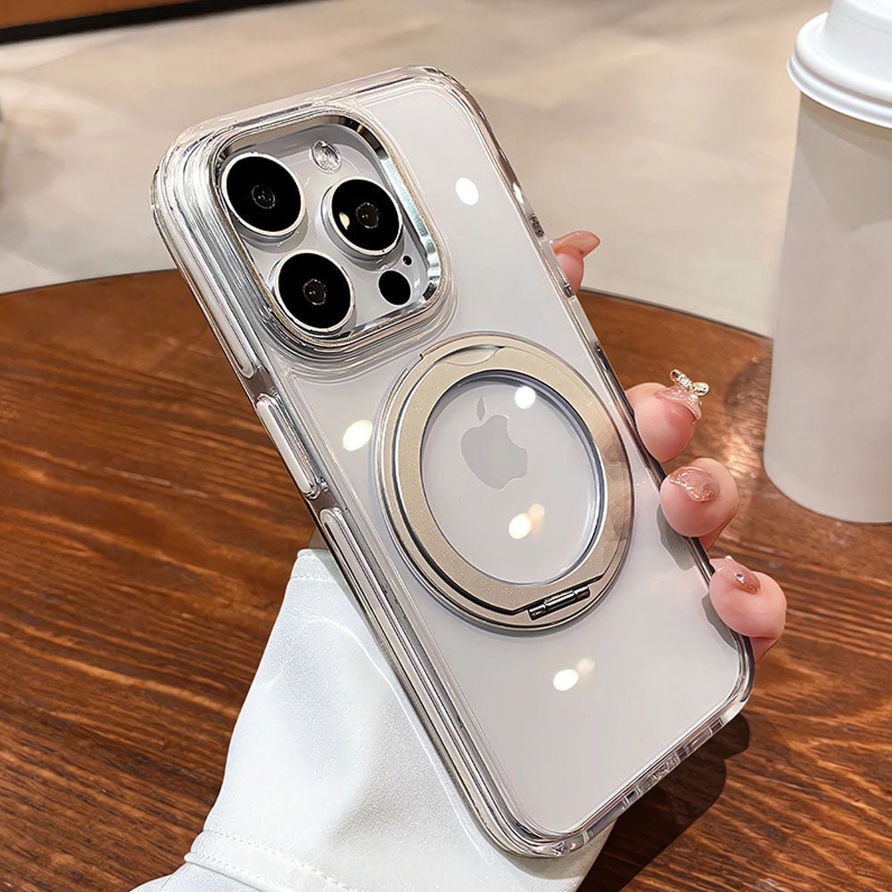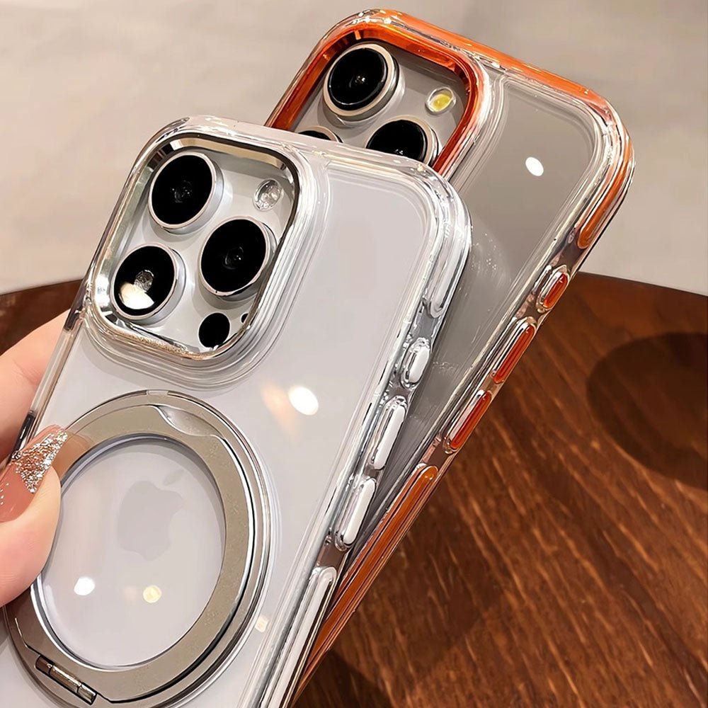 Introducing Fortis MagSafe iPhone Case. This case features a premium metal lens frame and an anti-scratch, anti-wear design, providing top-tier defense for your device while maintaining a sleek, modern look. The innovative high-transparency composite material showcases the original color of your phone, creating a stunning, near-bare-metal aesthetic. The case is engineered with an upgraded 360° rotating stand, allowing for free rotation and hands-free convenience. It is also equipped with a MagSafe smart magnetic ring, ensuring tight, secure charging with seamless magnetic adsorption. For enhanced durability, the case includes a full-screen surround anti-fall strip with military-grade protection, making it more resistant to drops and impacts. The precise craftsmanship ensures a flawless fit, with sensitive, responsive individual buttons and accurate hole alignment.