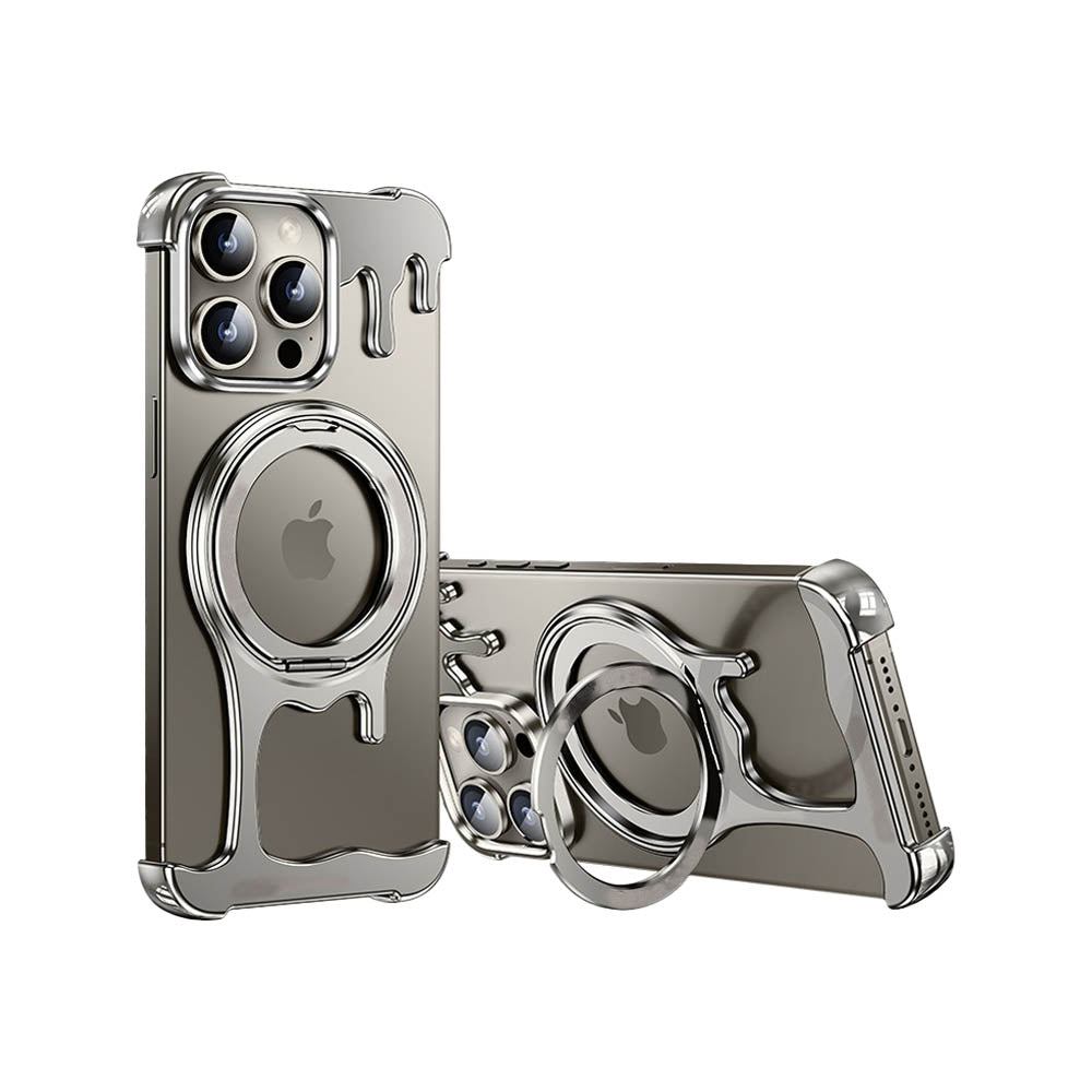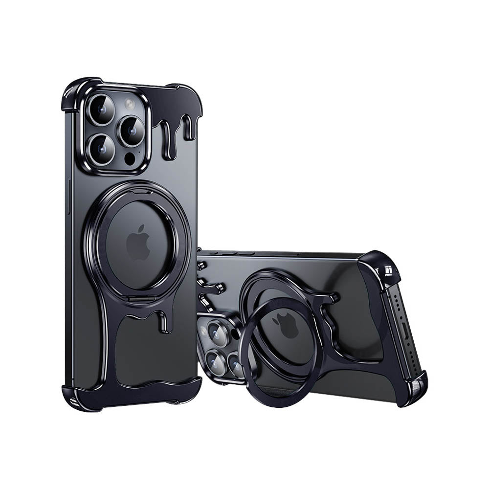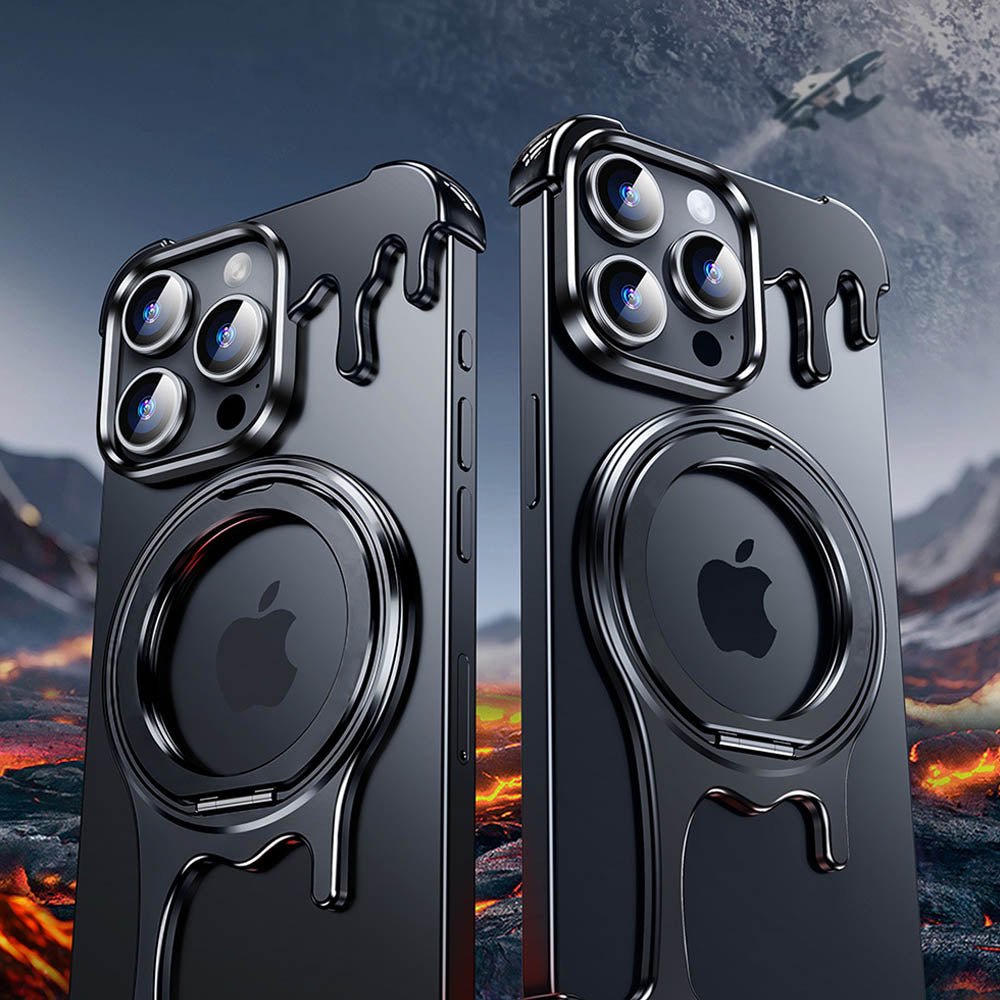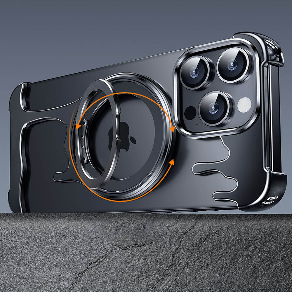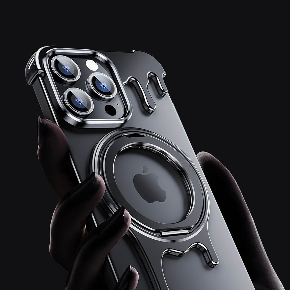 • Introducing the FusionGuard Liquid Metal MagSafe iPhone Case, Crafted from a liquid metal glass shell, this case offers military-grade drop resistance, ensuring your device stays protected while maintaining a smooth, polished finish. This case is designed with borderless heat dissipation, keeping your phone cooler for longer periods. Its strong magnetic attraction allows for seamless compatibility with MagSafe, providing a secure and efficient charging experience. The case also transforms into a 360° rotating stand with a patented ratchet axis mechanism, delivering a stable, hands-free experience. With a metal lens frame and slightly raised edges around both the front and back, the FusionGuard Liquid Metal MagSafe iPhone Case offers exceptional protection against scratches and wear. Whether you need a stylish, skin-friendly feel or robust drop protection, this case empowers you to enjoy both worlds with a naked and borderless experience.