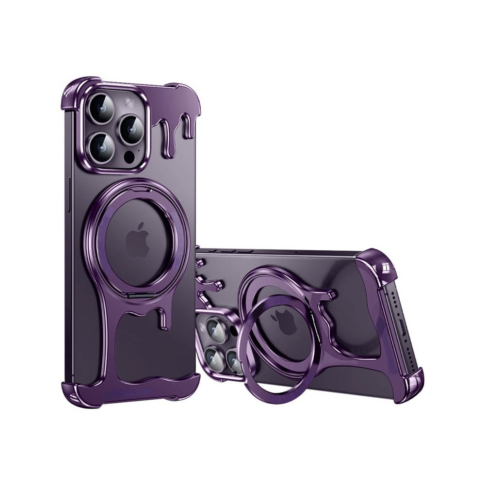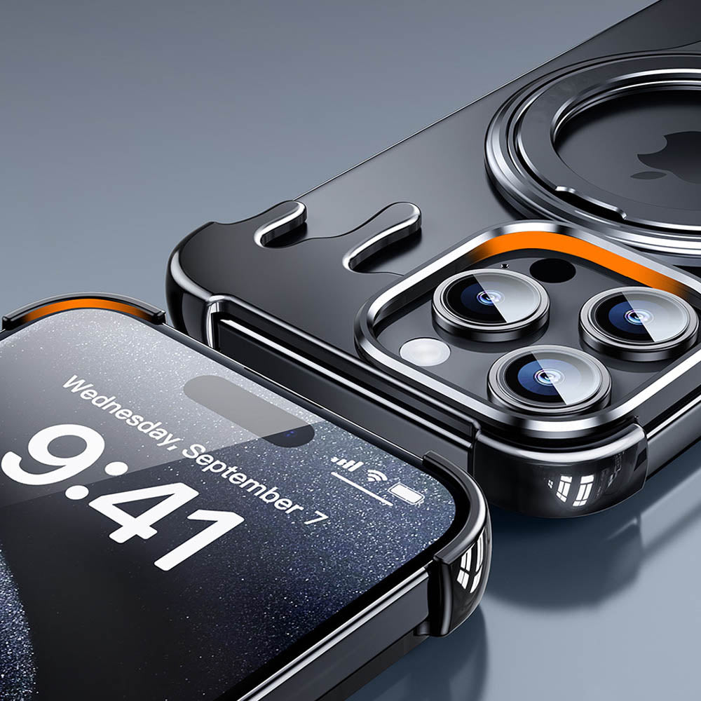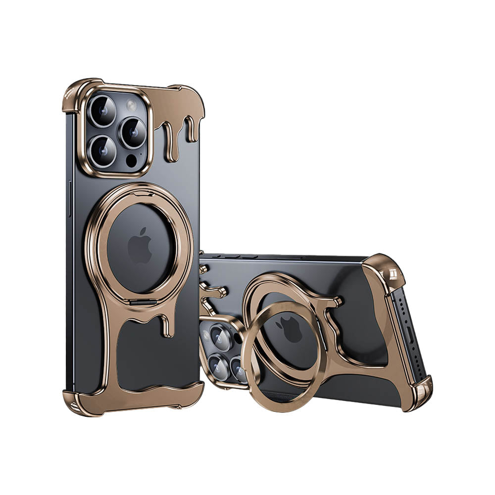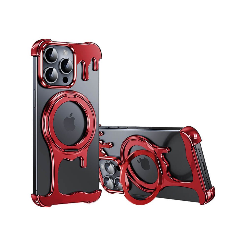 • Introducing the FusionGuard Liquid Metal MagSafe iPhone Case, Crafted from a liquid metal glass shell, this case offers military-grade drop resistance, ensuring your device stays protected while maintaining a smooth, polished finish. This case is designed with borderless heat dissipation, keeping your phone cooler for longer periods. Its strong magnetic attraction allows for seamless compatibility with MagSafe, providing a secure and efficient charging experience. The case also transforms into a 360° rotating stand with a patented ratchet axis mechanism, delivering a stable, hands-free experience. With a metal lens frame and slightly raised edges around both the front and back, the FusionGuard Liquid Metal MagSafe iPhone Case offers exceptional protection against scratches and wear. Whether you need a stylish, skin-friendly feel or robust drop protection, this case empowers you to enjoy both worlds with a naked and borderless experience.