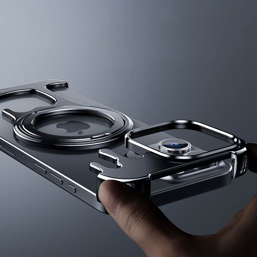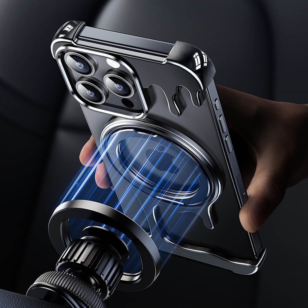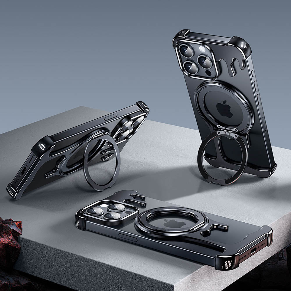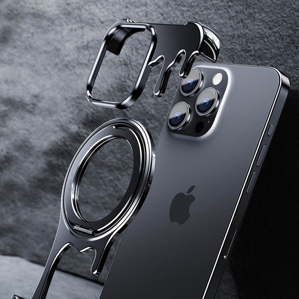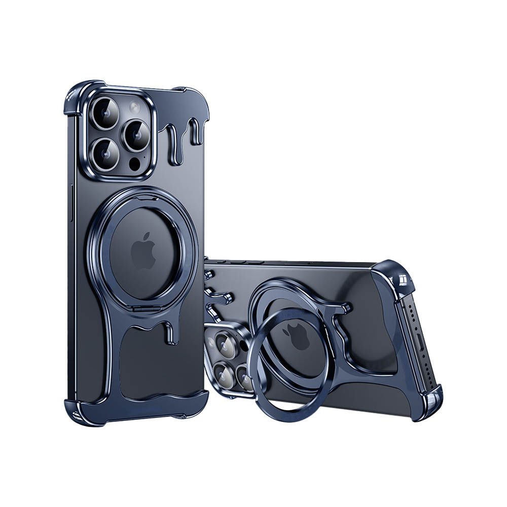 • Introducing the FusionGuard Liquid Metal MagSafe iPhone Case, Crafted from a liquid metal glass shell, this case offers military-grade drop resistance, ensuring your device stays protected while maintaining a smooth, polished finish. This case is designed with borderless heat dissipation, keeping your phone cooler for longer periods. Its strong magnetic attraction allows for seamless compatibility with MagSafe, providing a secure and efficient charging experience. The case also transforms into a 360° rotating stand with a patented ratchet axis mechanism, delivering a stable, hands-free experience. With a metal lens frame and slightly raised edges around both the front and back, the FusionGuard Liquid Metal MagSafe iPhone Case offers exceptional protection against scratches and wear. Whether you need a stylish, skin-friendly feel or robust drop protection, this case empowers you to enjoy both worlds with a naked and borderless experience.