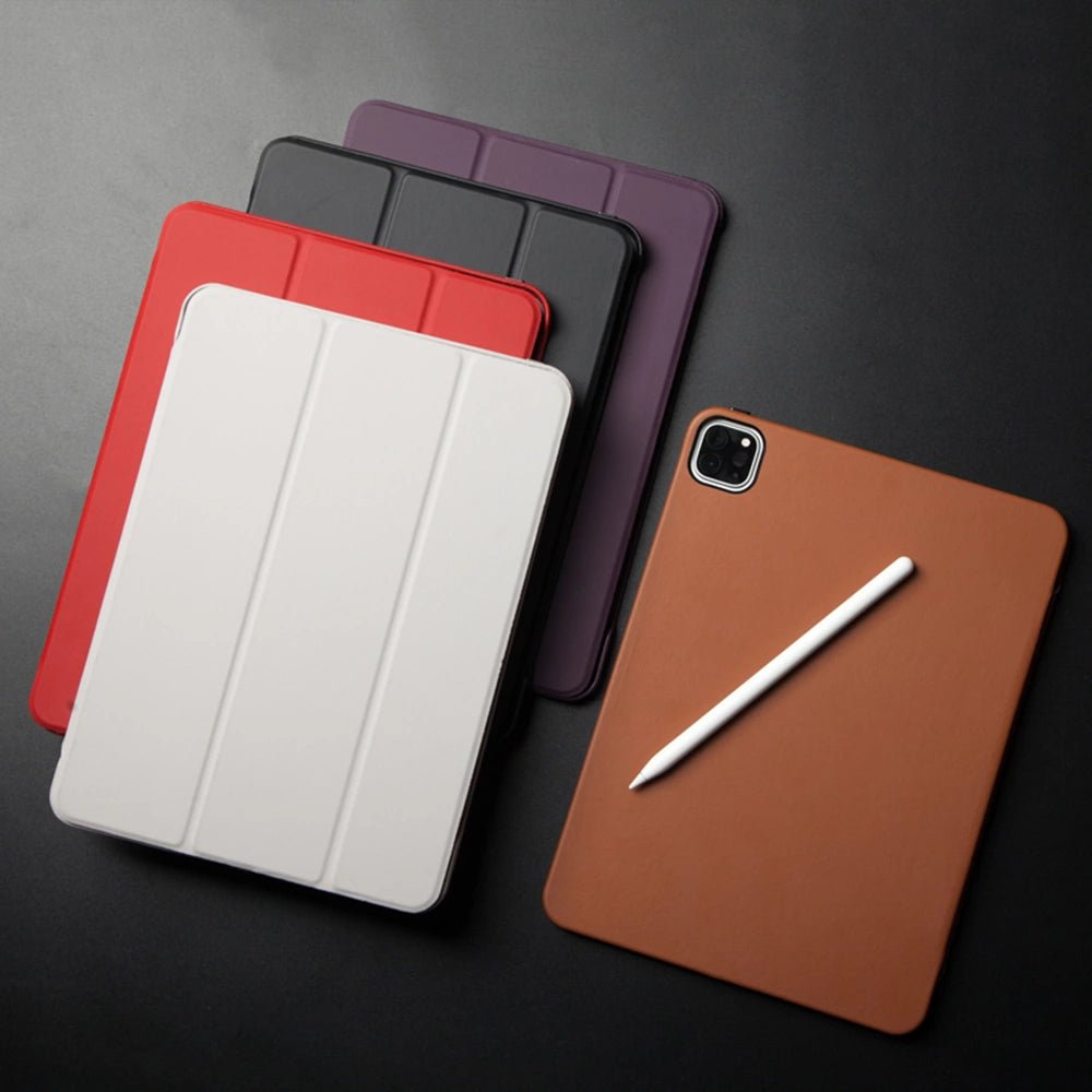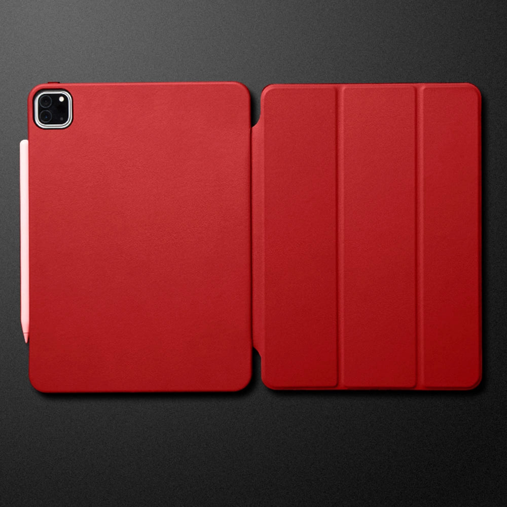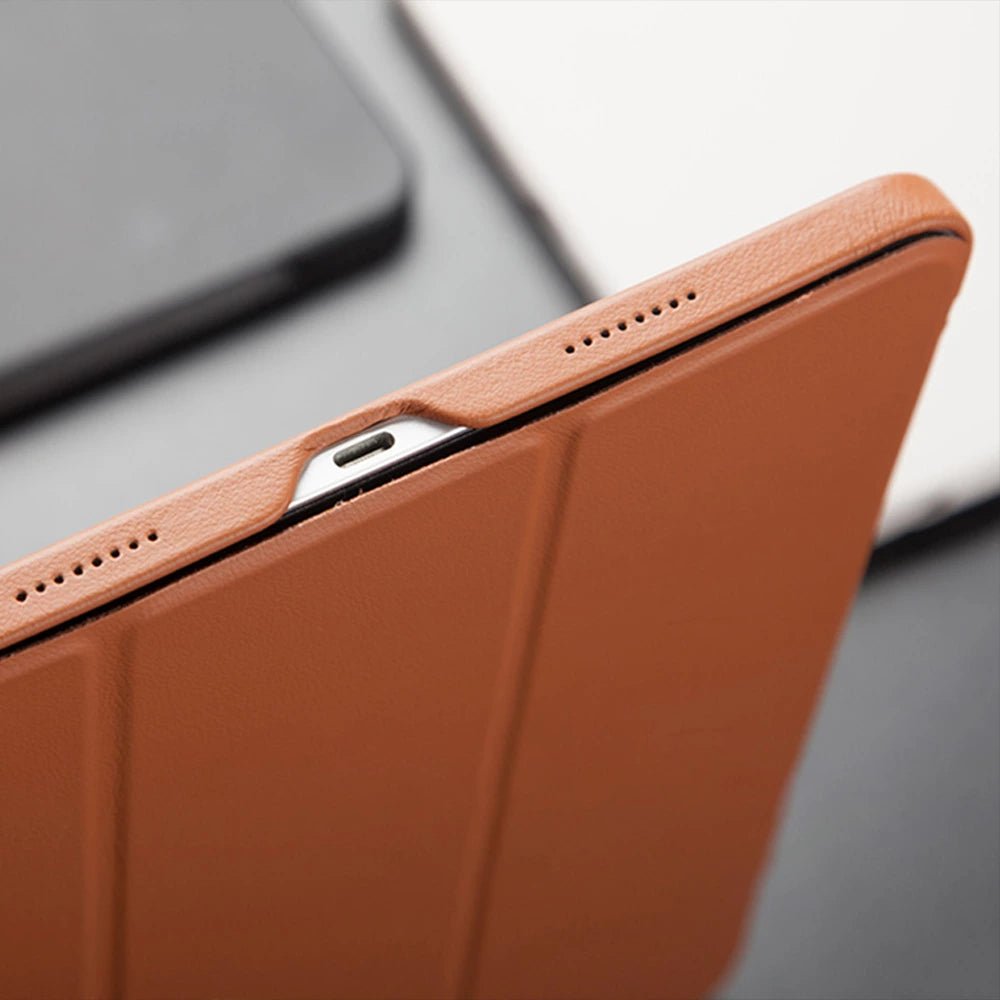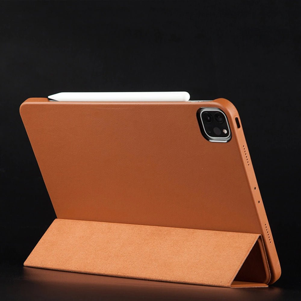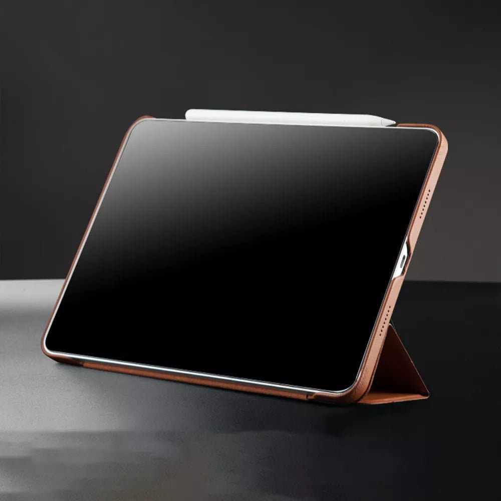 • Introducing the Genuine Leather ProSnap iPad Case—crafted from premium Genuine leather, it combines elegance with durability. This high-quality case features a versatile stand function, allowing you to easily switch between a vertical and portrait displays. It includes a built-in screen protector to safeguard against scratches and drops, while precise cutouts provide seamless access to all ports, buttons, and features. The case supports Apple Pencil adsorption for effortless charging and pairing, and its auto sleep/wake function helps conserve battery life by activating and deactivating your iPad automatically. The foldable, flexible design offers robust protection without compromising style, making the Genuine Leather ProSnap iPad Case the perfect blend of sophistication and functionality for your iPad.