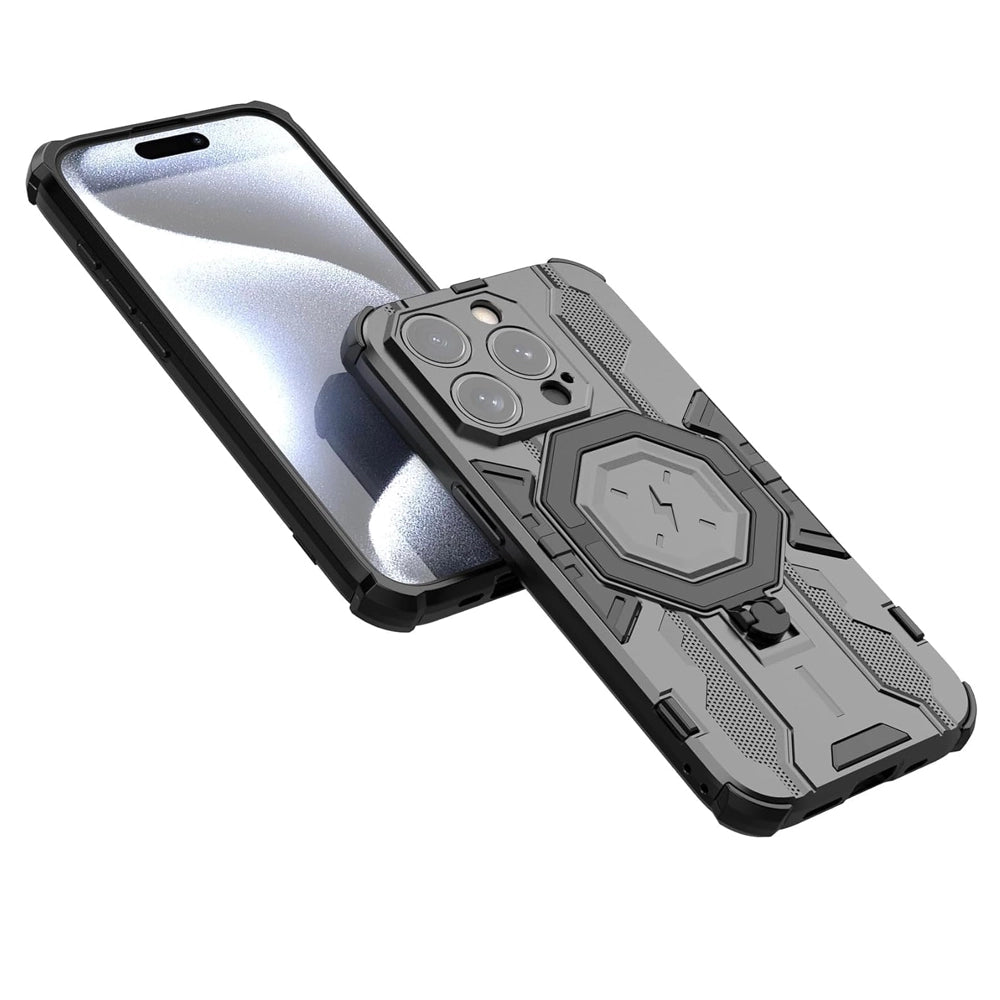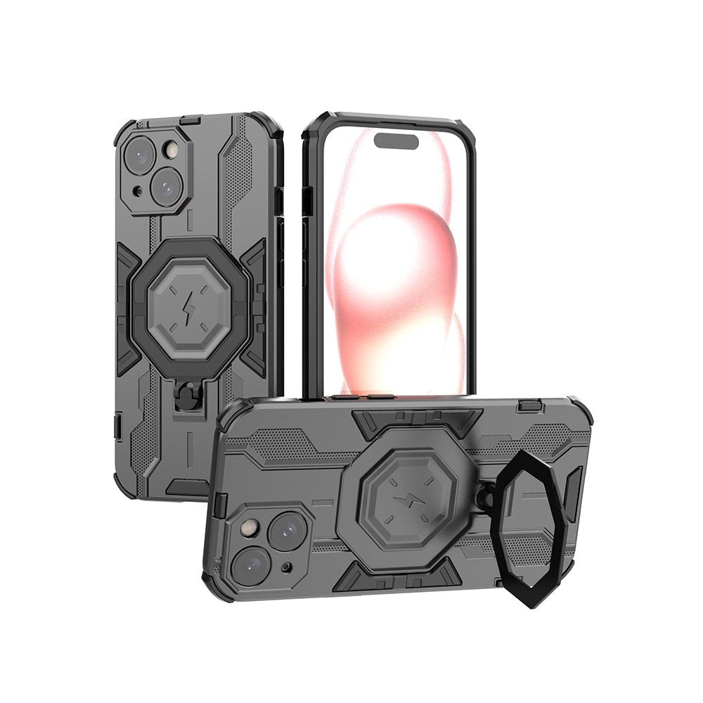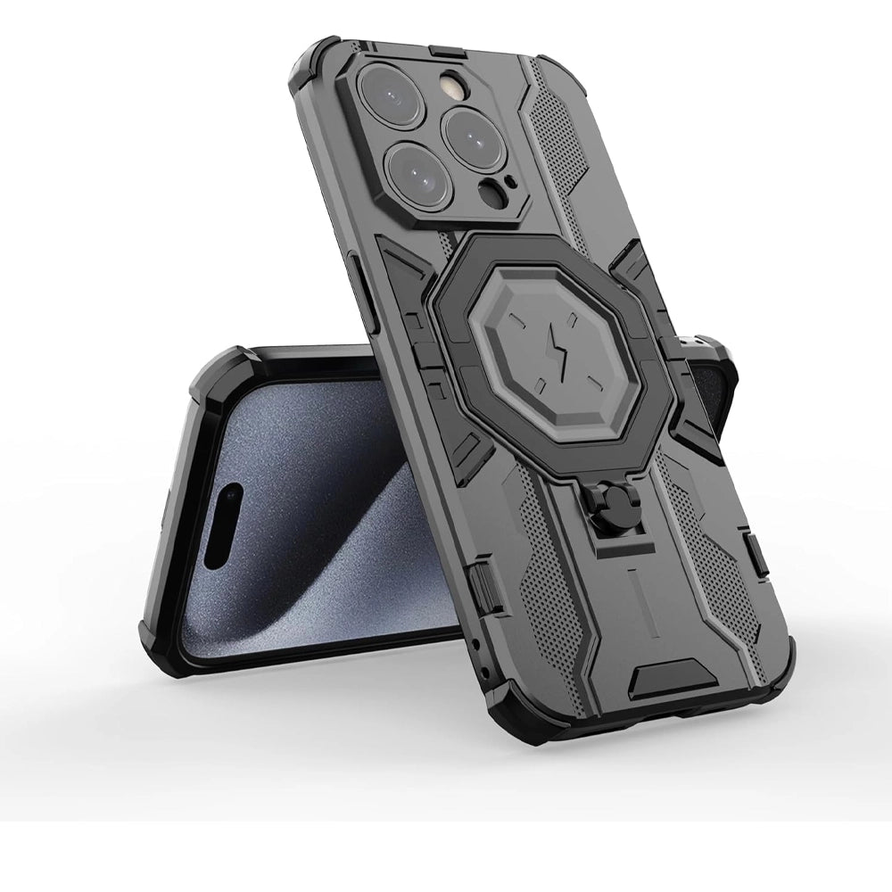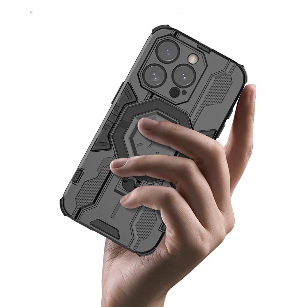 • The HexLink Stealth MagSafe iPhone Case combines a stand ring, sonic armor, and skin-friendly materials for ultimate protection and style. This case is not just fall-proof—it's cool, featuring an anti-fingerprint coating, anti-slip, and anti-sweat properties. Built with elastic TPU and hard PC materials, the HexLink Stealth is scratch-resistant, and impact-cushioning with four-corner airbags. The non-sensitive metal ring bracket offers 360° rotation, allowing you to switch between horizontal and vertical modes effortlessly. With elevated lens and screen protection, wireless charging compatibility, and a finger ring for added convenience, this case ensures your iPhone is both protected and stylish.