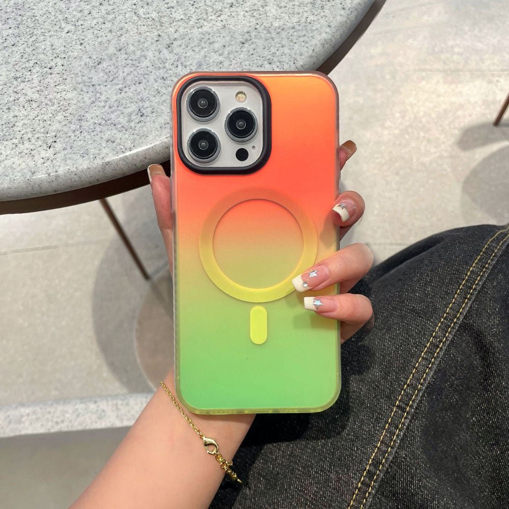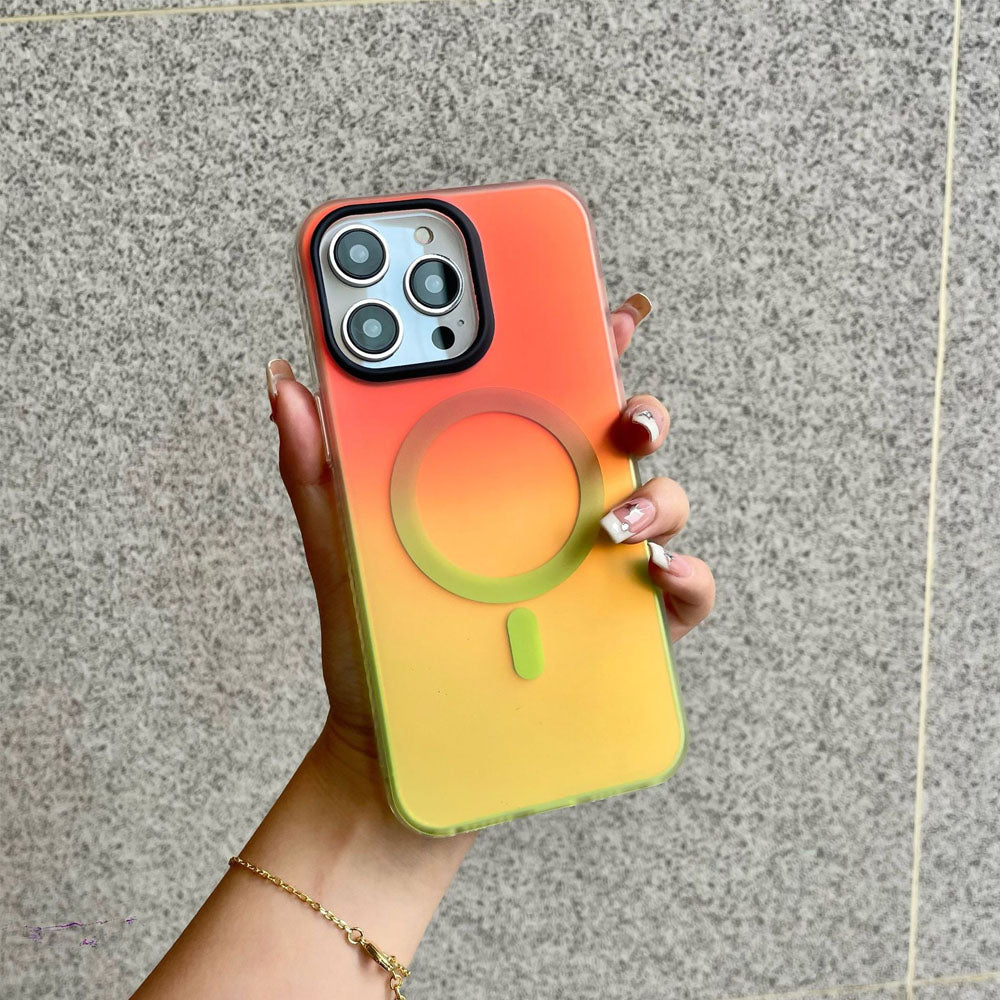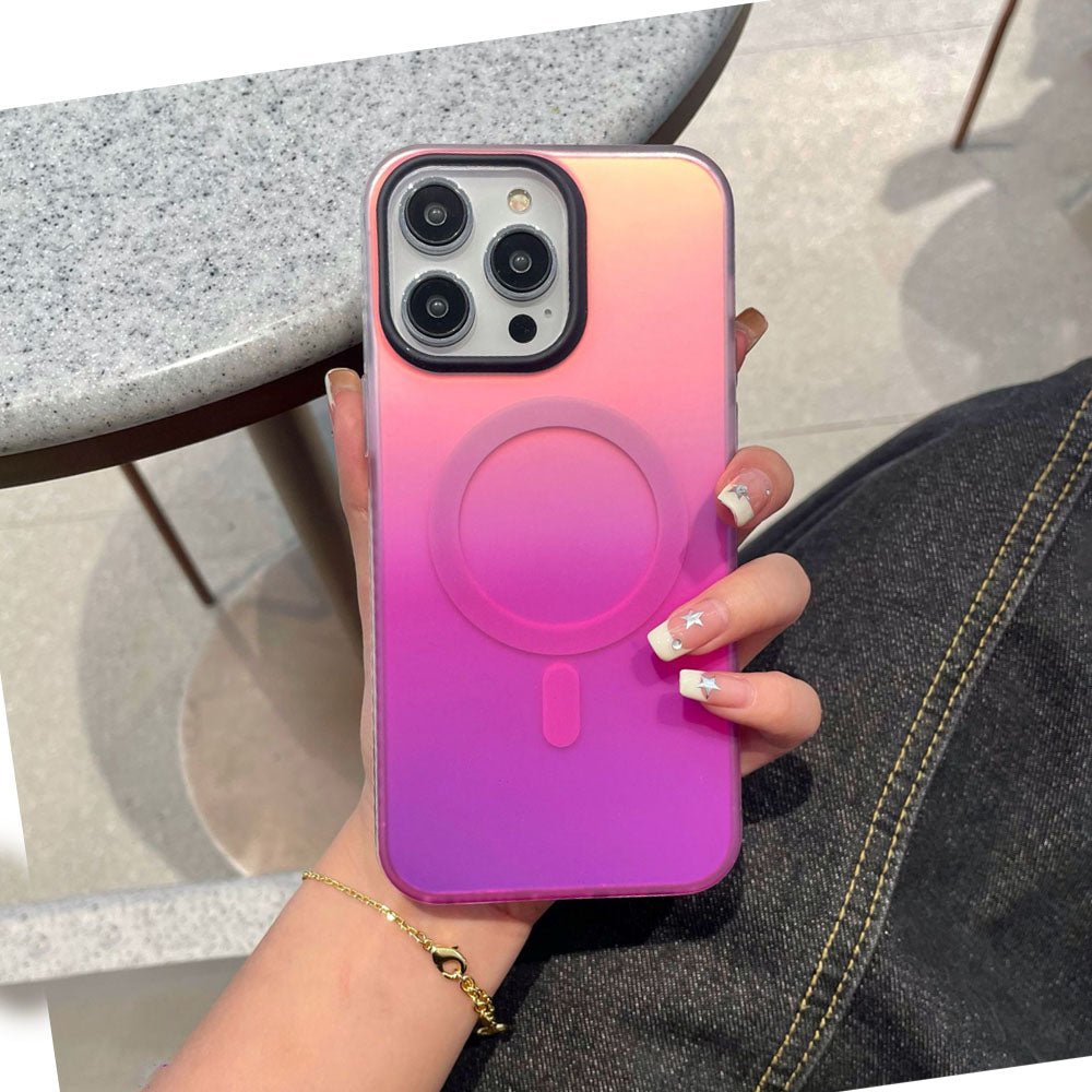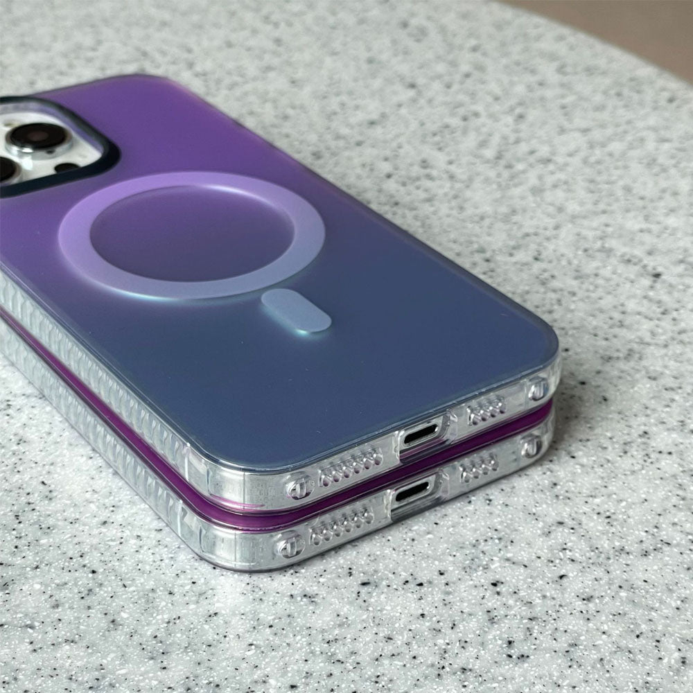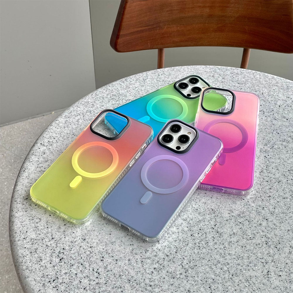 • Introducing the NeonShield MagSafe iPhone Case – case is made from durable Silicone material with a frosted finish, combining aesthetics with functionality. It comes in vibrant gradient color options, providing a fresh, eye-catching look while maintaining a sleek, minimalist appeal. The case is equipped with a MagSafe-compatible magnetic ring for secure and efficient wireless charging, ensuring your device stays powered without the hassle of cables. The shockproof design offers robust protection against drops and scratches, keeping your phone safe from everyday wear and tear.