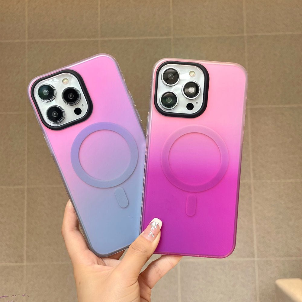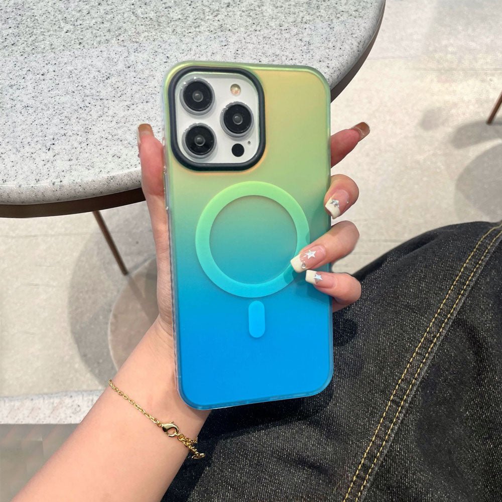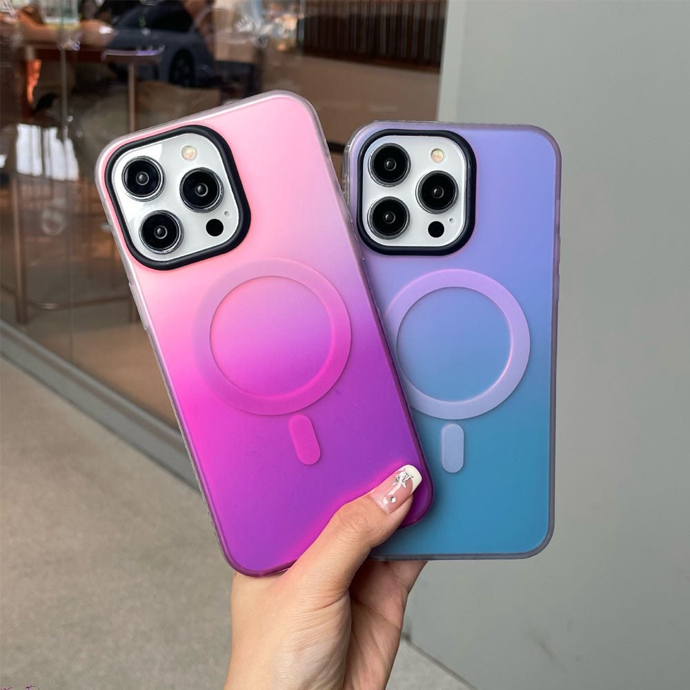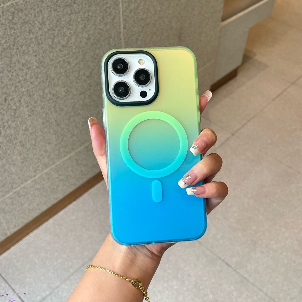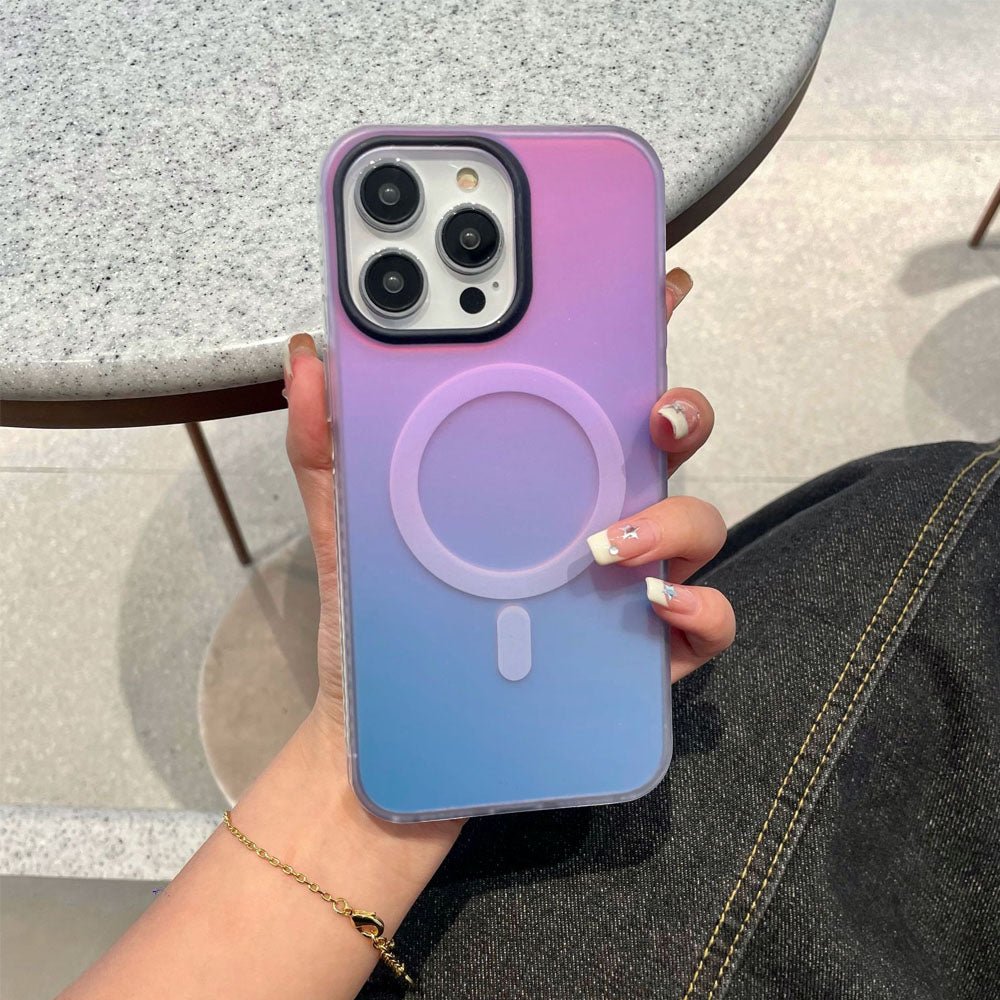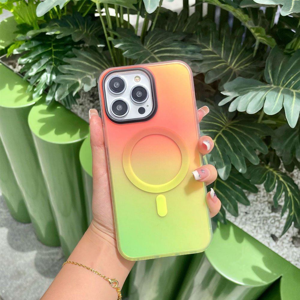 • Introducing the NeonShield MagSafe iPhone Case – case is made from durable Silicone material with a frosted finish, combining aesthetics with functionality. It comes in vibrant gradient color options, providing a fresh, eye-catching look while maintaining a sleek, minimalist appeal. The case is equipped with a MagSafe-compatible magnetic ring for secure and efficient wireless charging, ensuring your device stays powered without the hassle of cables. The shockproof design offers robust protection against drops and scratches, keeping your phone safe from everyday wear and tear.