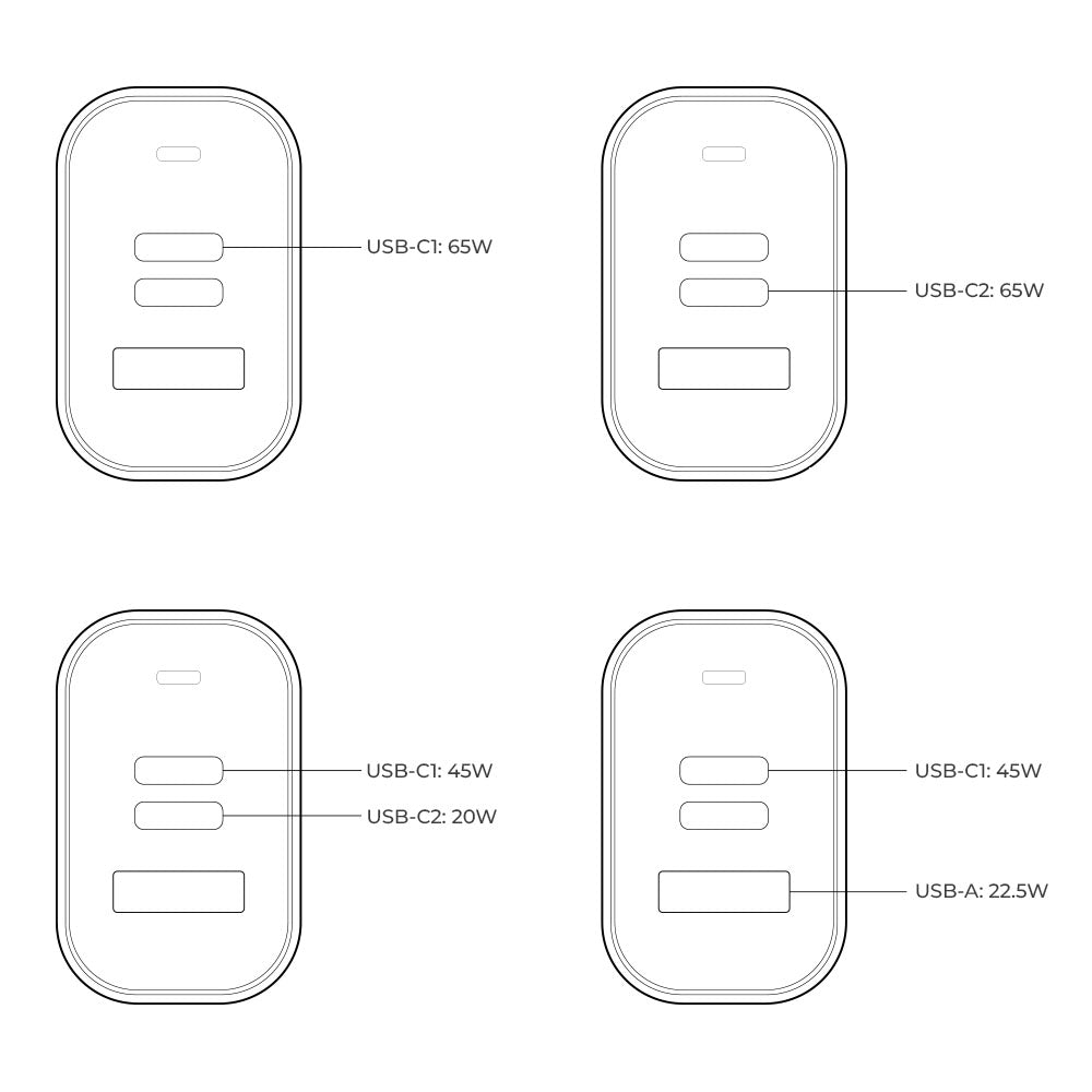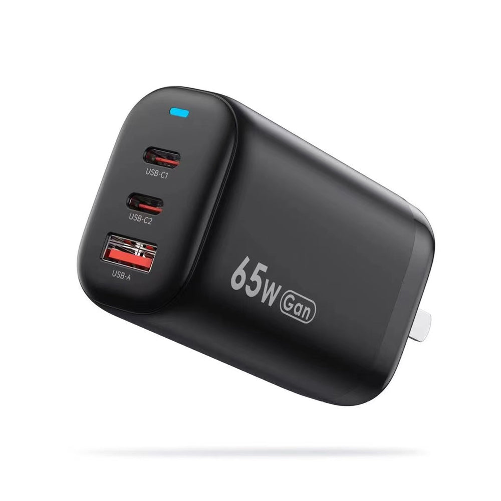 • Introducing the UltraBoost 65W Multi-Port Hub – the perfect solution for charging multiple devices simultaneously. Equipped with two USB-C ports and one USB-A port, it delivers PD and QC fast charging for maximum efficiency. With a robust 65W total power output, this hub quickly powers up your smartphones, tablets, and laptops. Featuring advanced GaN technology, it ensures faster, more efficient charging while minimizing heat. The global voltage compatibility (110-240V AC) and swappable ends make it perfect for international travel, allowing you to easily switch connectors as needed. Its compact and lightweight design guarantees easy portability without sacrificing performance.
